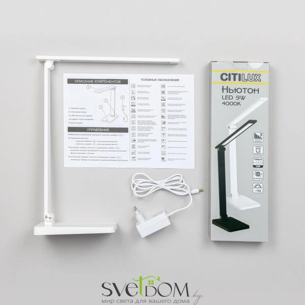 Citilux Ньютон CL803080 Настольный светильник с диммером Белый — Светодиодная настольная лампа Ньютон с регулировкой яркости, USB зарядкой и встроенным таймером выполнена в современном стиле. Основание светильника прямоугольной формы из ударопрочного полимера, стойка и корпус светодио