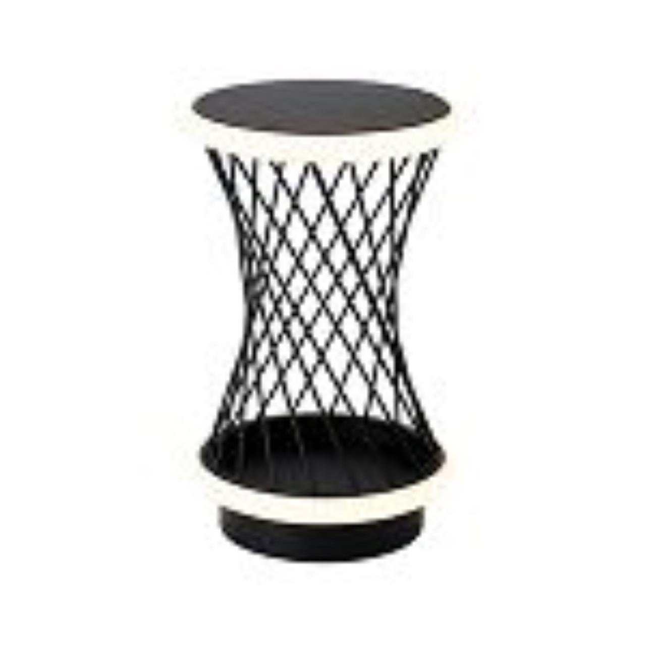 Округлое верхнее и нижнее основание черного цвета, LED-лента, регулируется пультом управления. Плафон - решетка из черных матовых металлических прутик