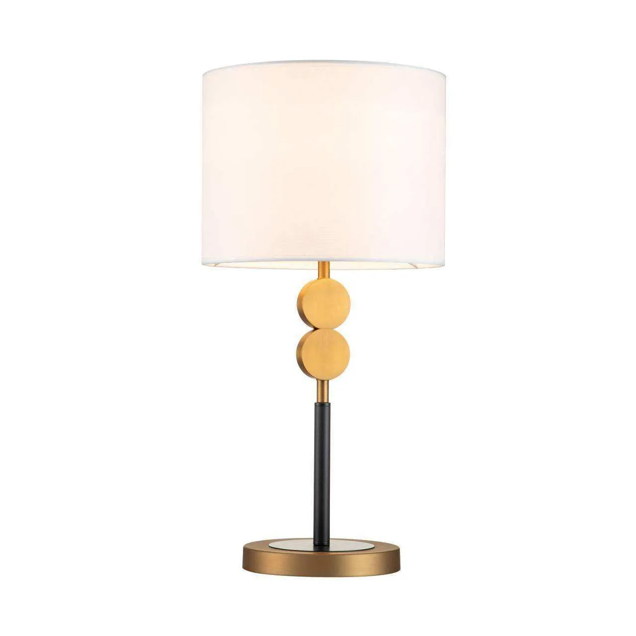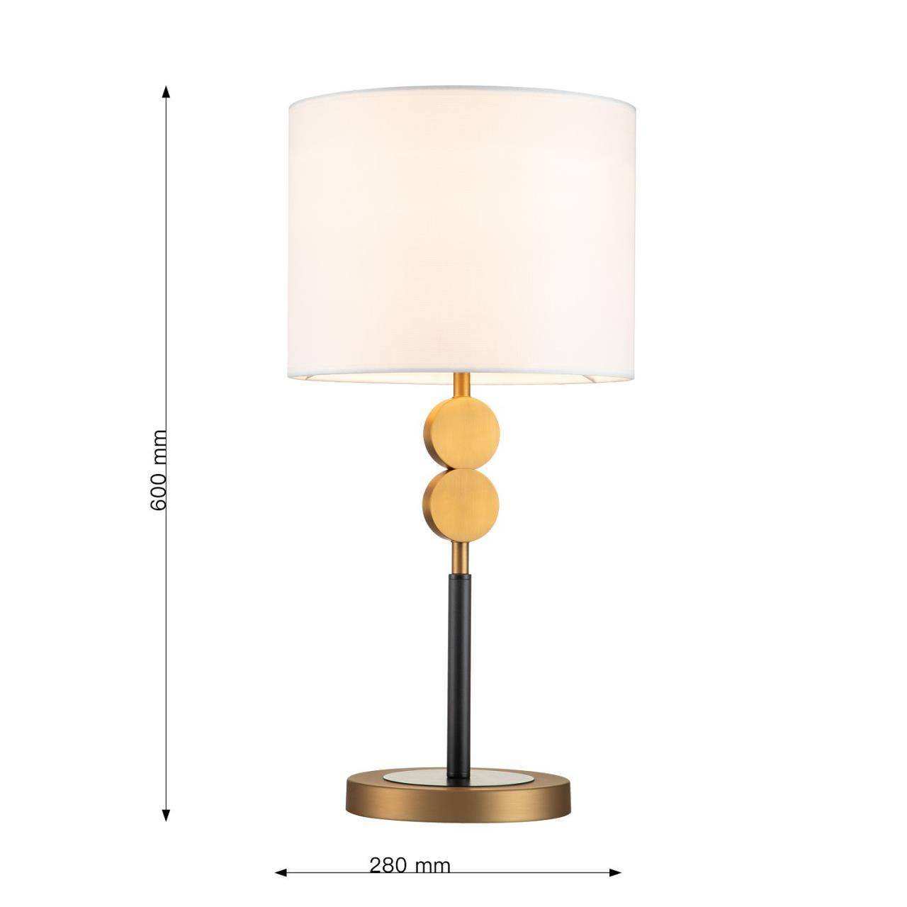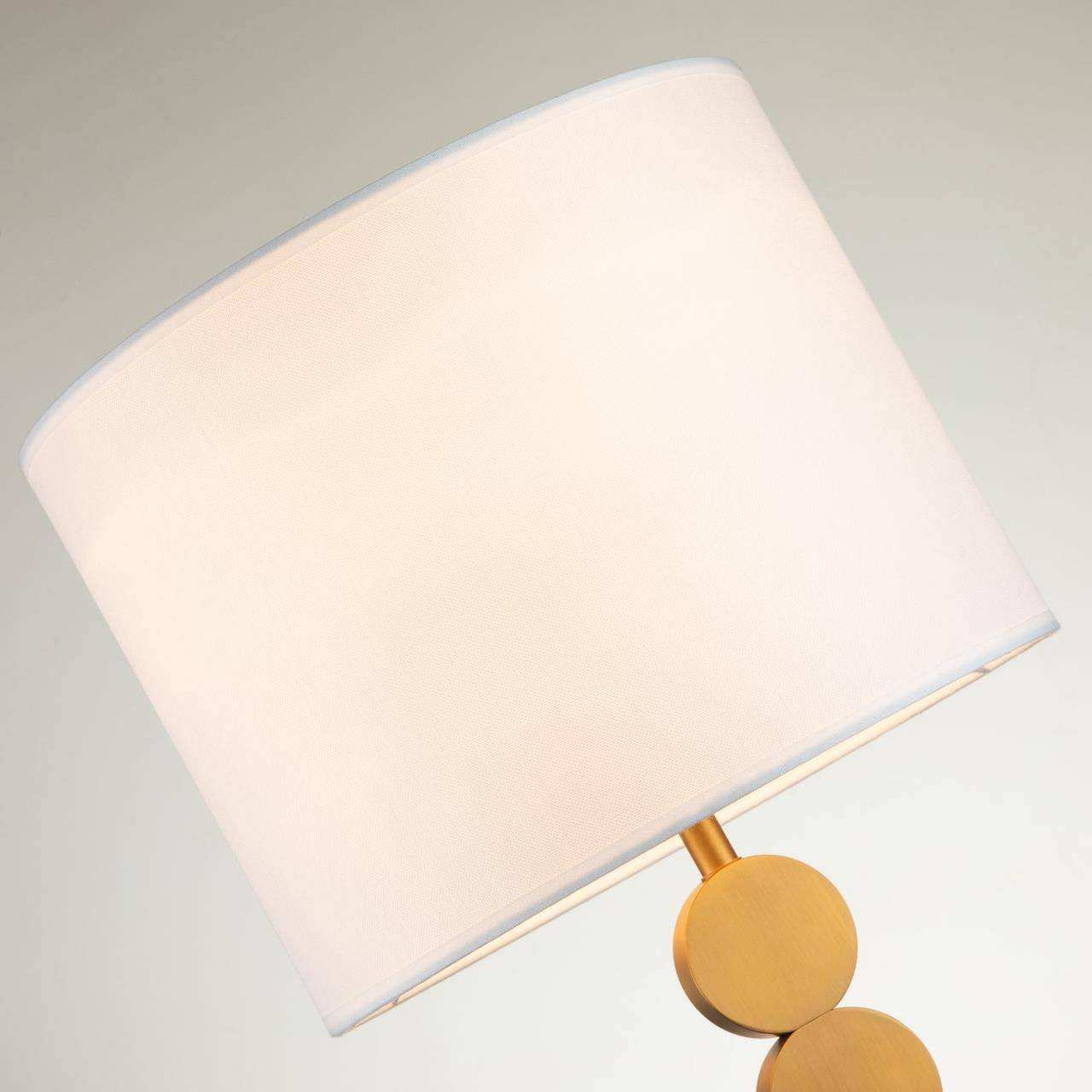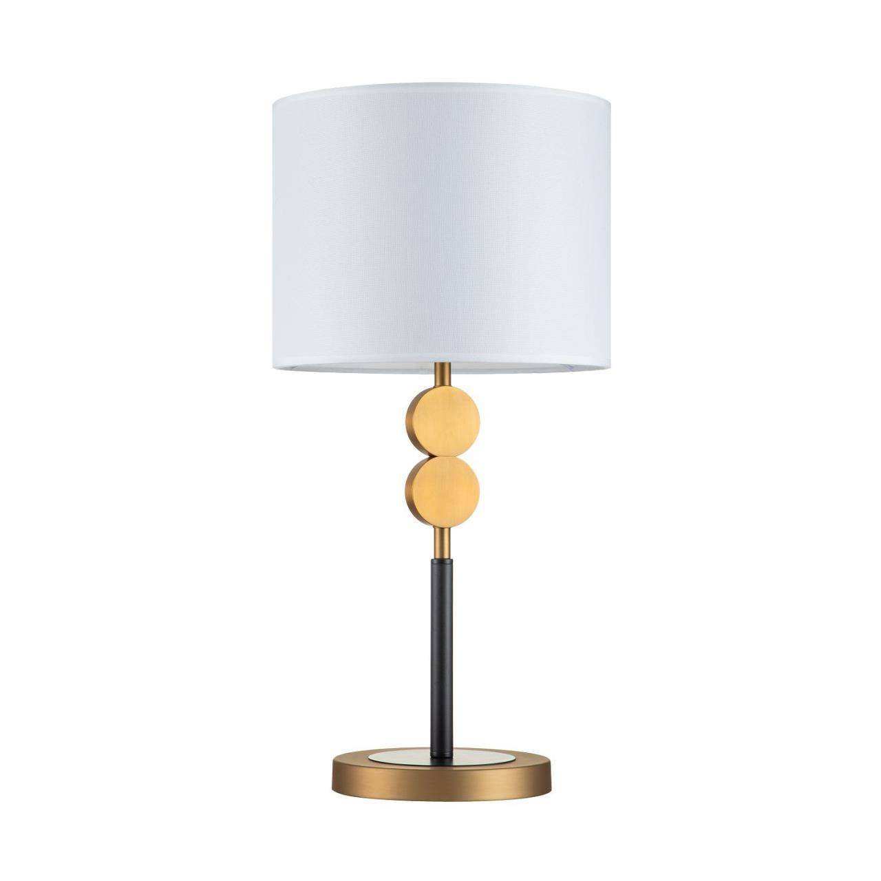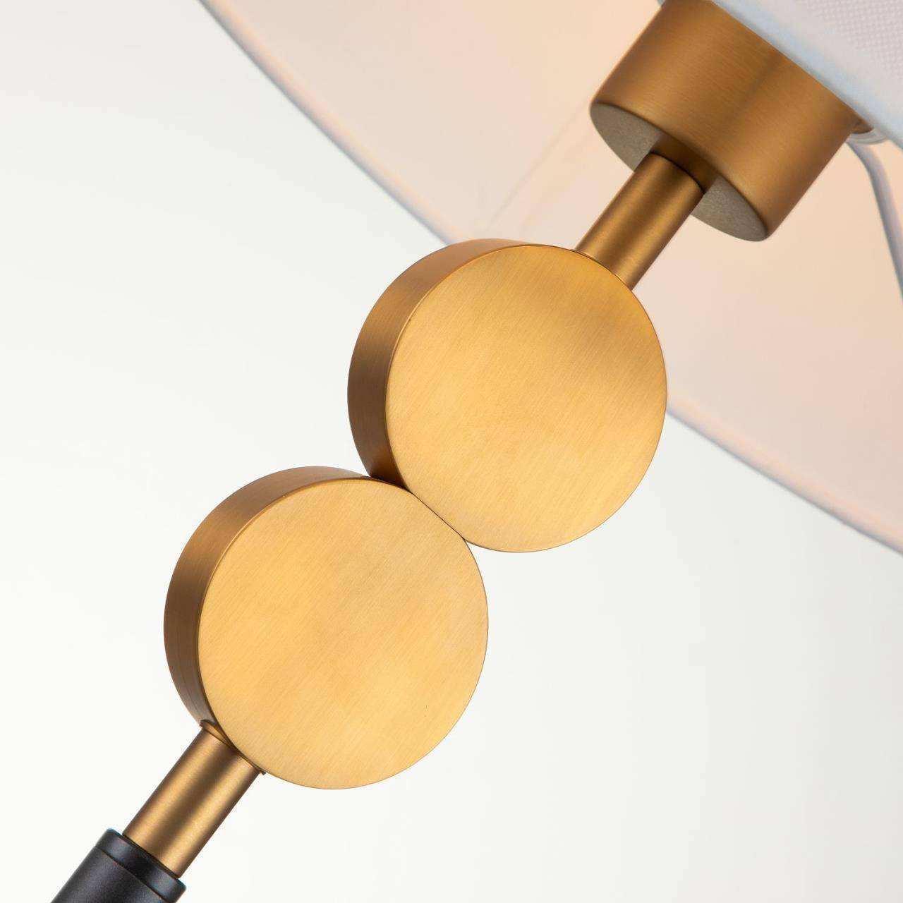 Черный каркас с коричневым основанием, плафон из белой ткани, латунный декоративный элемент в виде двух кругов