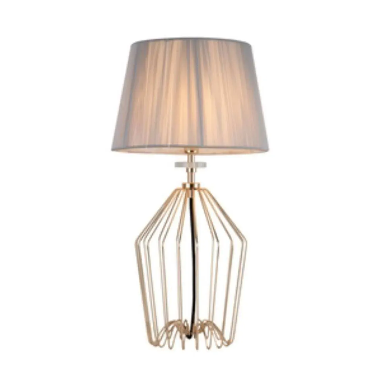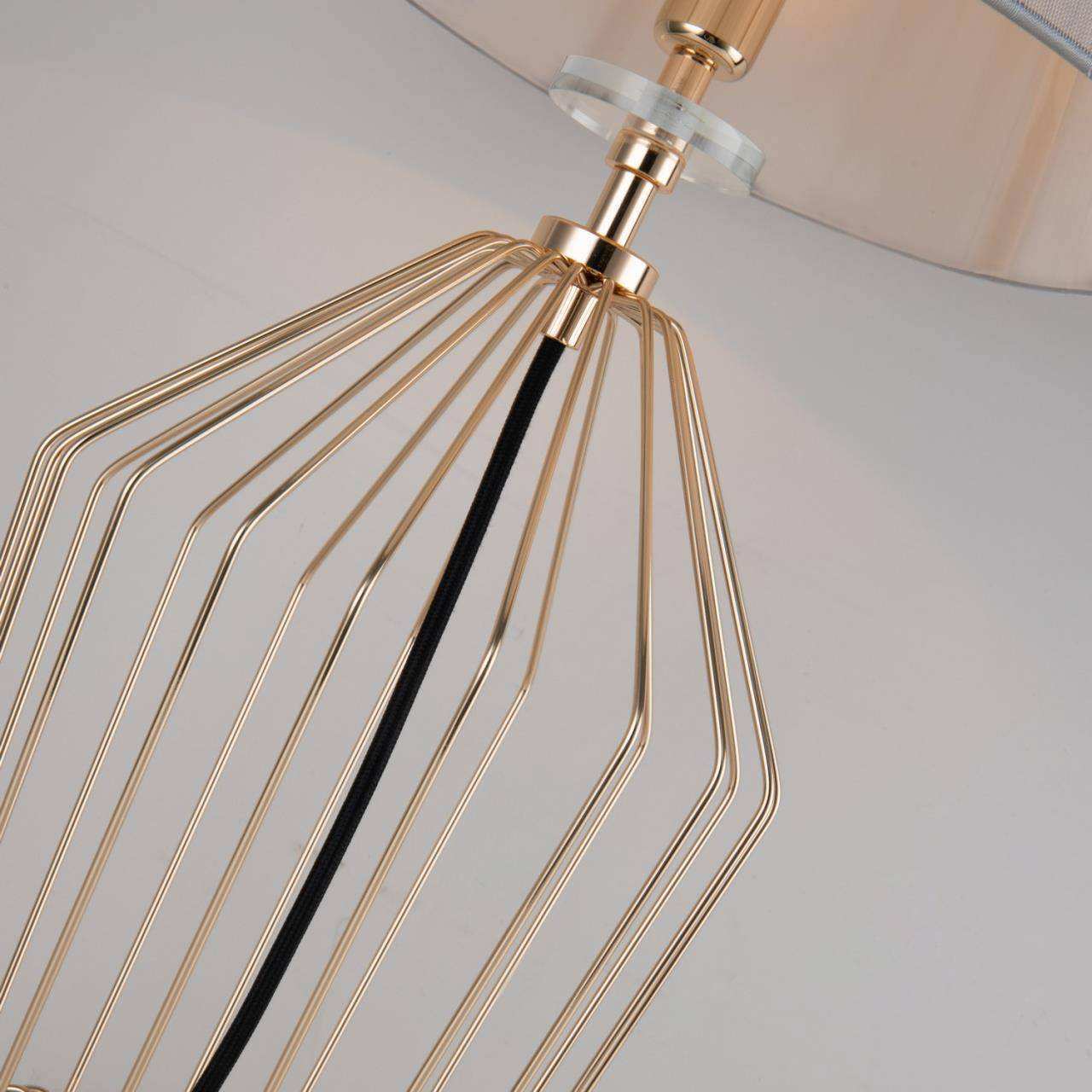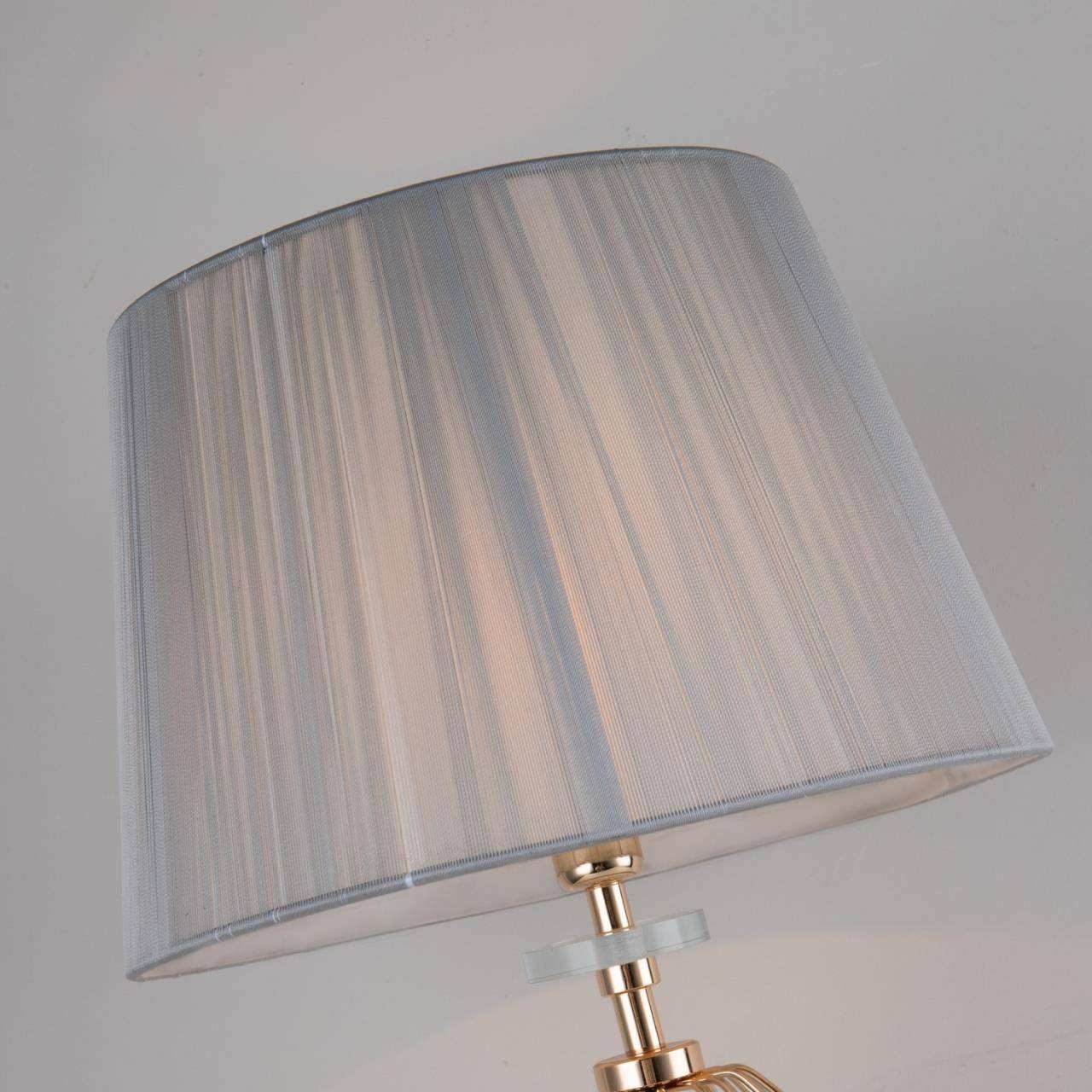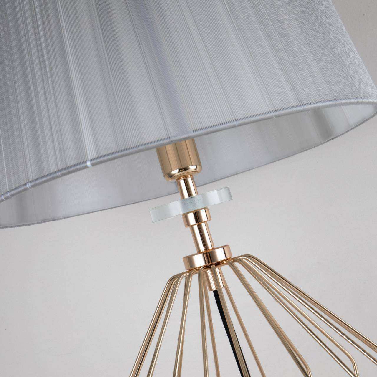 Каркас цвета золотой гальваники, абажур из серой нити, декоративные элементы выполнены из прозрачного стекла