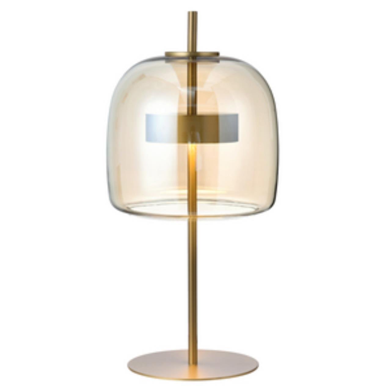 Настольная лампас золотым каркасом и двойным плафоном янтарного цвета, внутри металлический золотой цилиндр с модулем LED