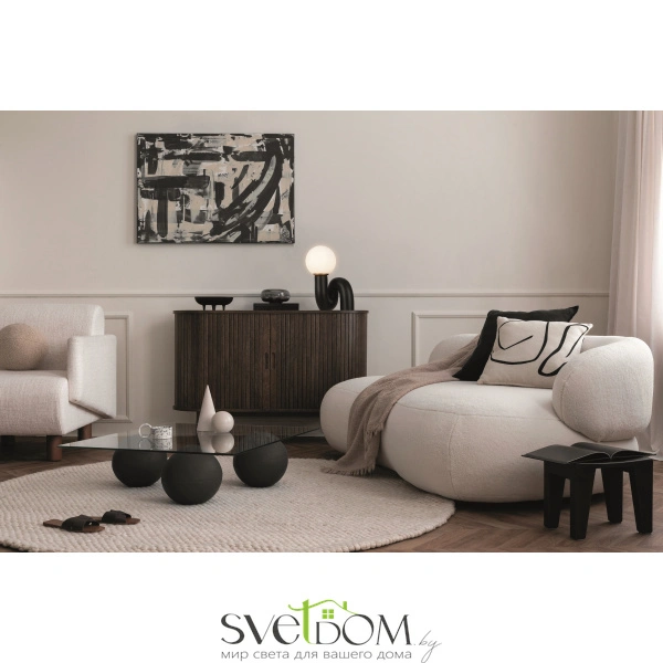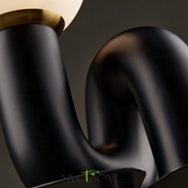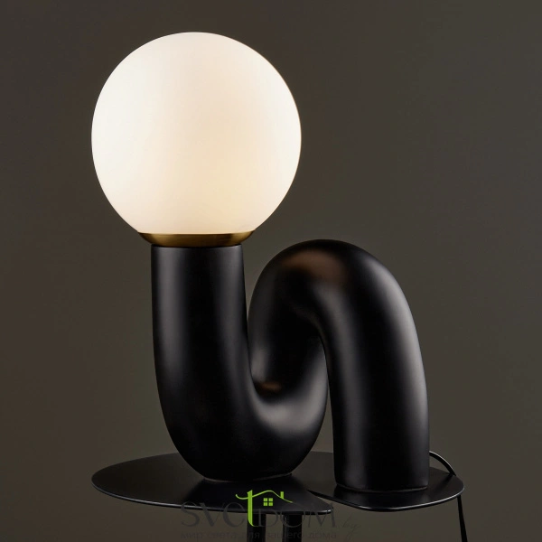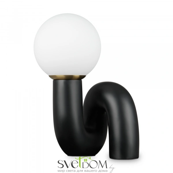 Изогнутое основание светильника выполнено из полирезина, цвет — черный. плафон-сфера из белого матового стекла создает мягкий заливающий свет. дизайн светильника воплощает в себе предмет искусства. источник света — лампа с цоколем e14.