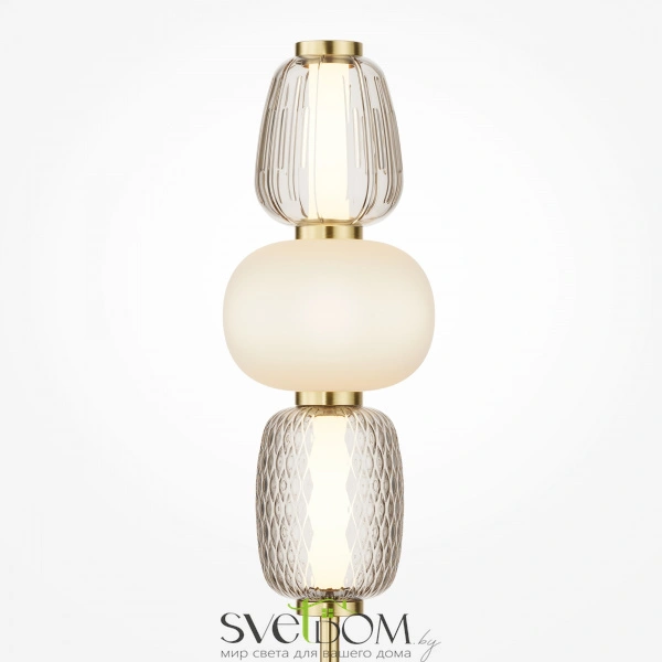Металлическая арматура, цвет - золото, хром. микс плафонов округлых и вытянутых форм из белого матового и прозрачного стекла с сетчатым и с линейным повторяющимся рельефным рисунком. регулируемая высота подвесных моделей, провод - 3 метра. led-источник света, цветовая температура 3000к.
