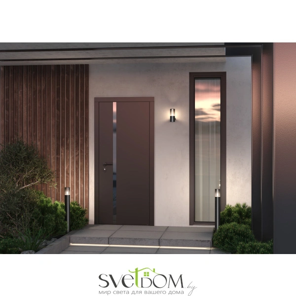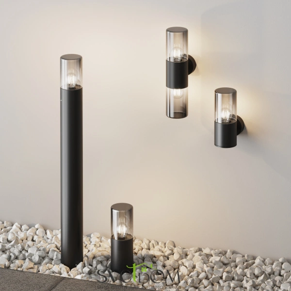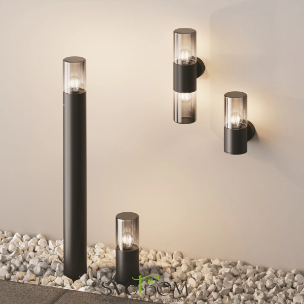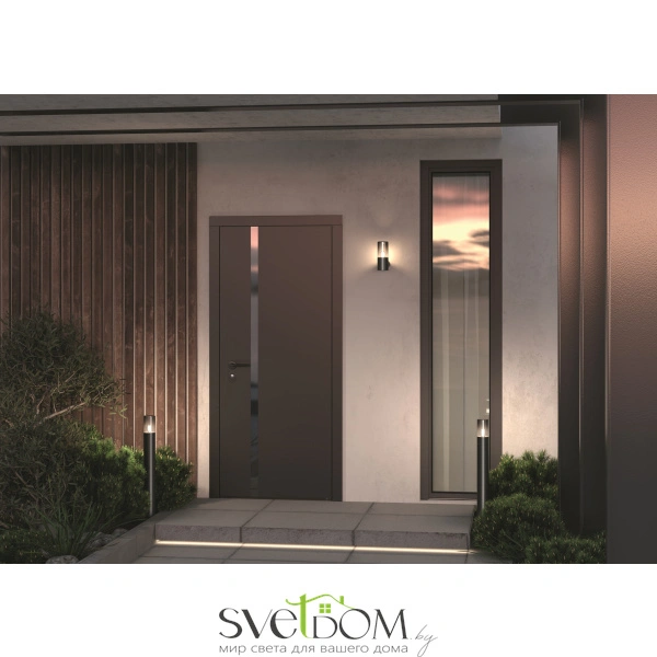 Алюминиевый корпус, цвет - графит. световой элемент - тонированное стекло. источник света - лампа с цоколем е27.  универсальная серия для современных и классических экстерьеров. защита ip54.