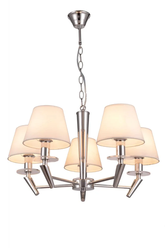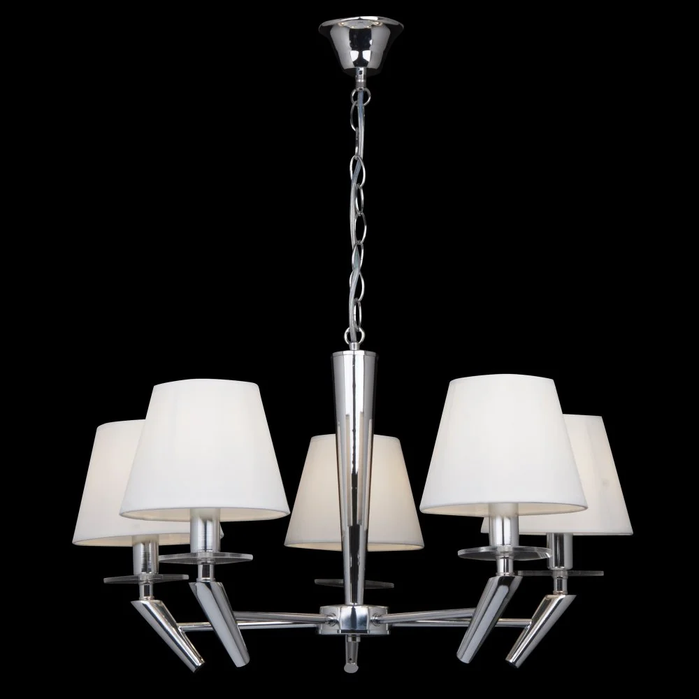 Сочетание белого цвета и серебра делают серию Una идеальным выбором для современного интерьера. Светлые и нарядные светильники словно парят в воздухе. Арматура выполнена из блестящего металла в виде вытянутых конусов. Абажуры - из белого текстиля на ПВХ. Завершают дизайн светильников декоративные розетки из стекла. Благодаря цепи можно регулировать высоту люстр, что позволяет подобрать оптимальное решение для интерьера. Серия состоит из люстр на 5 и 3 рожка и бра.