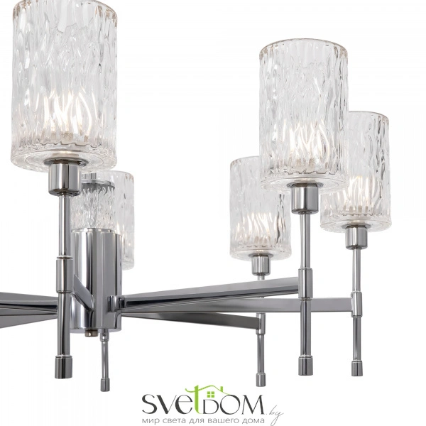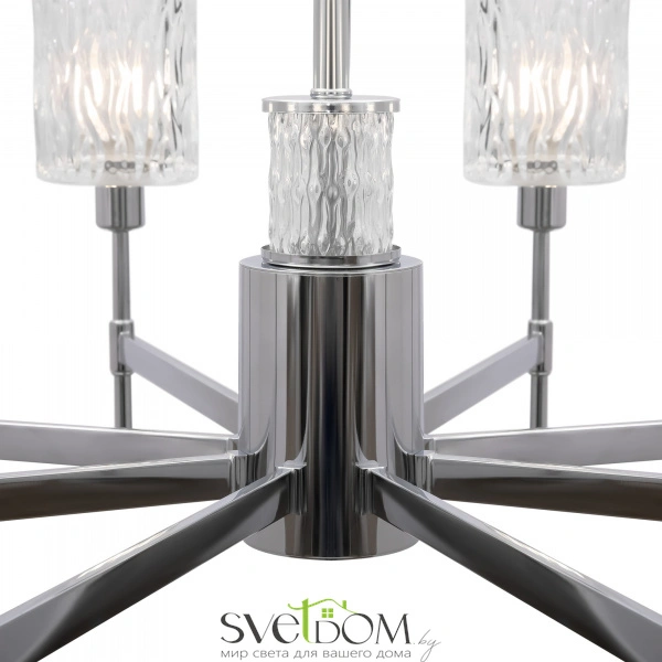 Хромированная металлическая арматура. Плафоны – фактурное прозрачное стекло. В качестве источника света используется лампа с цоколем Е14.