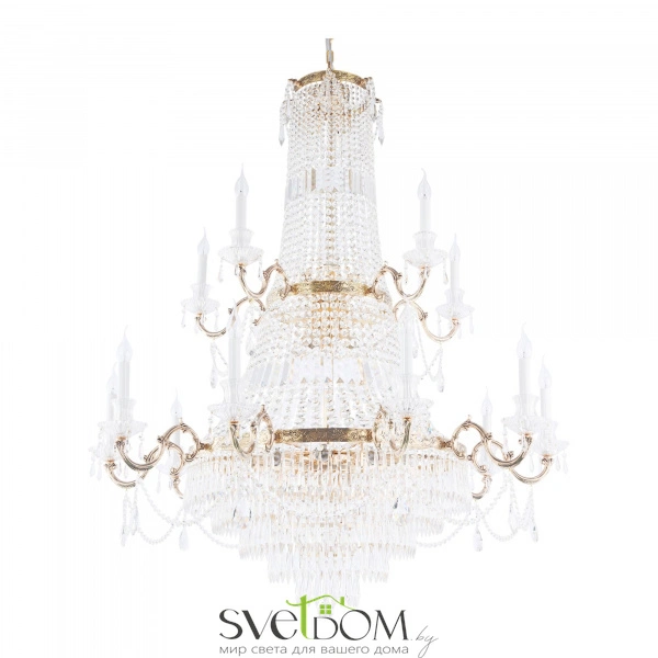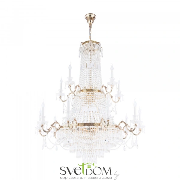 Арматура из металла, цвет – античное золото. Декор металлических элементов – инкрустированный цветочный орнамент. Многоярусные хрустальные подвески скрывают лампы. Часть моделей имеет открытые источники света в виде свечей.