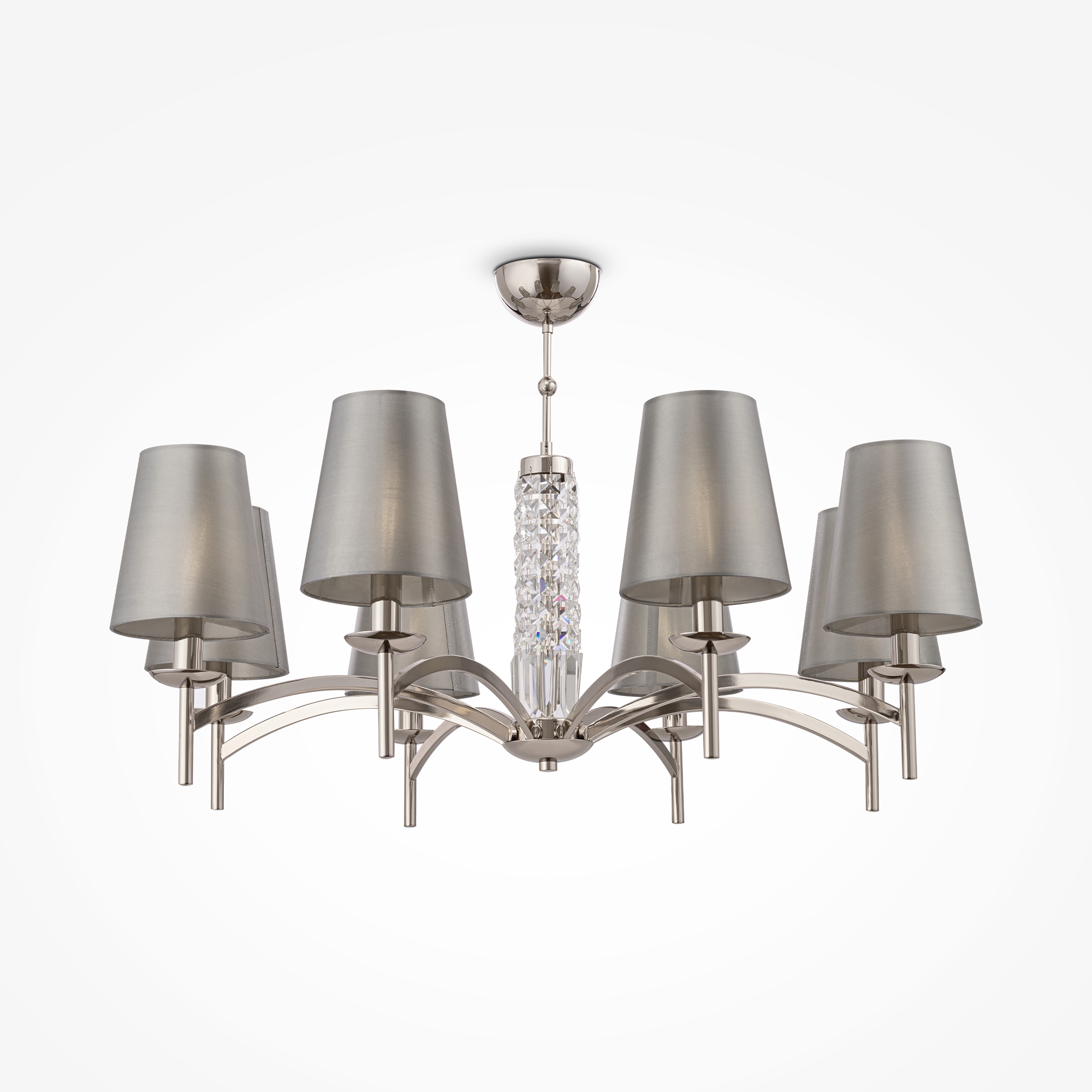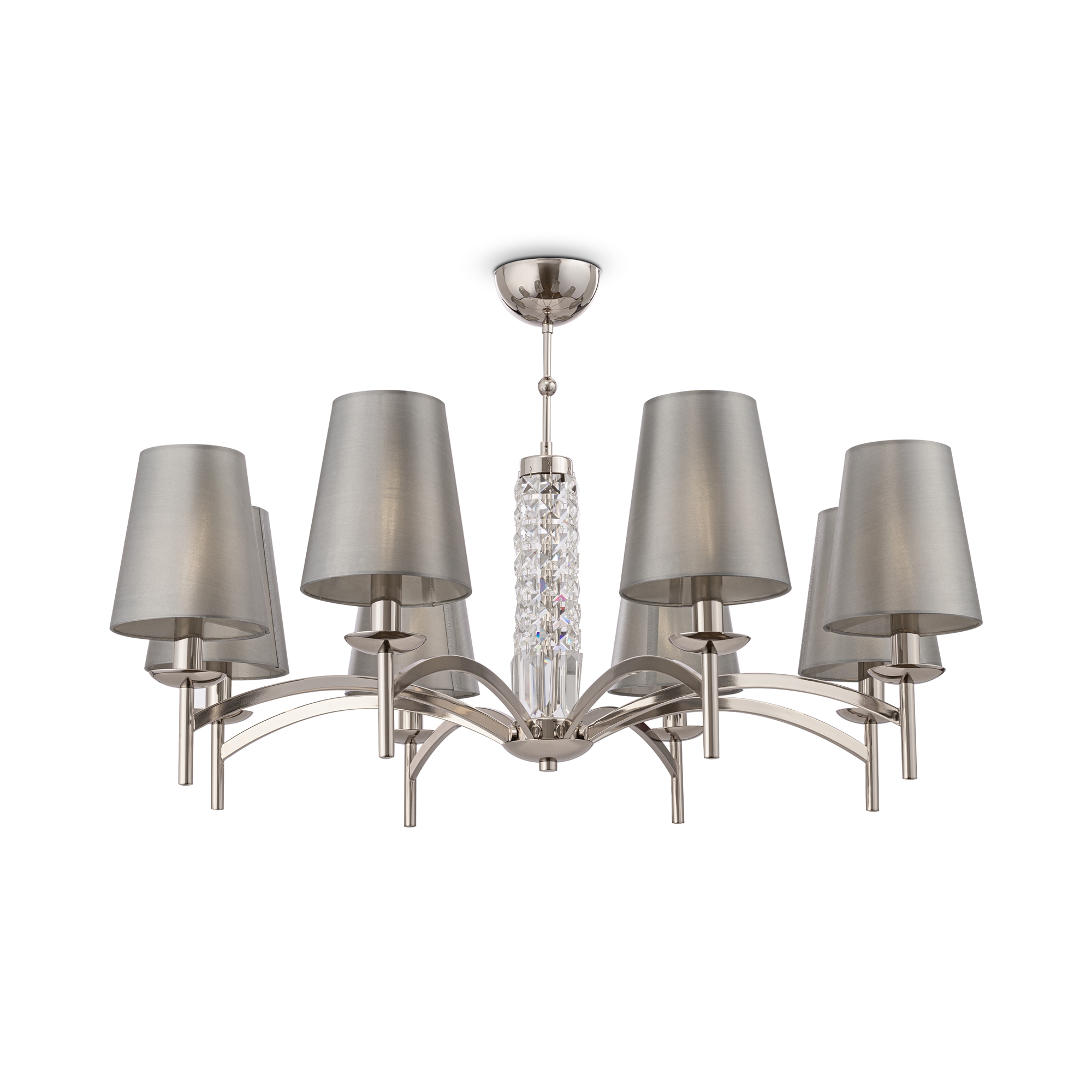 Серия современных светильников krona. абажуры элегантно сочетаются с декоративными элементами из граненых кристаллов. арматура изготовлена из металла и покрыта гальваническим способом; цвет арматуры – никель. абажуры сделаны из серой ткани, нанесенной на пвх. серия представлена широким выбором типов светильников.