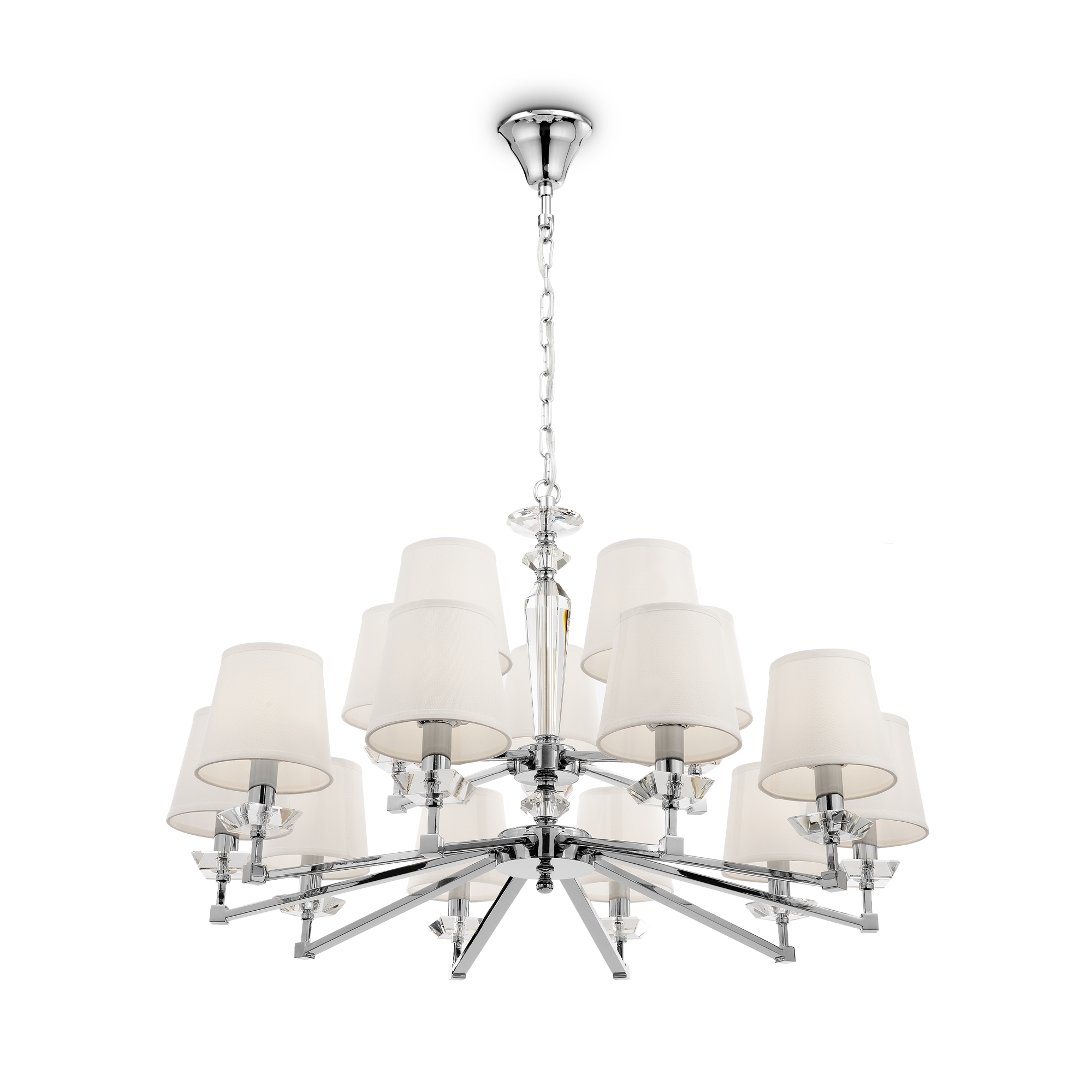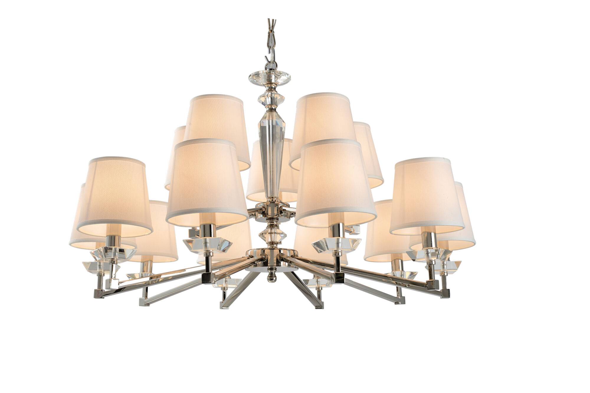 Светильники серии обладают легким, современным обликом, сочетающим в себе элегантность классики и линейность конструктивизма. арматура изготовлена из металла с гальваническим покрытием цвета никель. массивные трапециевидные элементы из прозрачного стекла украшают основание и рожки. абажуры из белого льна, нанесенного на пвх, мягко рассеивают свет ламп. высоту люстр можно регулировать, изменяя длину цепи.