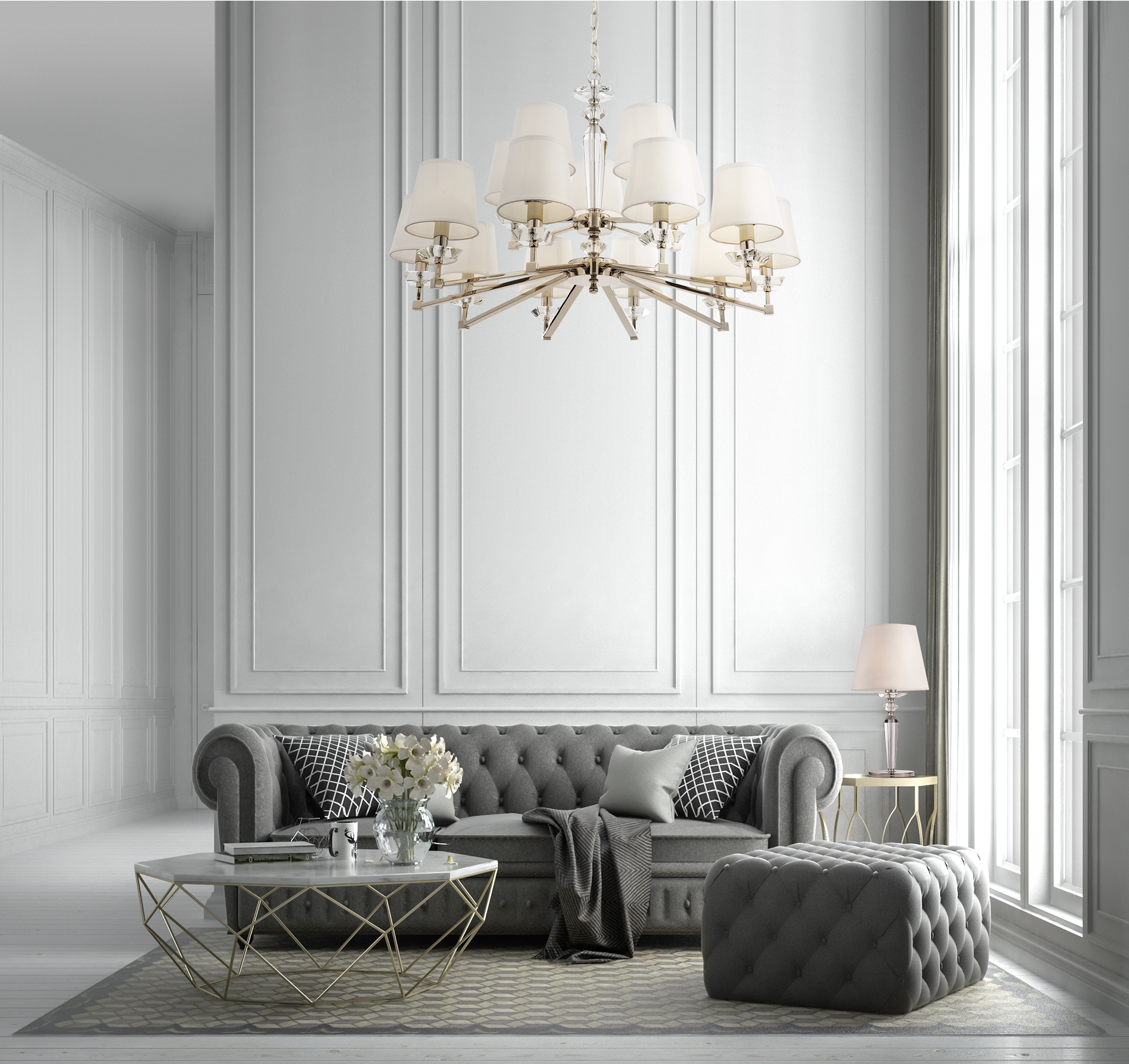 Люстра — главное украшение потолка.