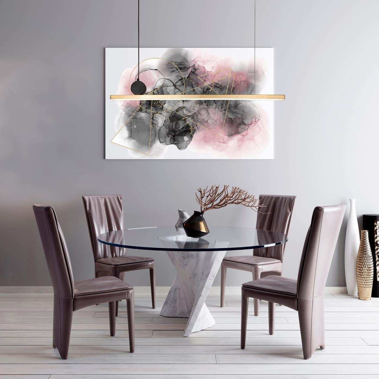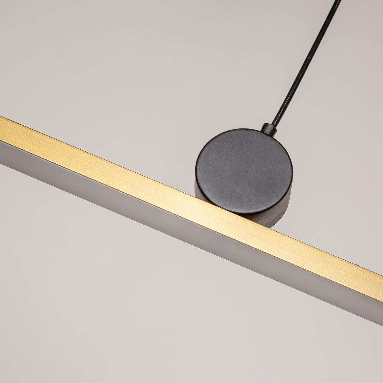 Каркас цвета золота, рассеиватель из белого акрила, круглый декоративный элемент черного цвета, часть каркаса фиксируется тросиком для баланса
