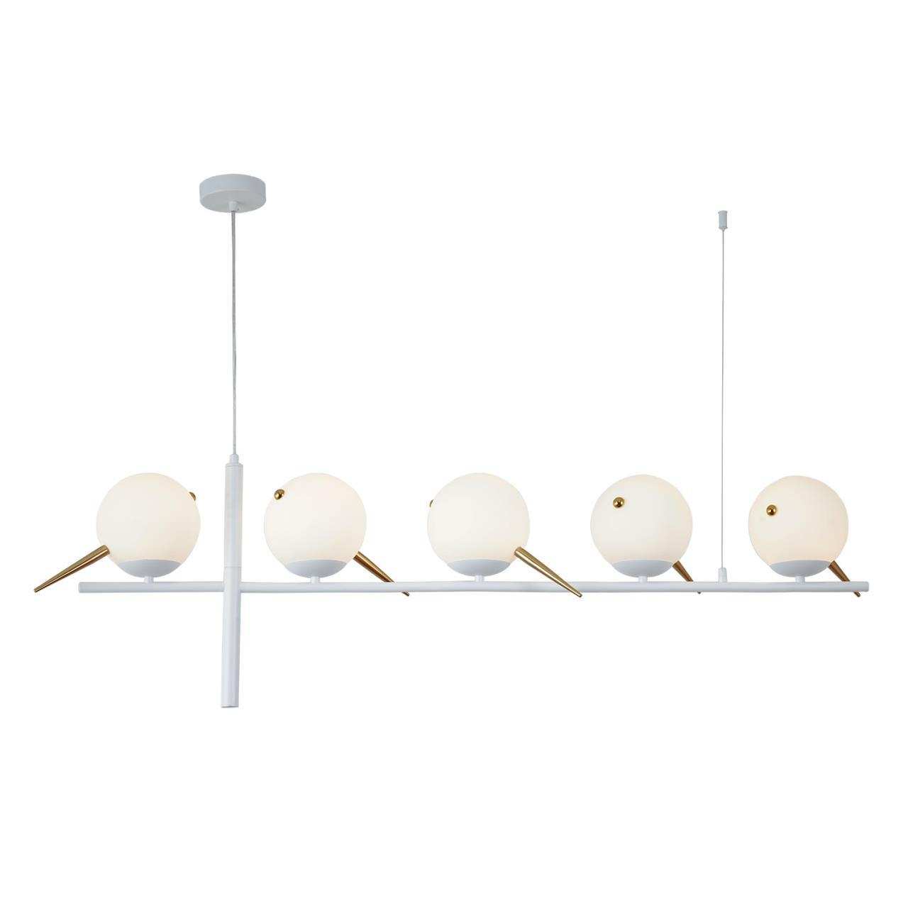 Каркас белого цвета, выдувные плафоны из стекла белого цвета с декоративными элементами из металла золотого цвета. высота подвесной люстры регулируетс