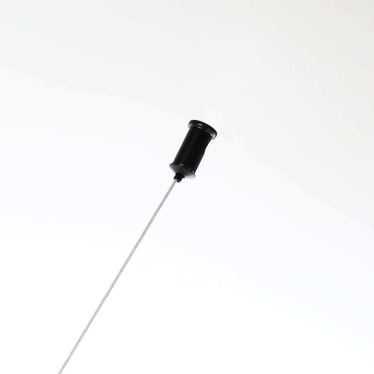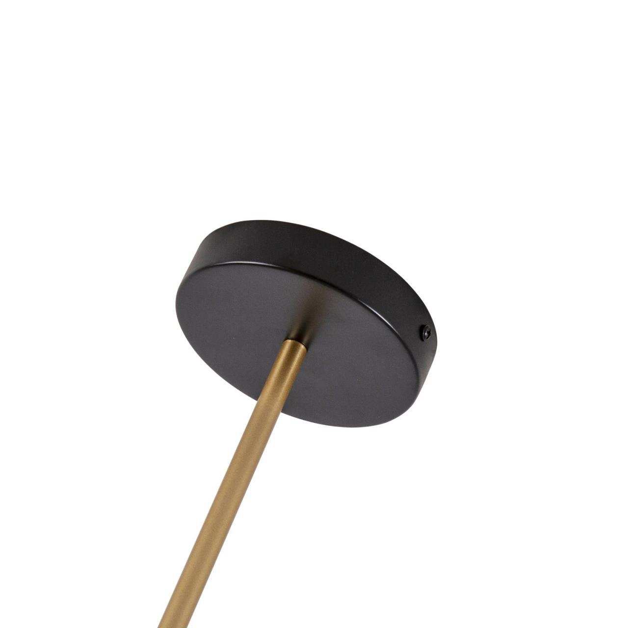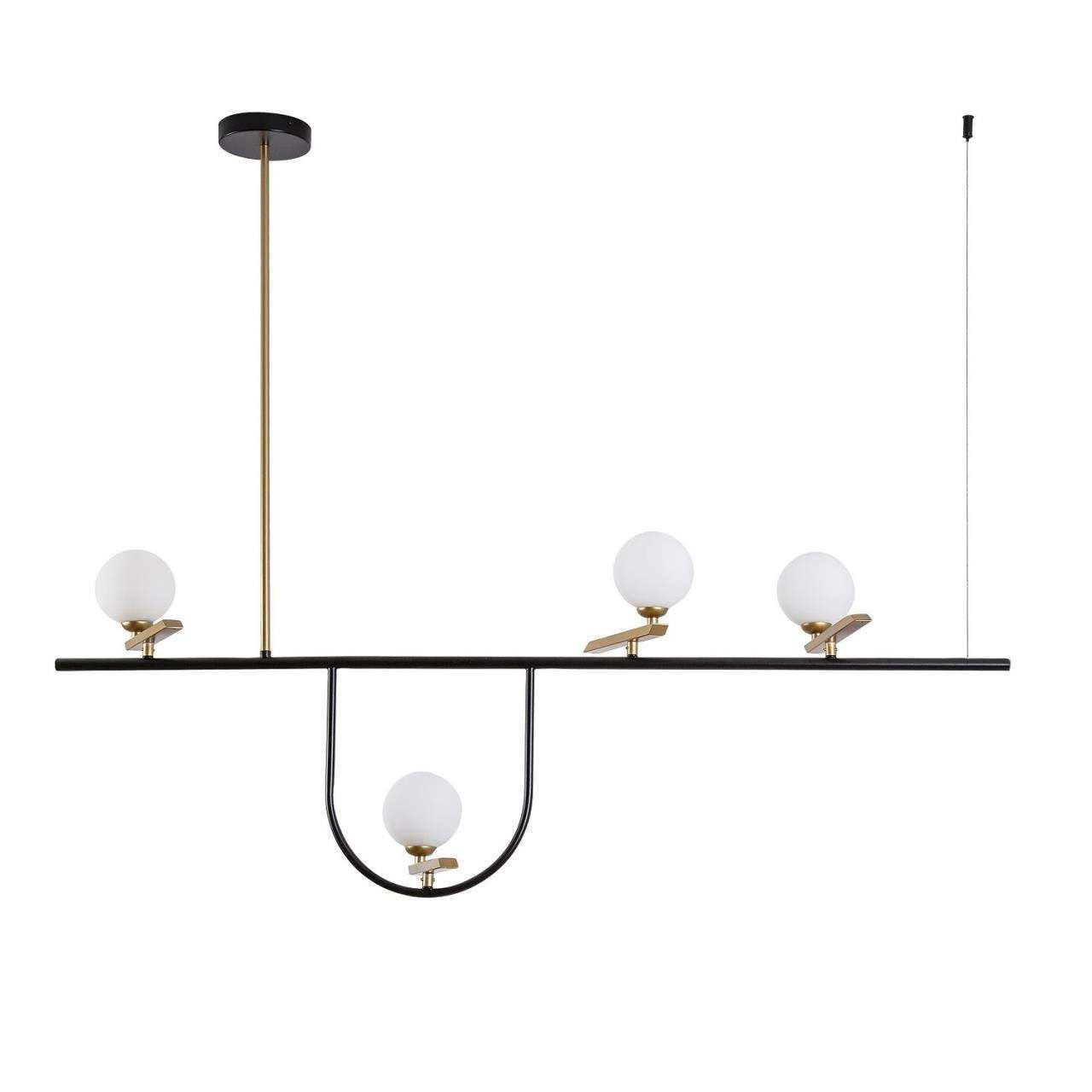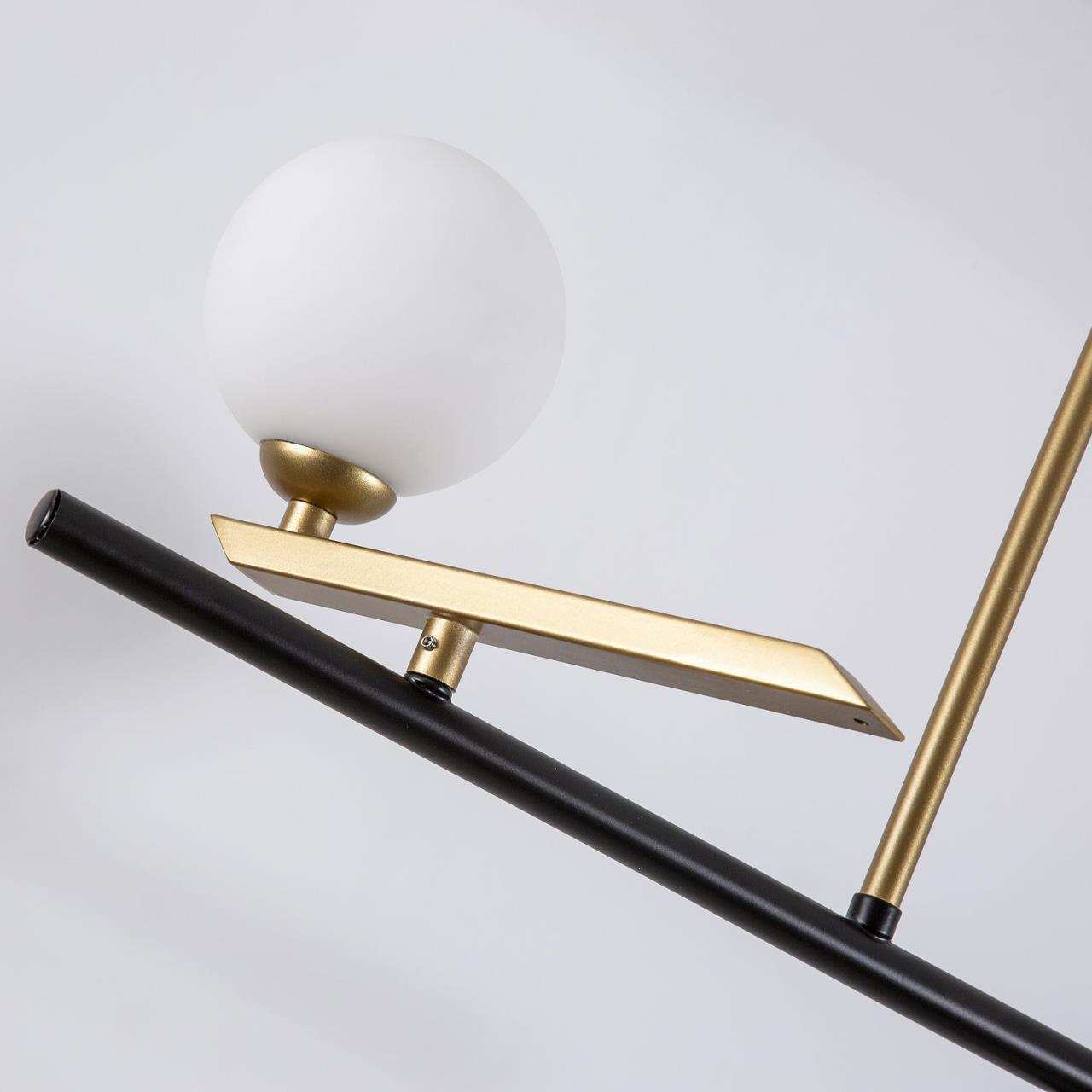 Каркас матового черного цвета с золотыми декоративными элементами, поворотные плафоны из выдувного стекла белого цвета, часть каркаса фиксируется трос