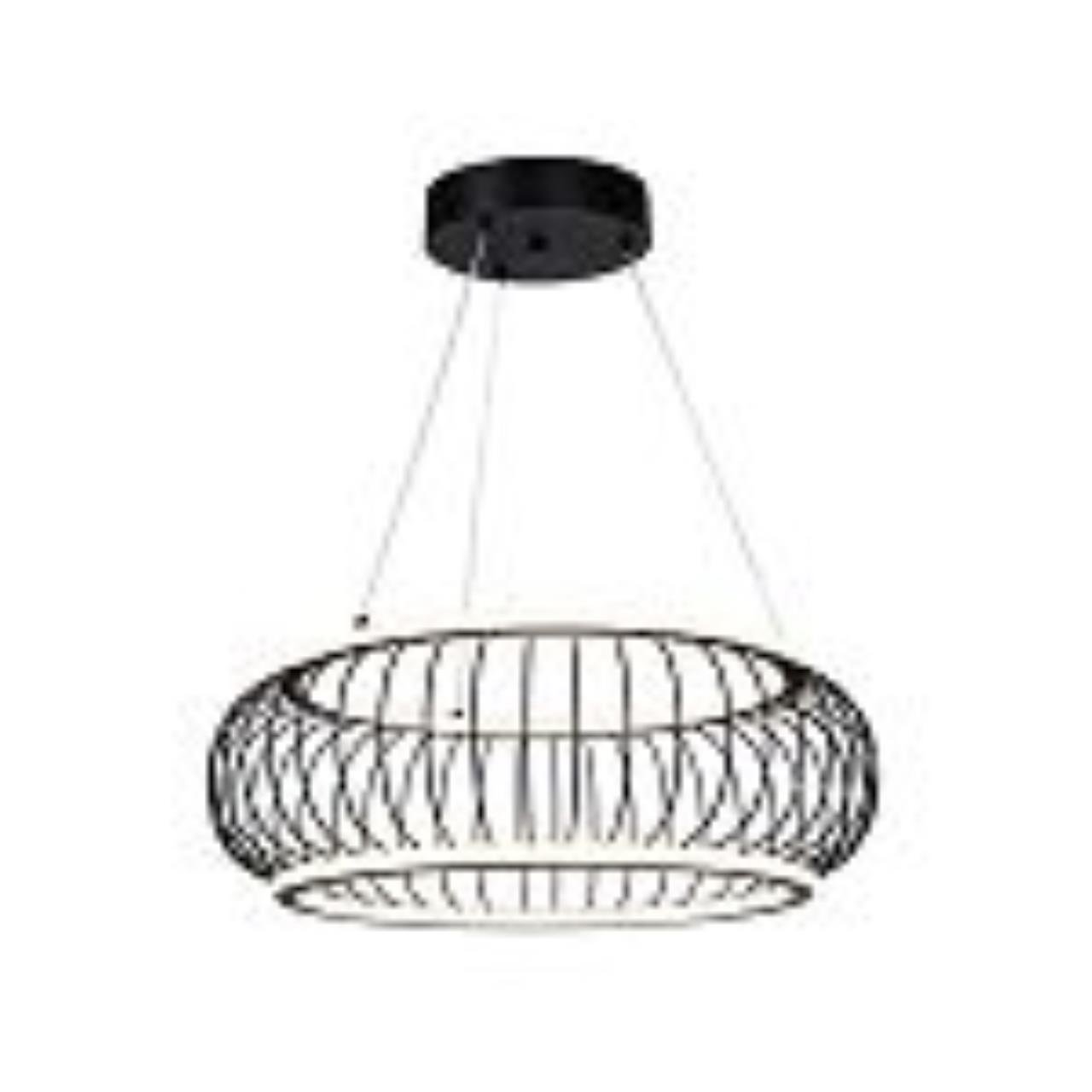 Округлое верхнее и нижнее основание черного цвета, LED-лента, регулируется пультом управления. Плафон - решетка из черных матовых металлических прутик