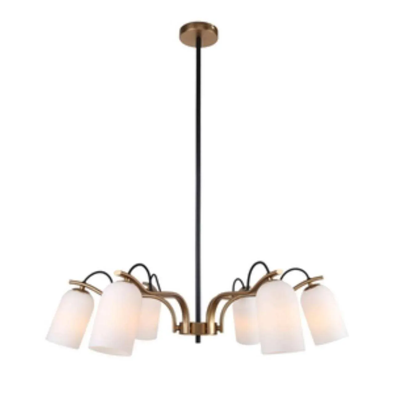 каркас темно-серого цвета и цвета латуни, плафоны из белого стекла