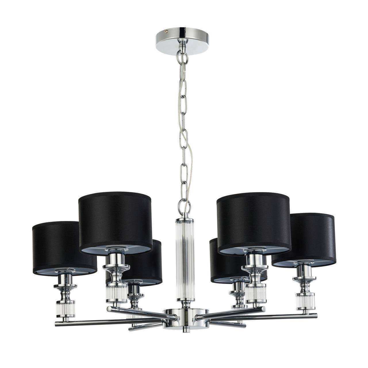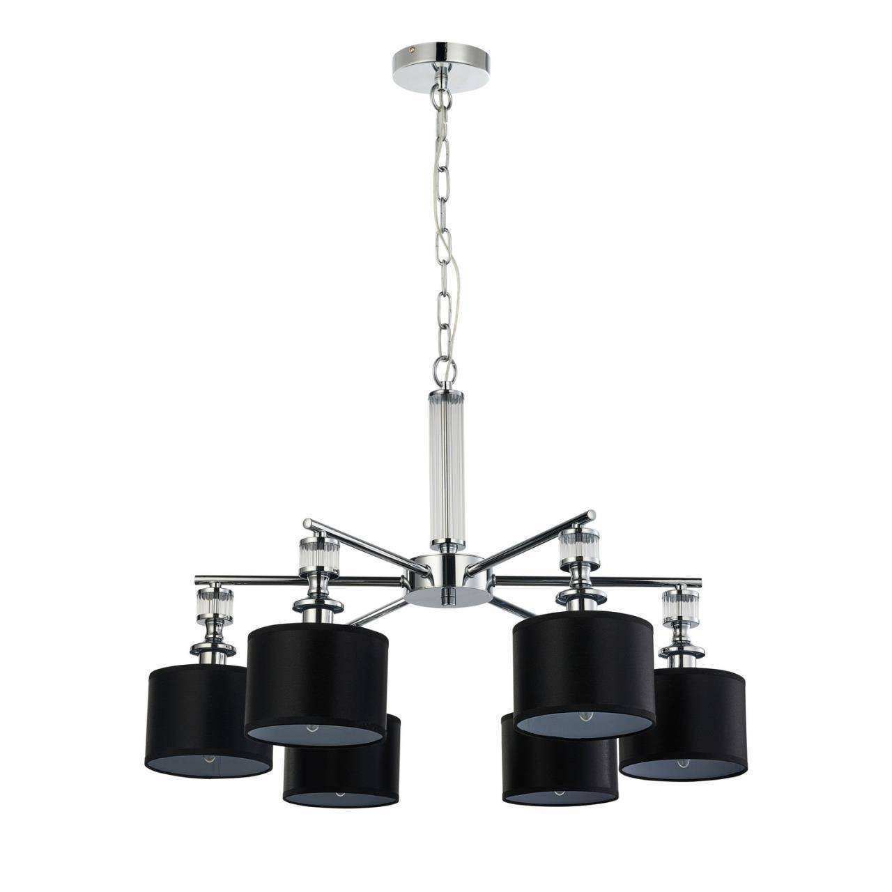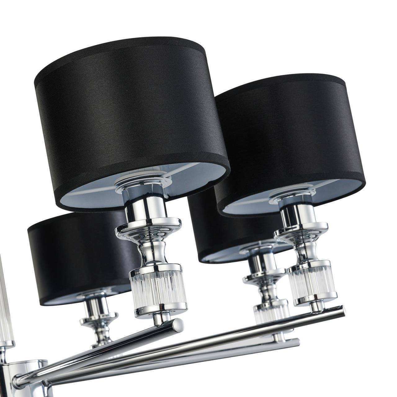 Каркас цвета хром, плафоны из серой ткани, декоративные элементы из прозрачного стекла, люстру можно монтировать как плафонами вверх, так и плафонами