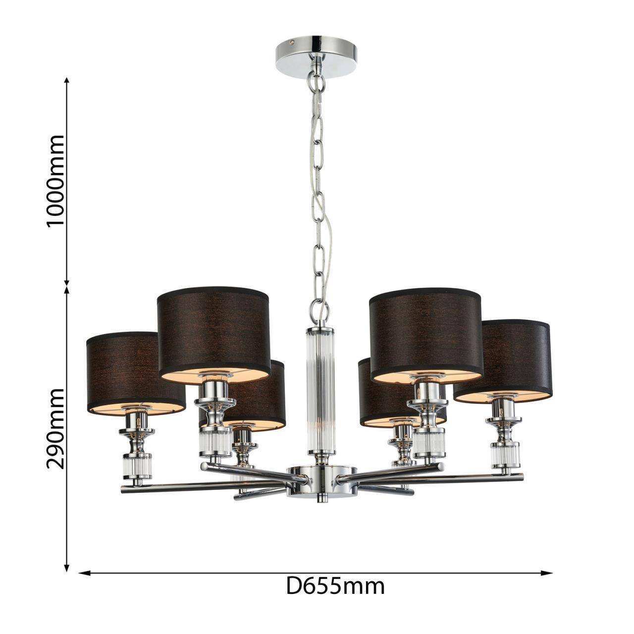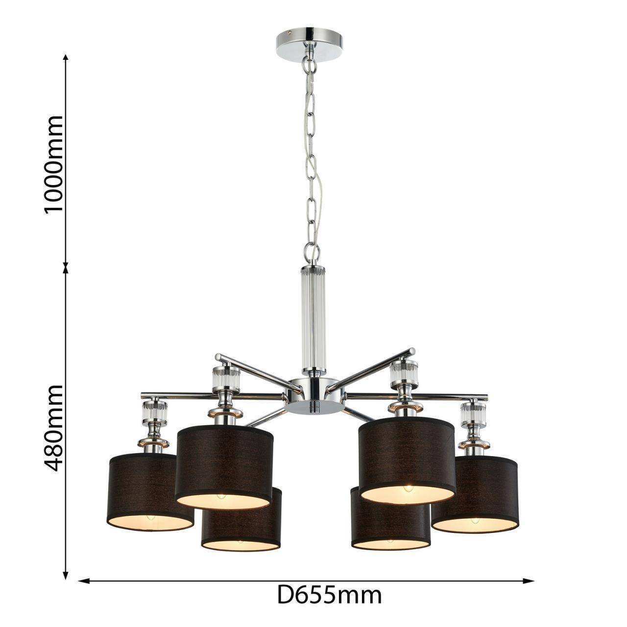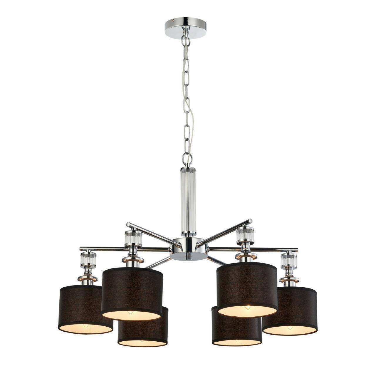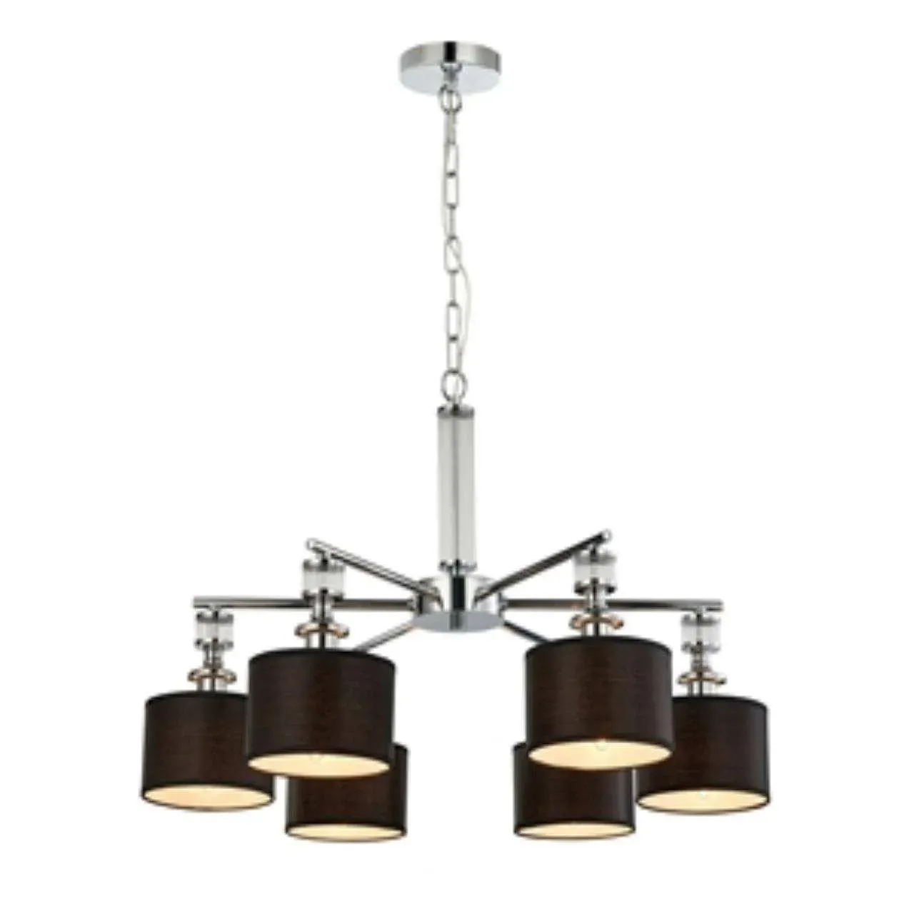 Каркас цвета хром, плафоны из серой ткани, декоративные элементы из прозрачного стекла, люстру можно монтировать как плафонами вверх, так и плафонами