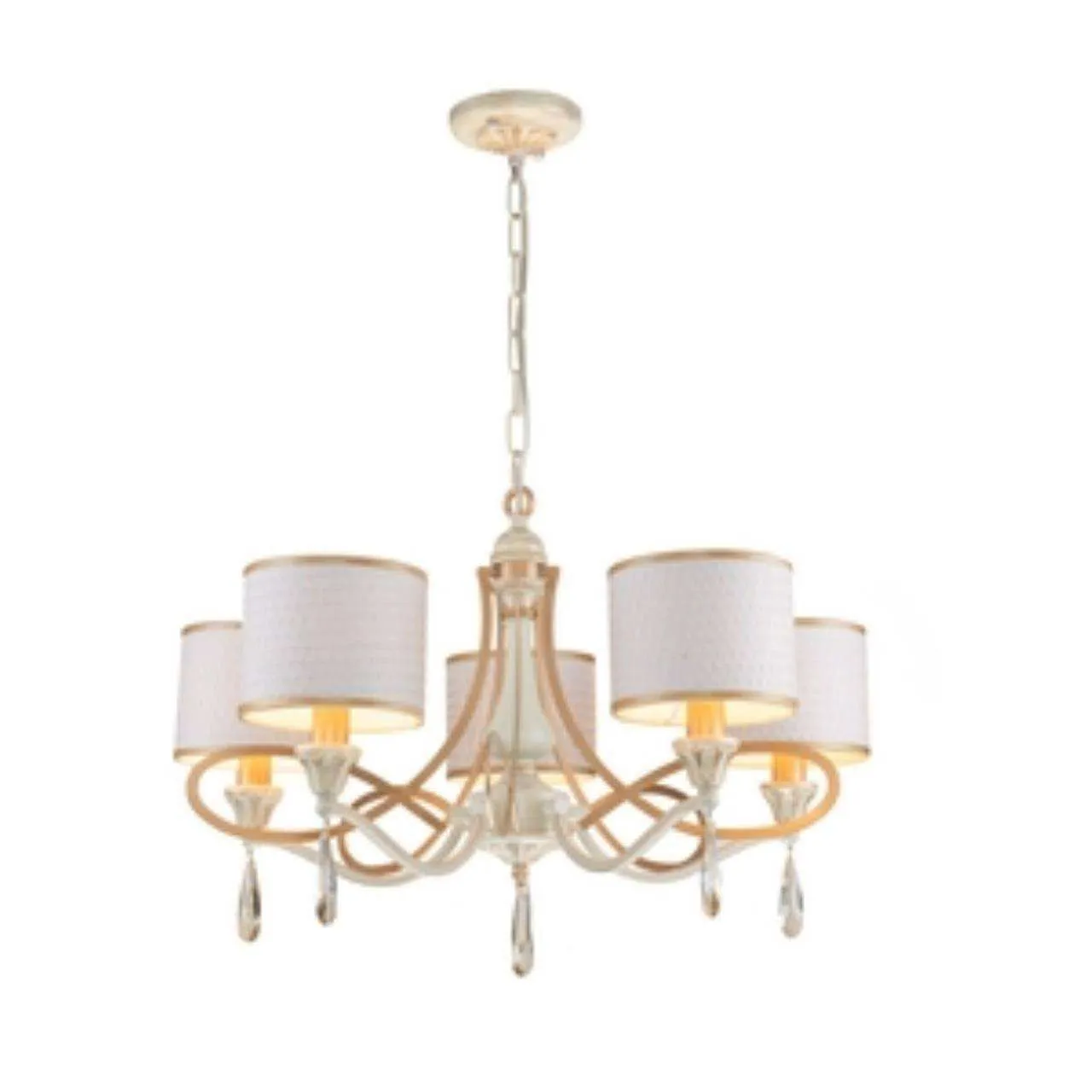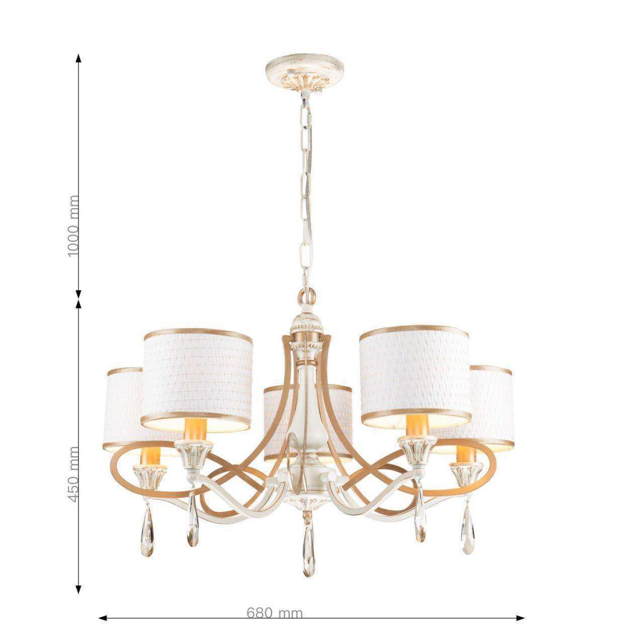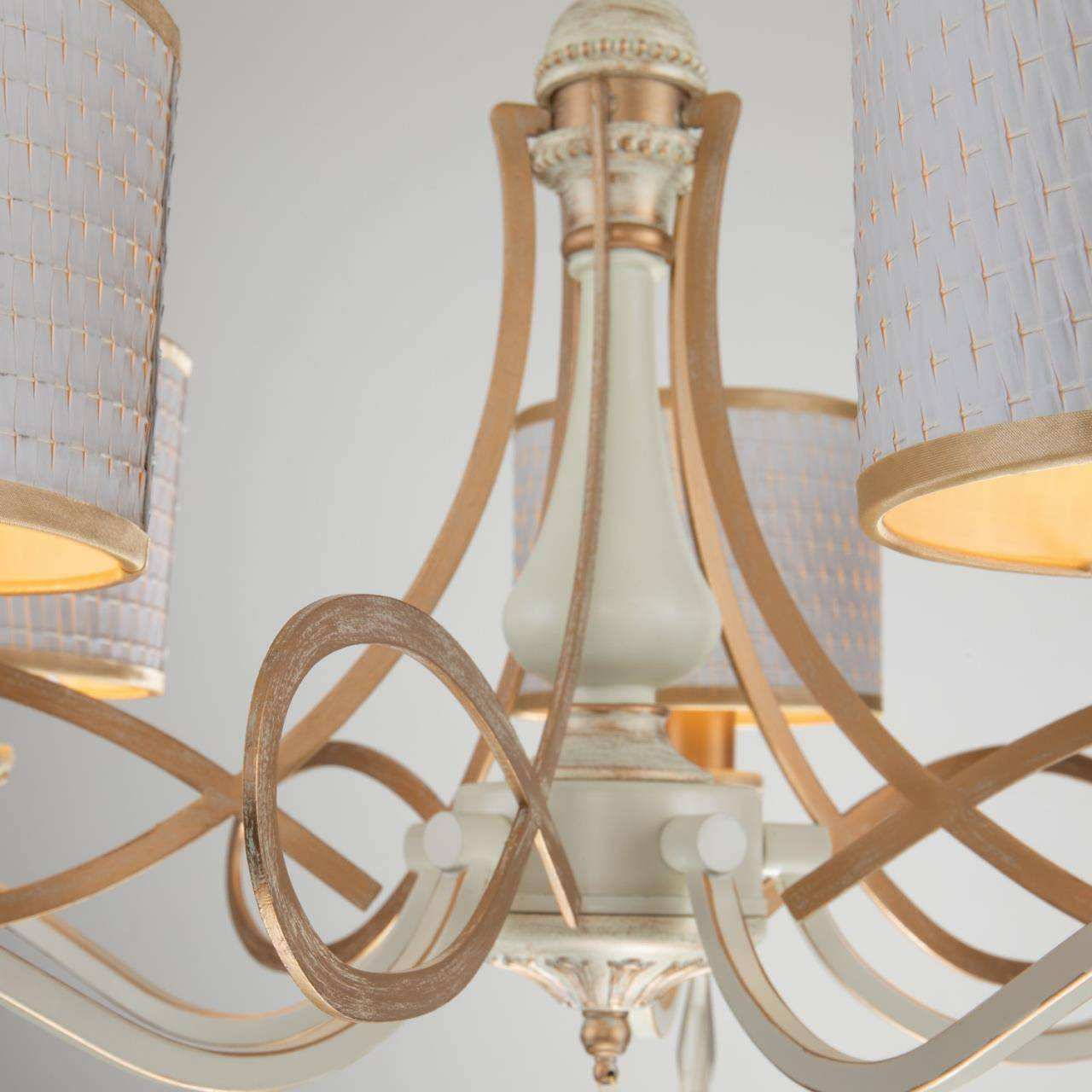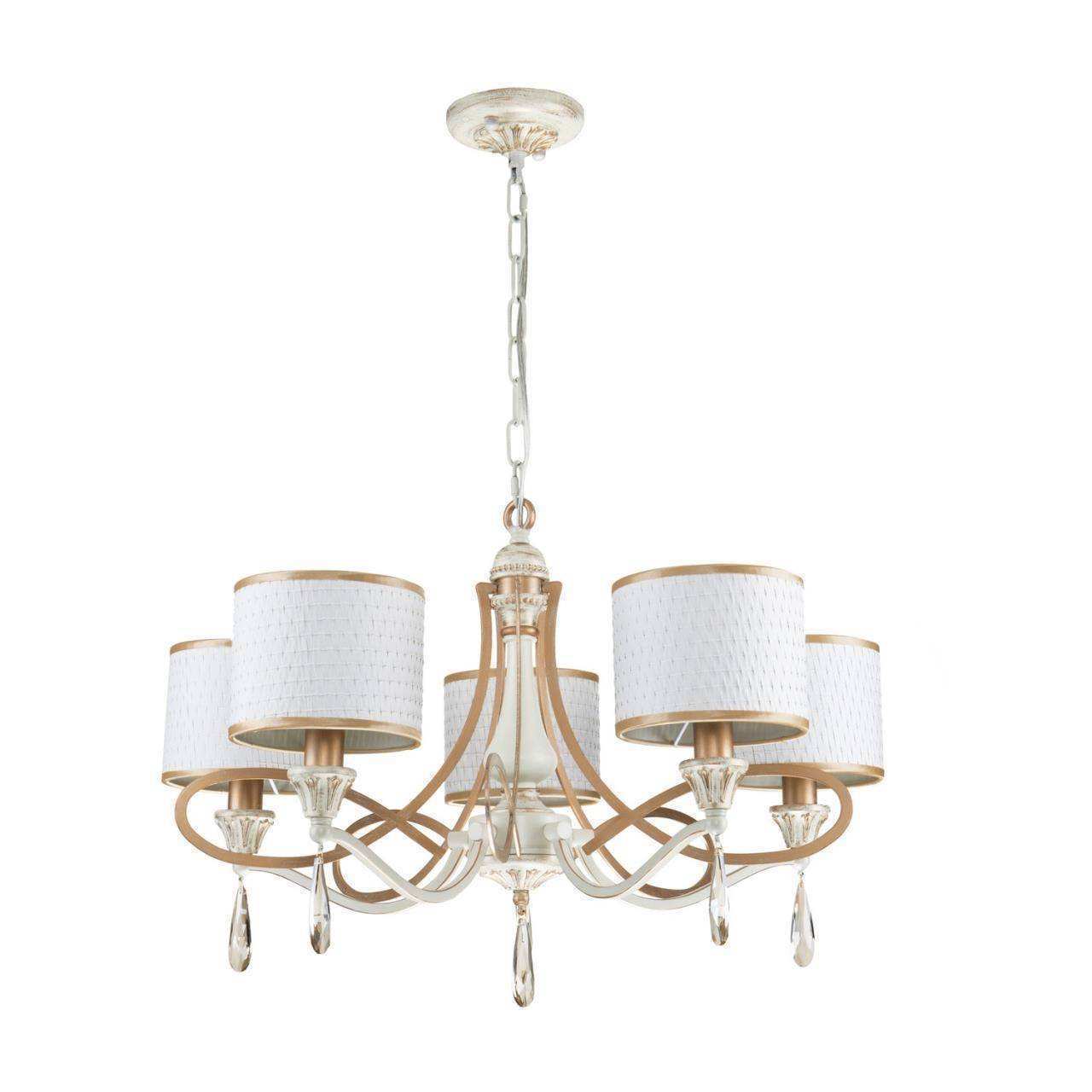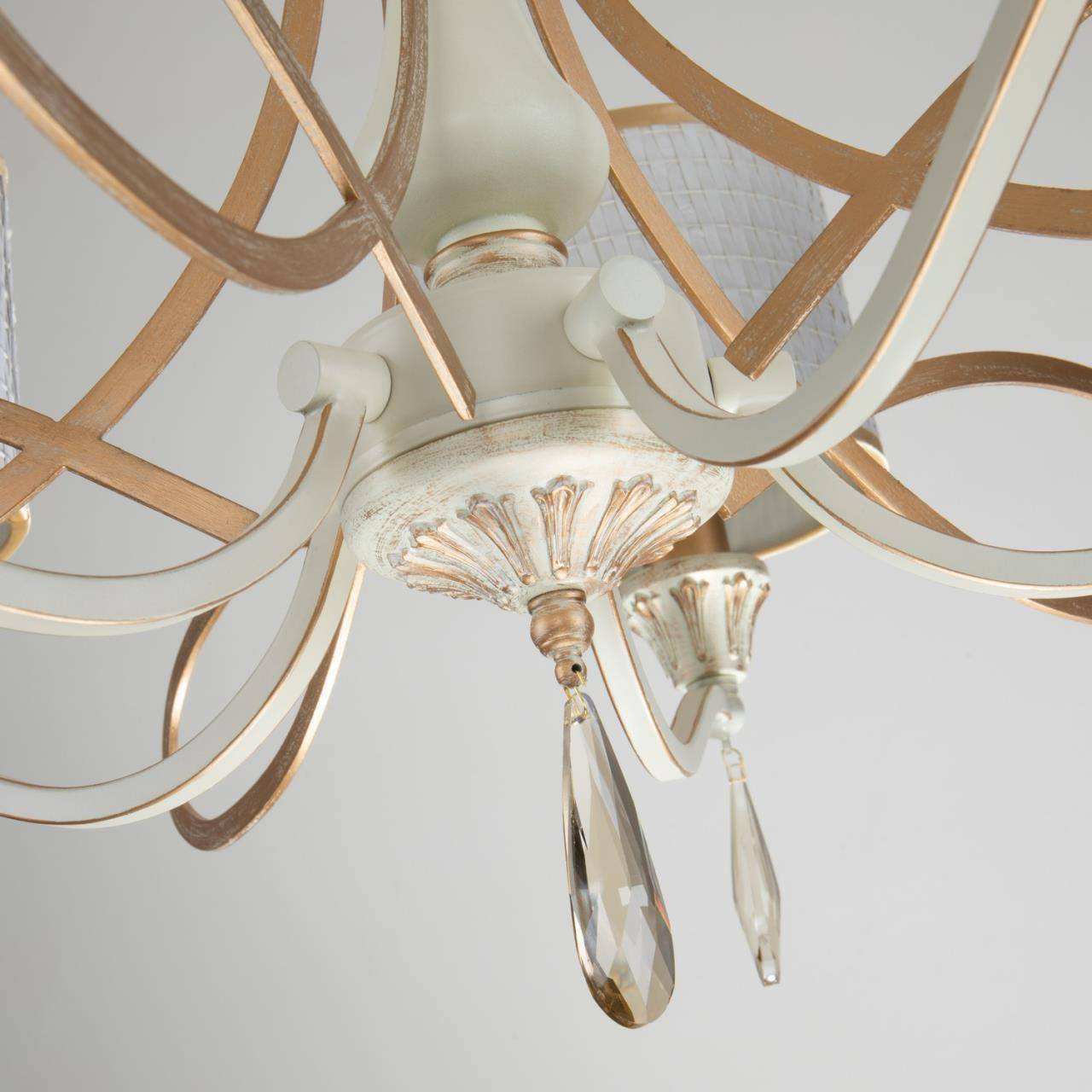каркас белого цвета с патиной цвета перламутровое золото, абажуры из белой ткани с золотой тесьмой, декоративные элементы из прозрачного хрусталя