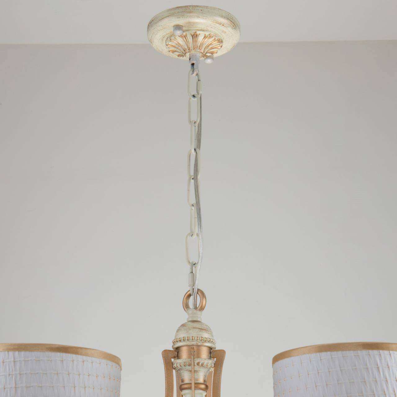 Каркас белого цвета с патиной цвета перламутровое золото, абажуры из белой ткани с золотой тесьмой, декоративные элементы из прозрачного хрусталя