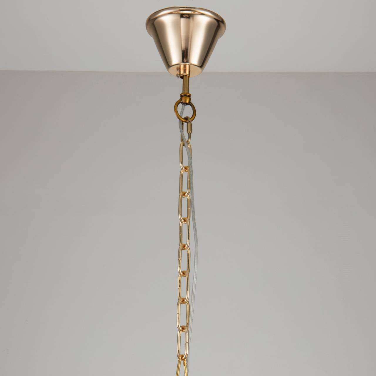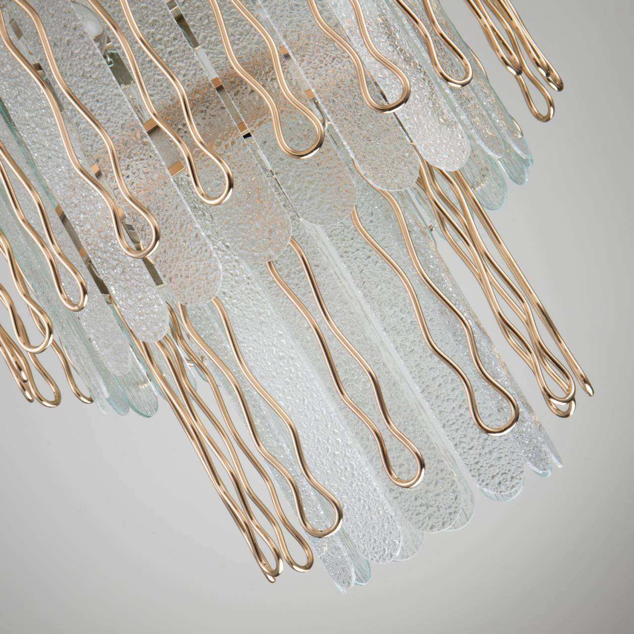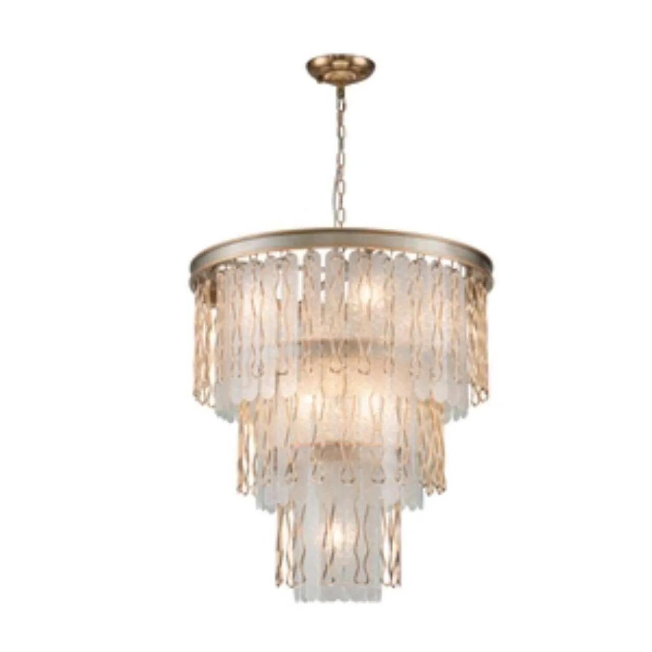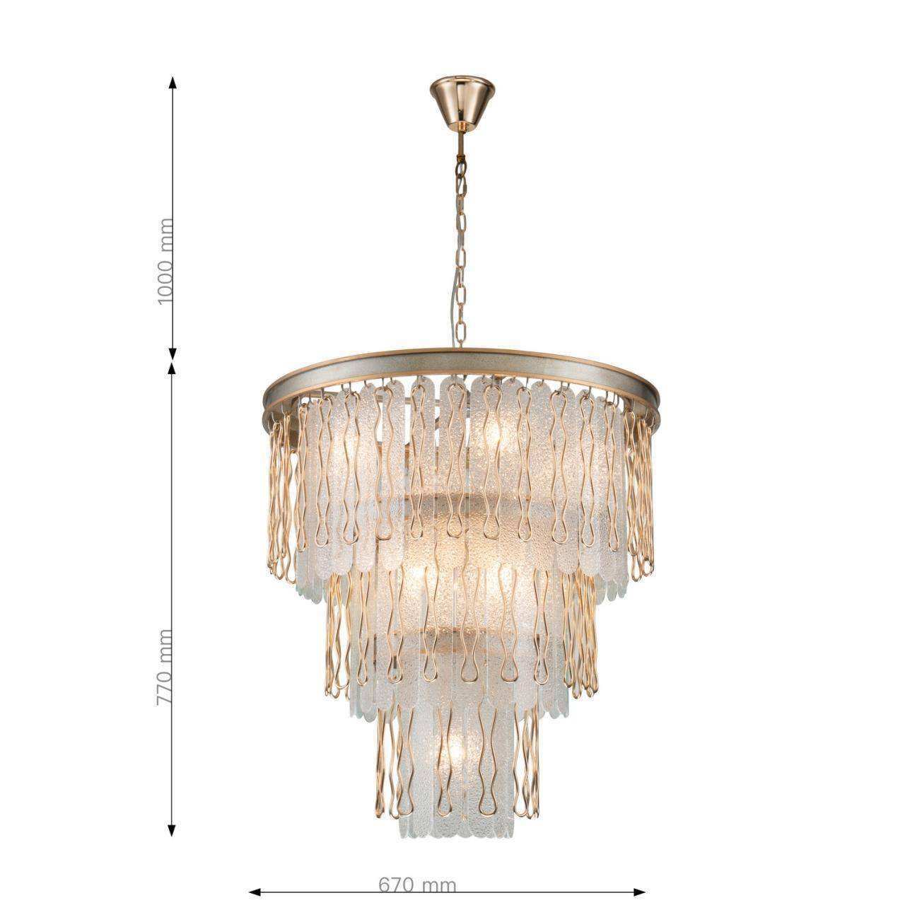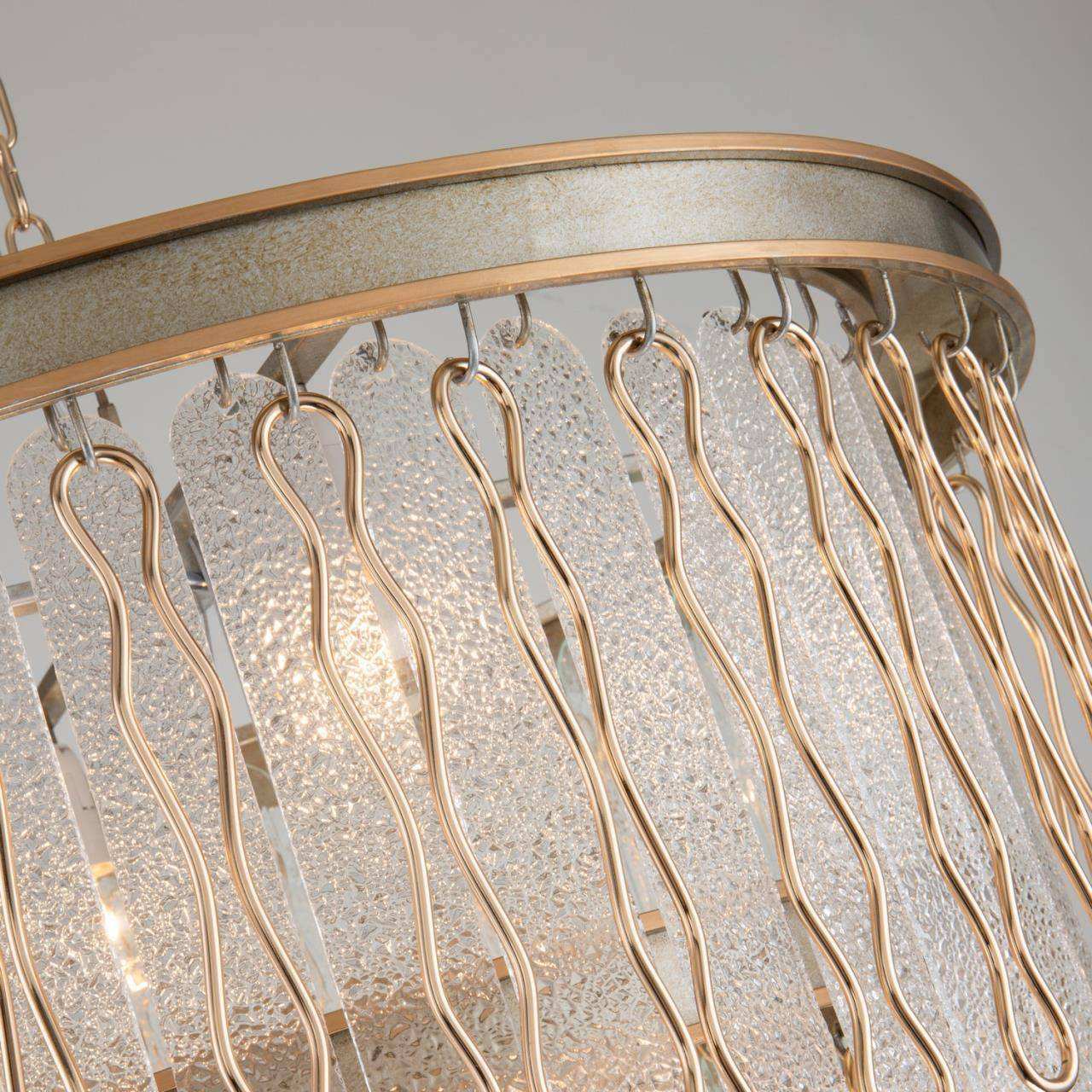 Каркас цвета французского серебра с золотой окантовкой, декоративные элементы из металла золотого цвета, подвески из полупрозрачного стекла с эффектом