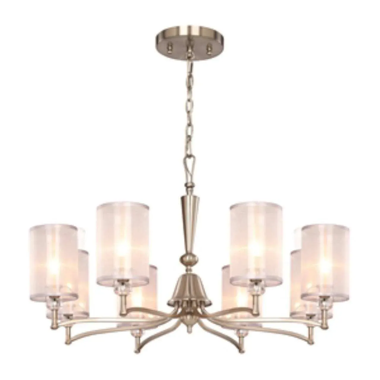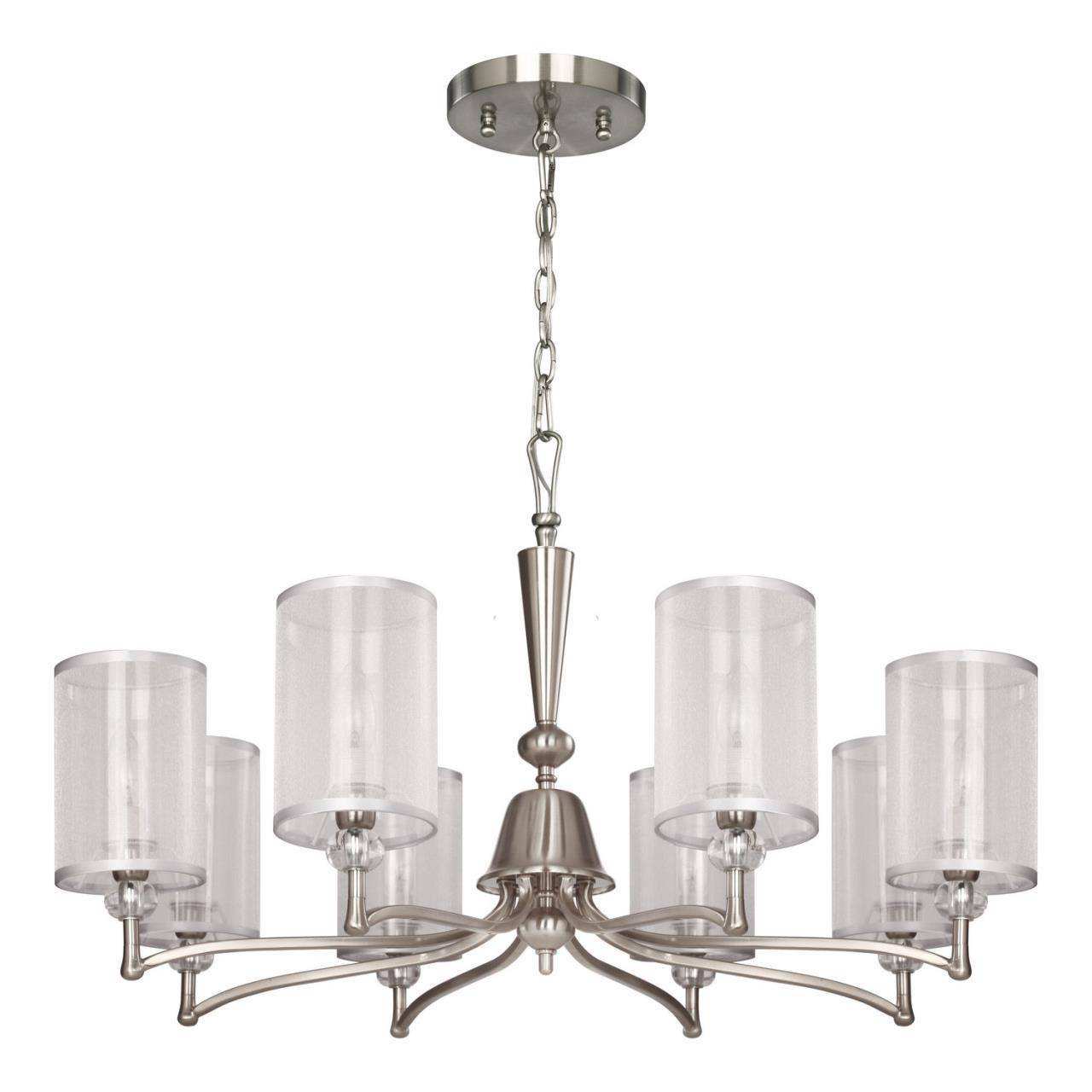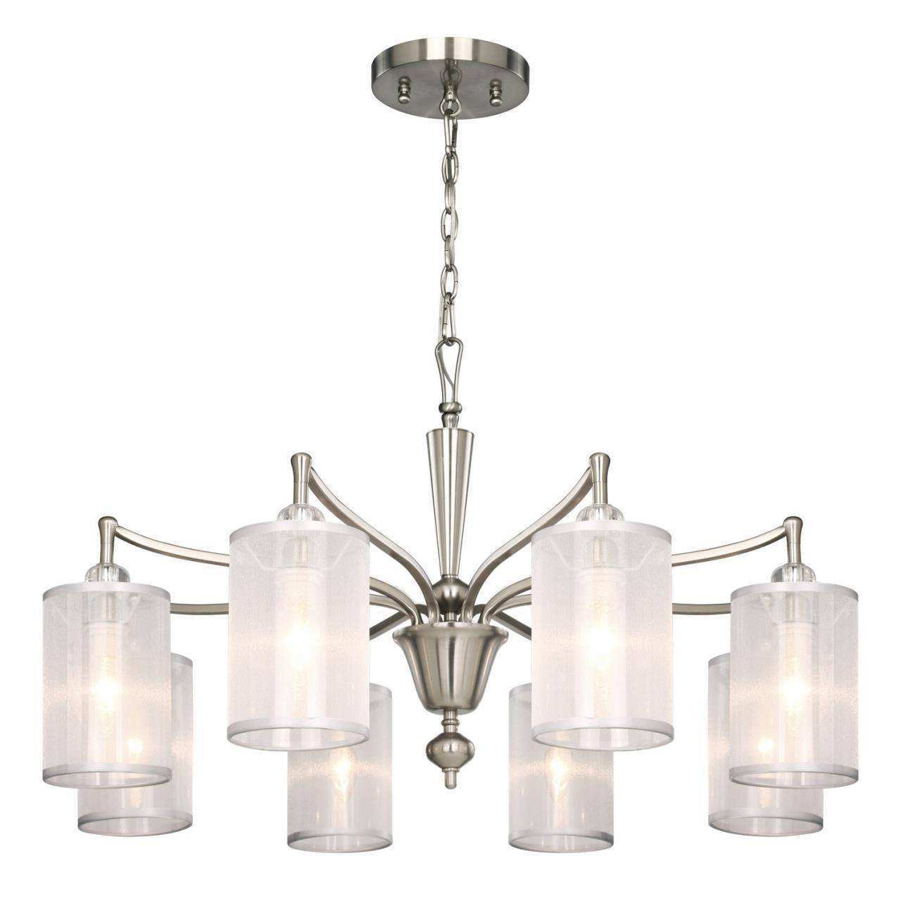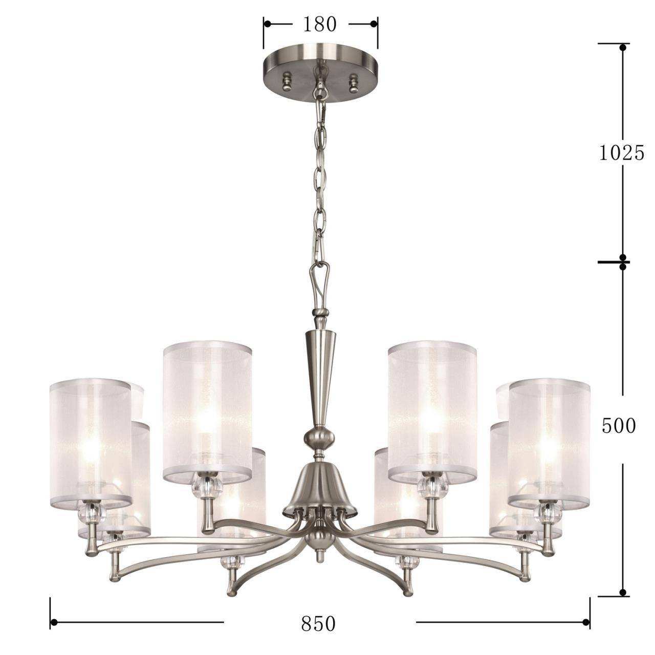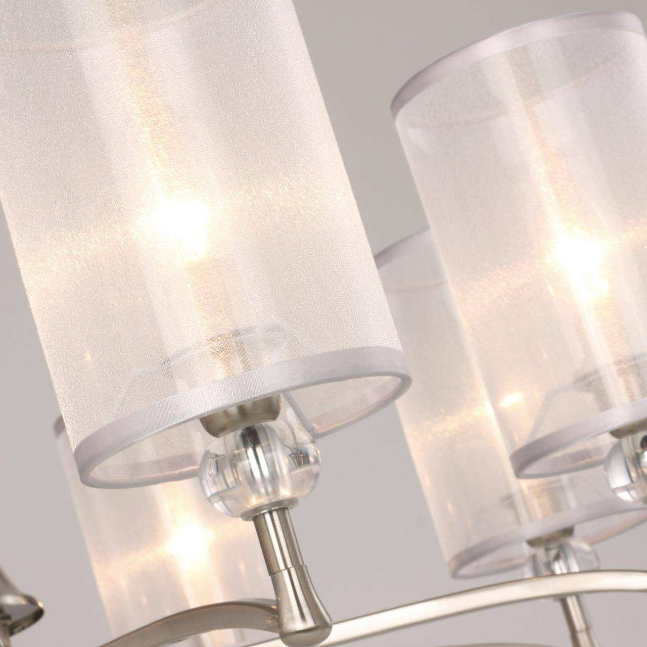 Каркас цвета никель, абажуры из органзы белого цвета с серебряной тесьмой, декоративные элементы из прозрачного стекла, люстру можно монтировать как п