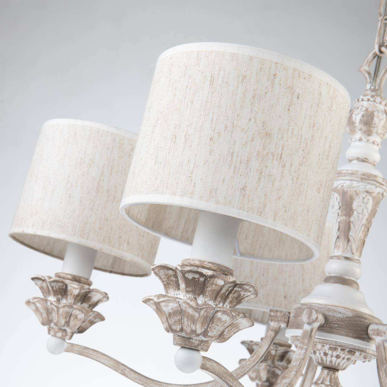 каркас бежево-коричневого и белого цвета, абажур из ткани типа рогожка натурального цвета, декоративные элементы выполнены из гипса