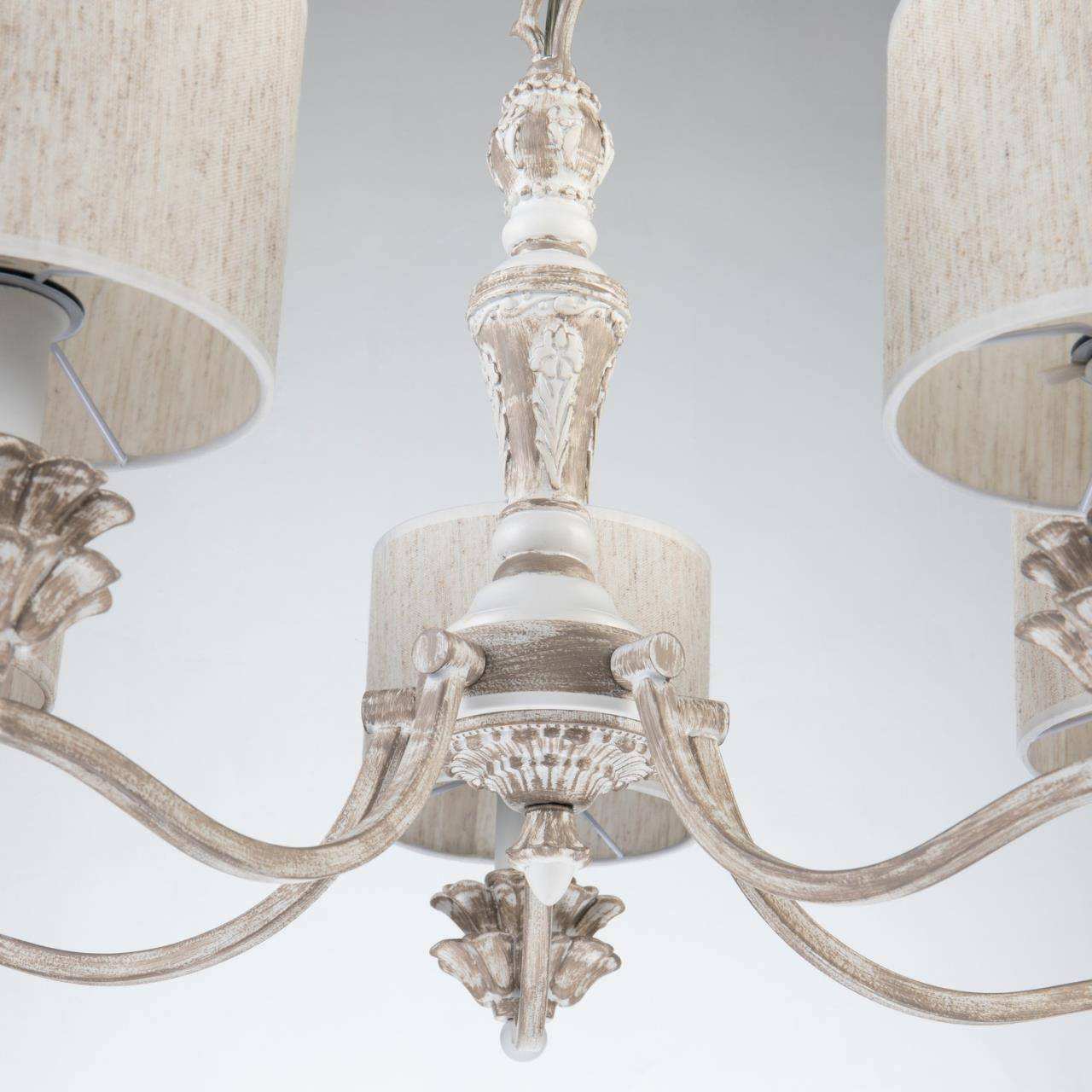 Каркас бежево-коричневого и белого цвета, абажур из ткани типа рогожка натурального цвета, декоративные элементы выполнены из гипса