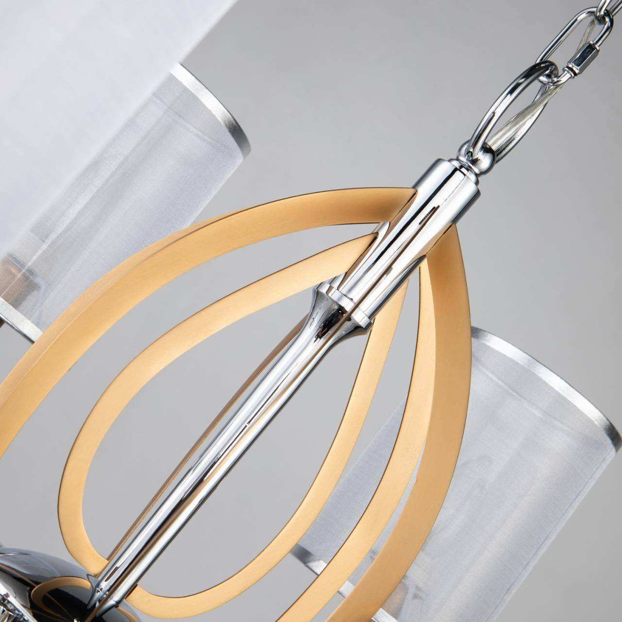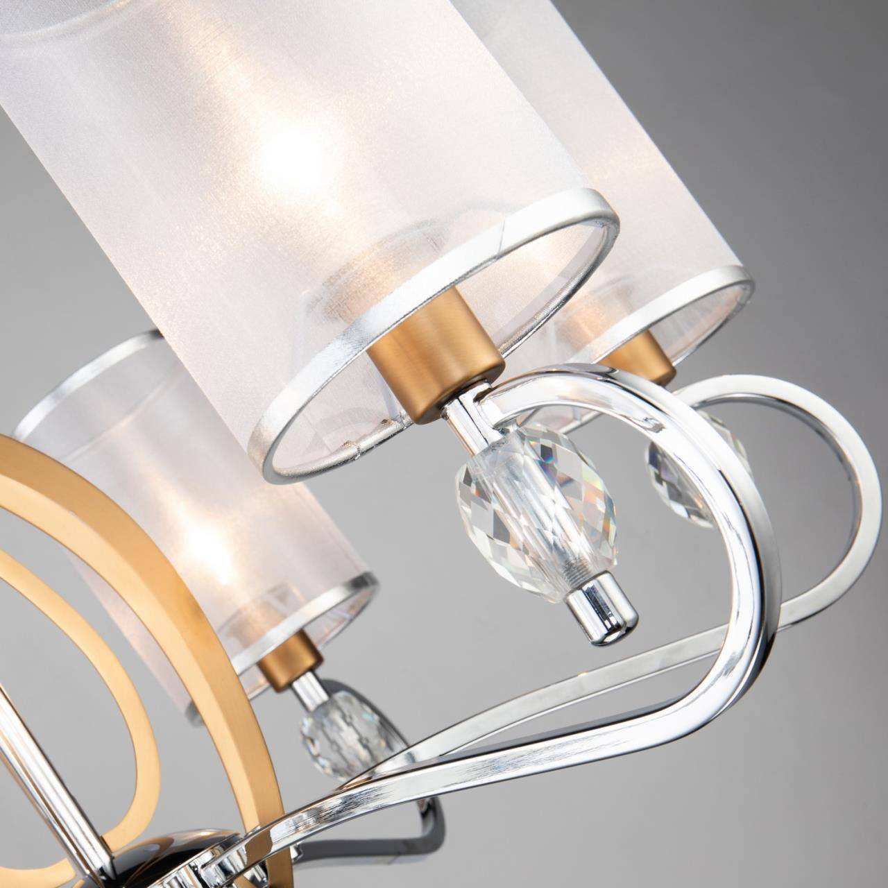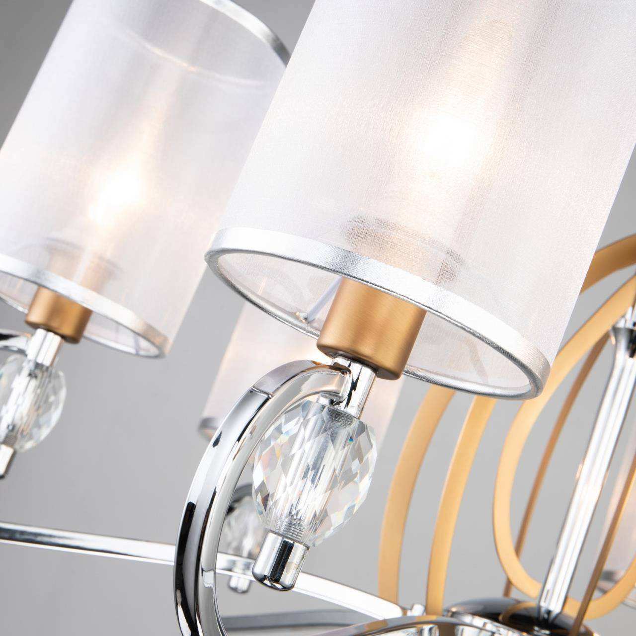 Каркас серебряного цвета и цвета латуни, абажур из полупрозрачной органзы с серебряной тесьмой, декоративные элементы выполнены из прозрачного хрустал