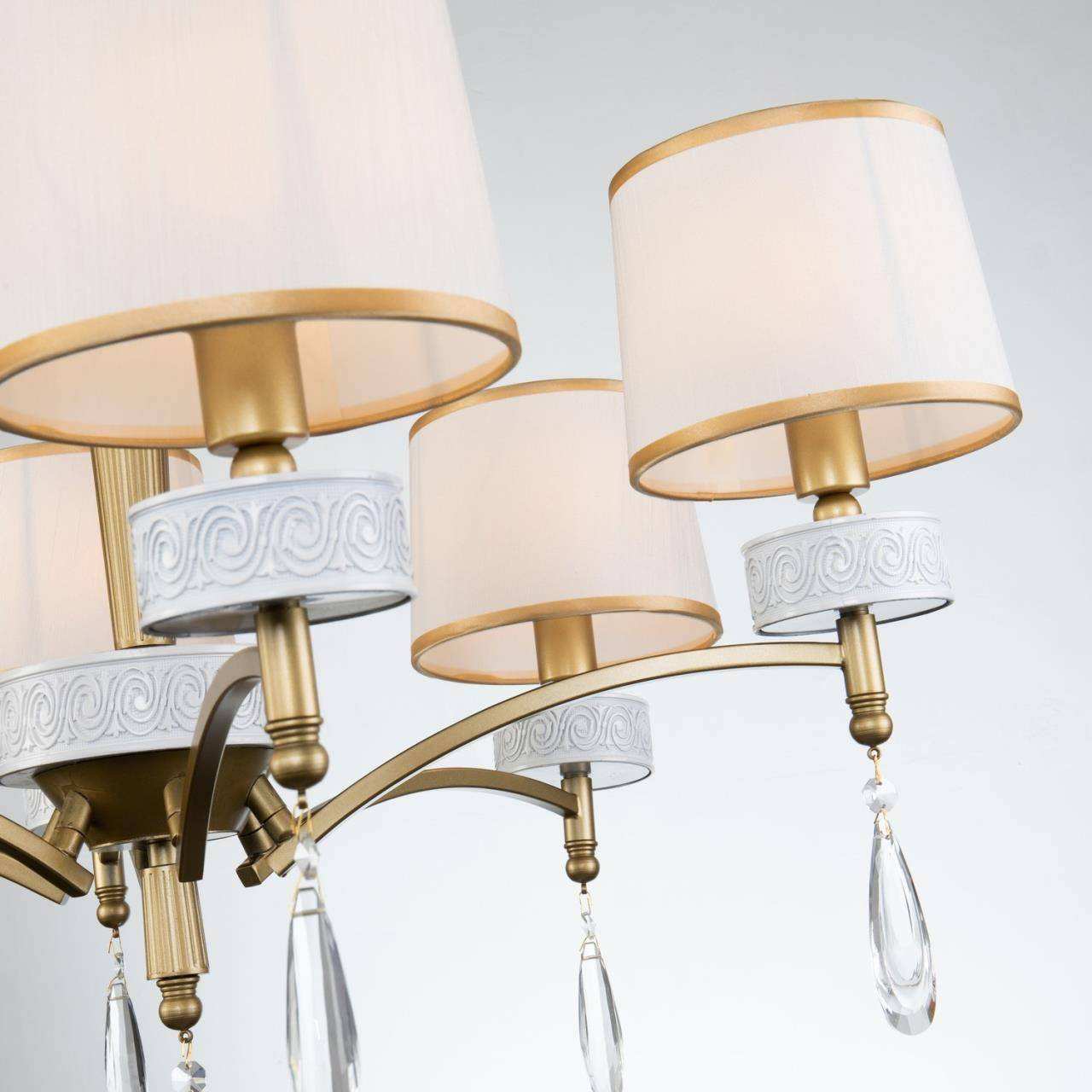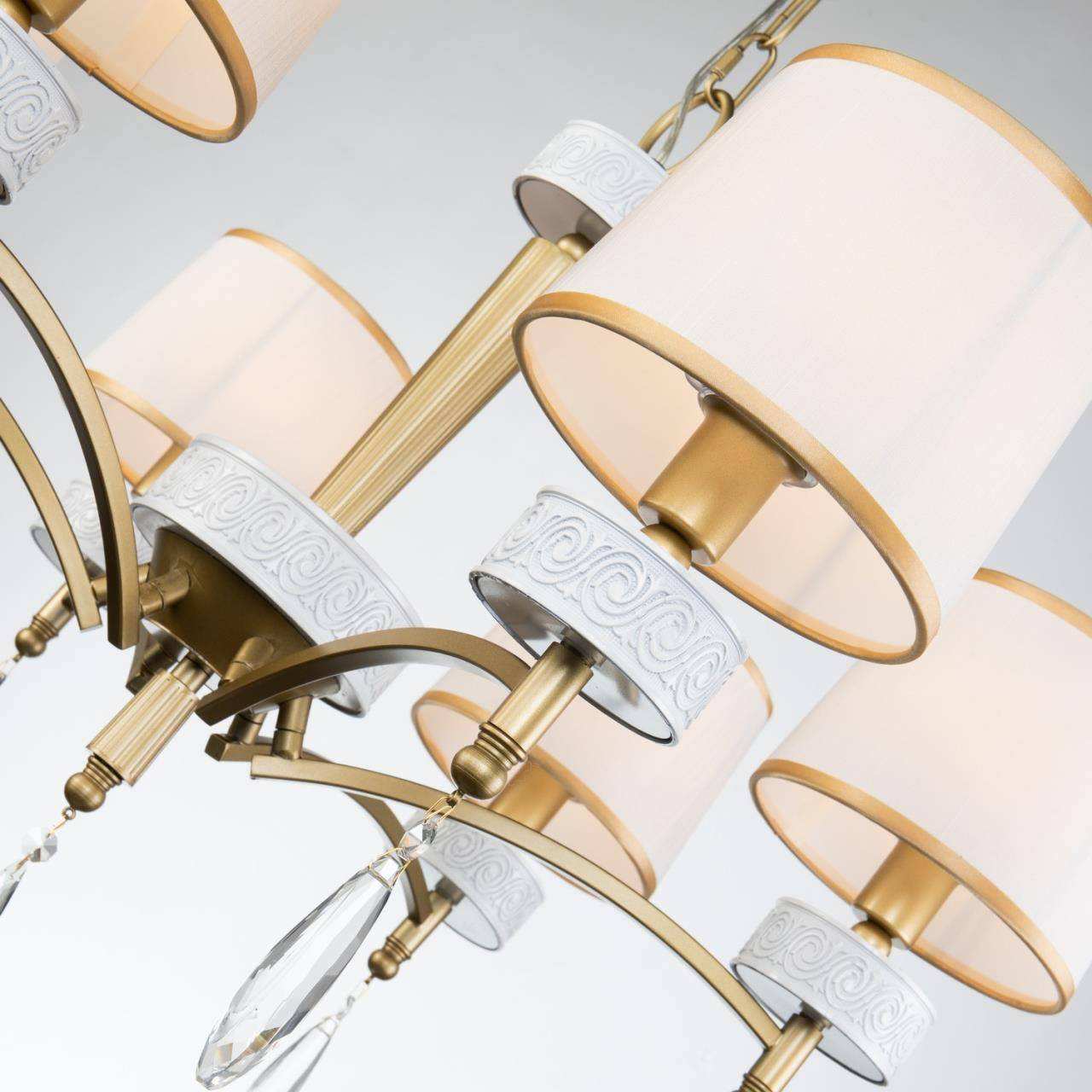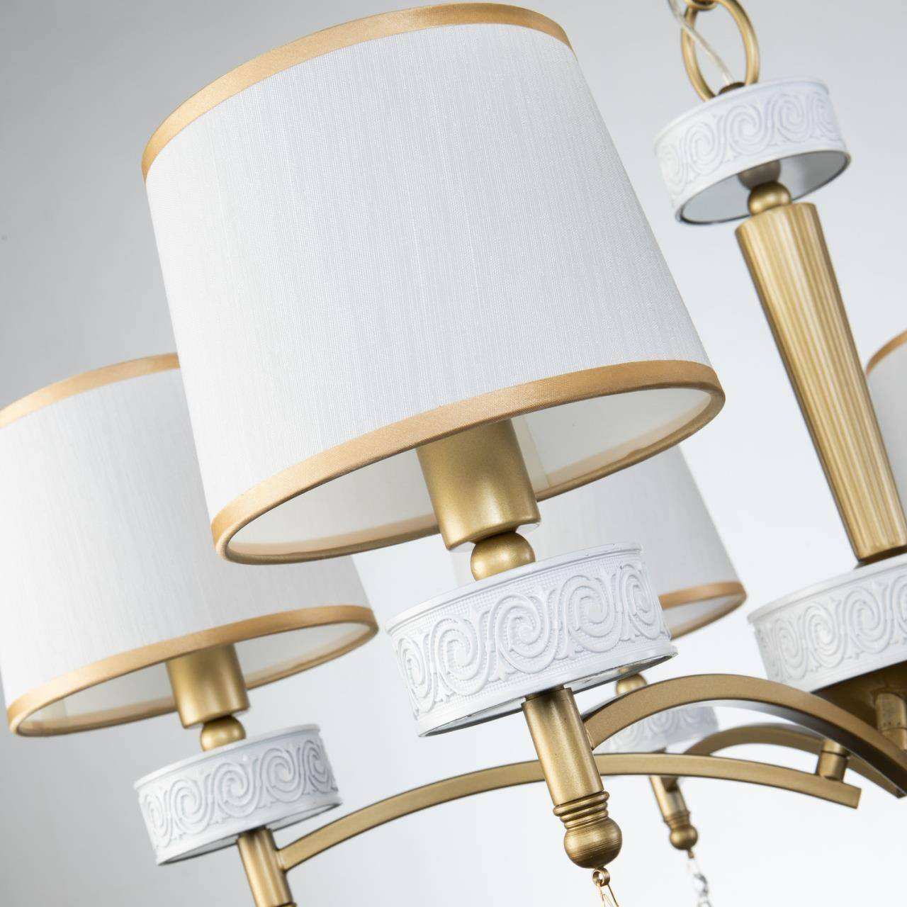 каркас светло-золотого и перламутрово-белого цвета, абажуры из белой ткани с золотой тесьмой, декоративные элементы выполнены из прозрачного хрусталя