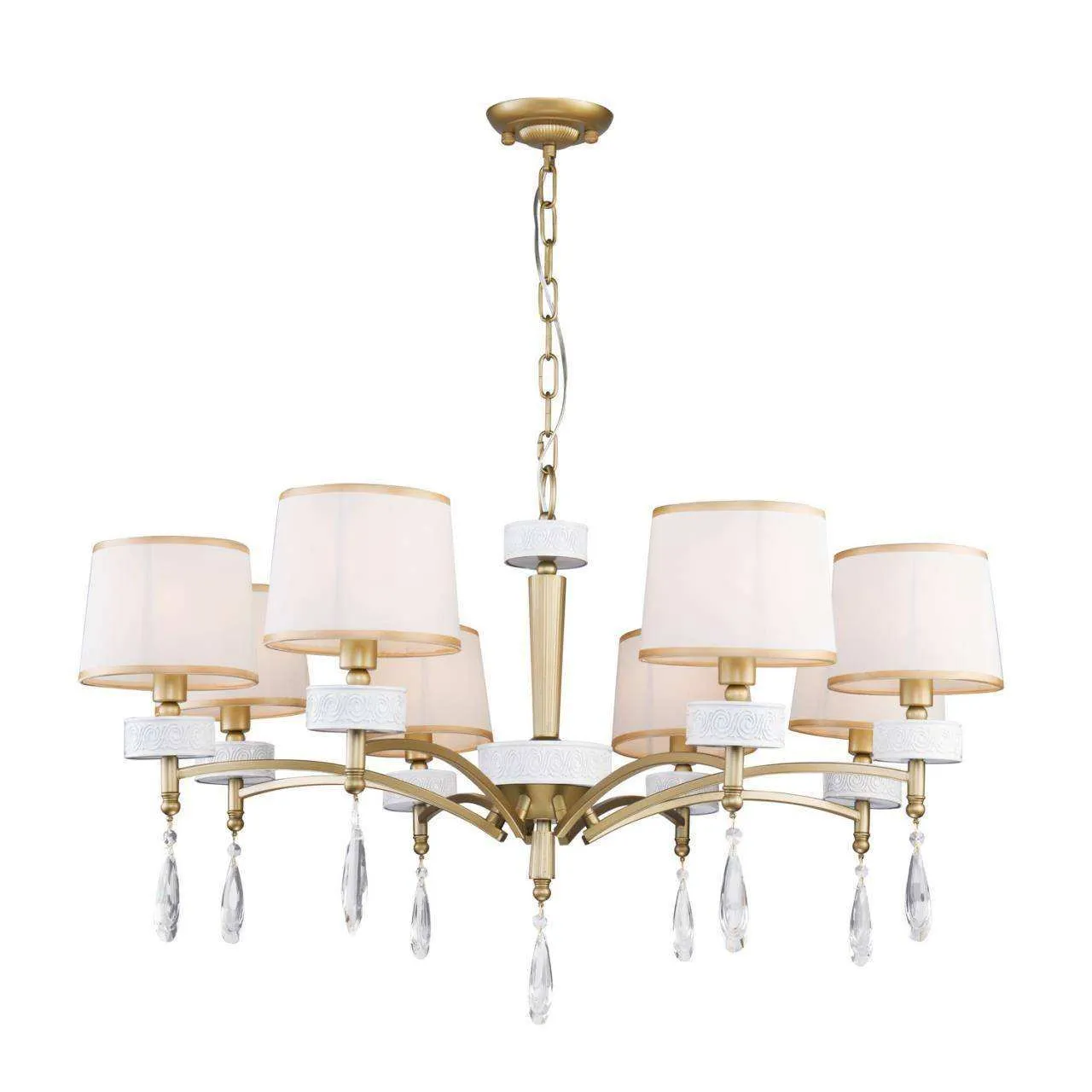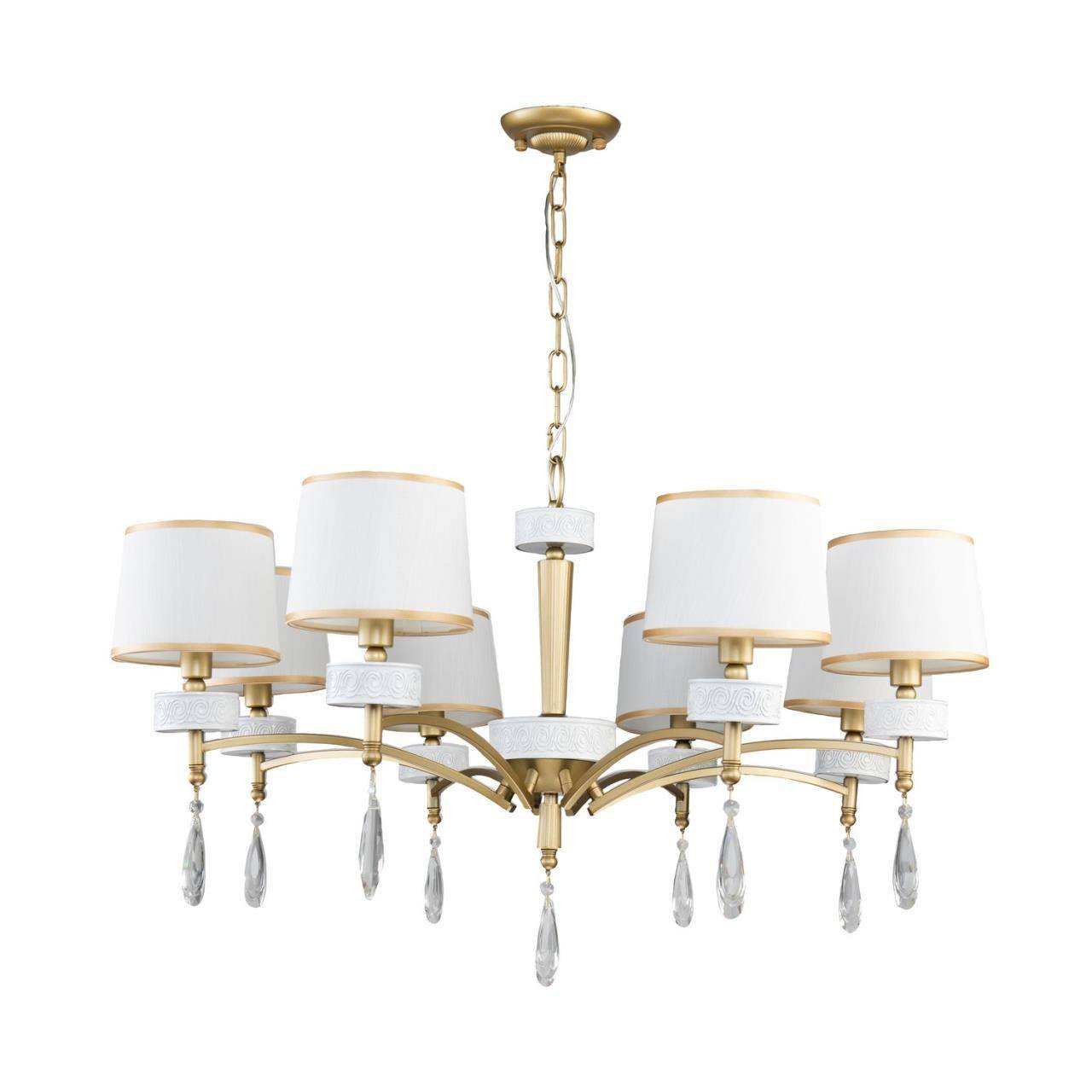 каркас светло-золотого и перламутрово-белого цвета, абажуры из белой ткани с золотой тесьмой, декоративные элементы выполнены из прозрачного хрусталя
