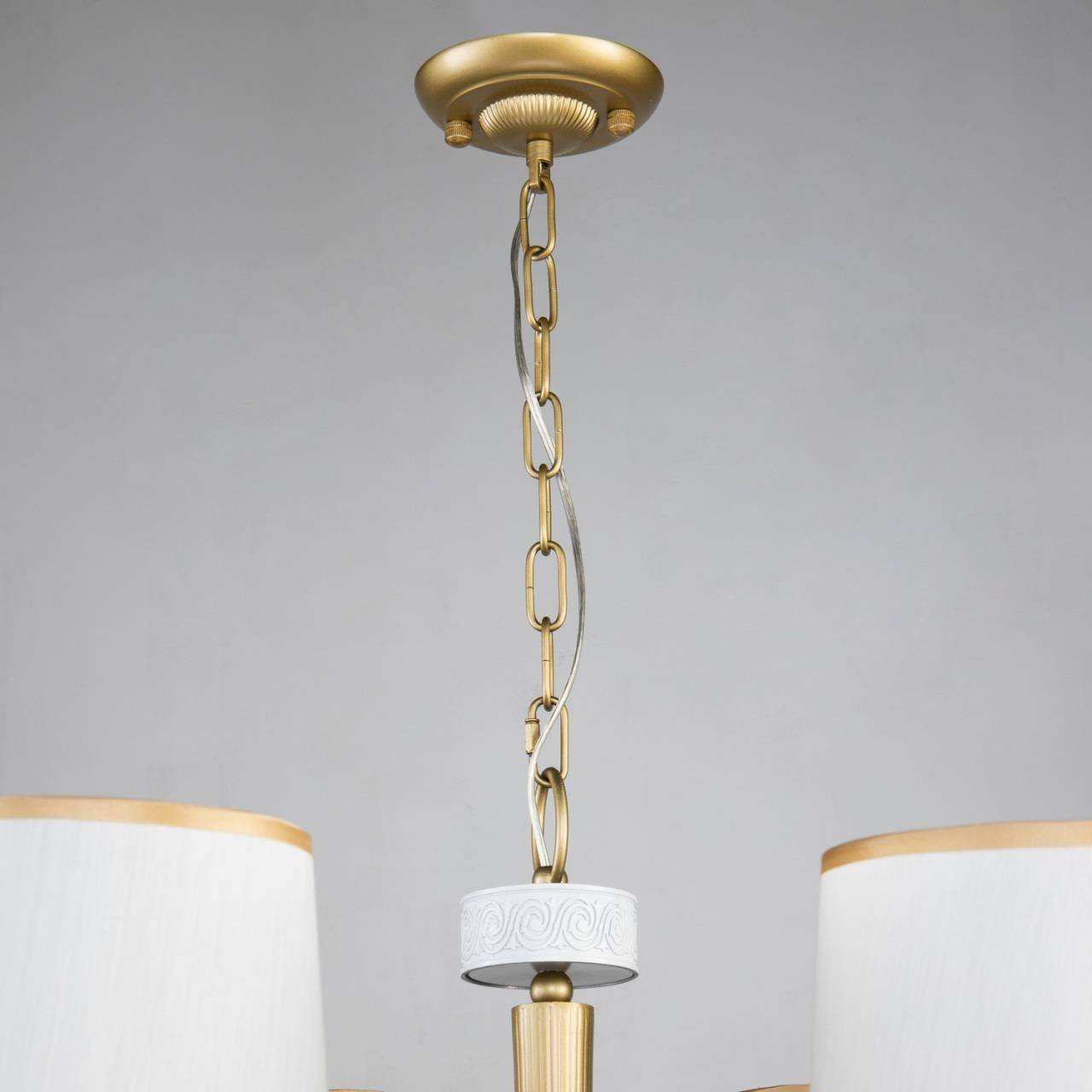 Каркас светло-золотого и перламутрово-белого цвета, абажуры из белой ткани с золотой тесьмой, декоративные элементы выполнены из прозрачного хрусталя