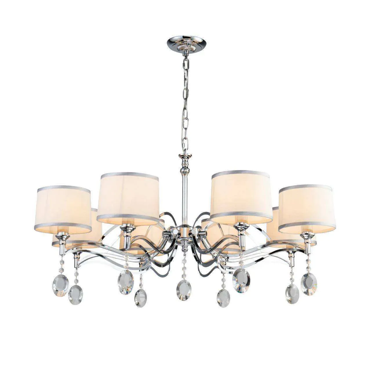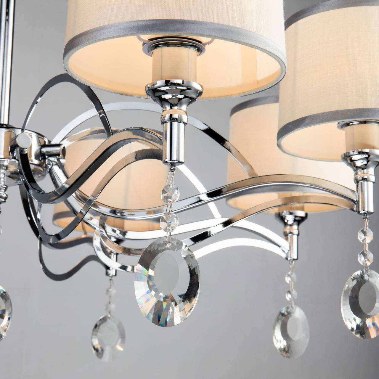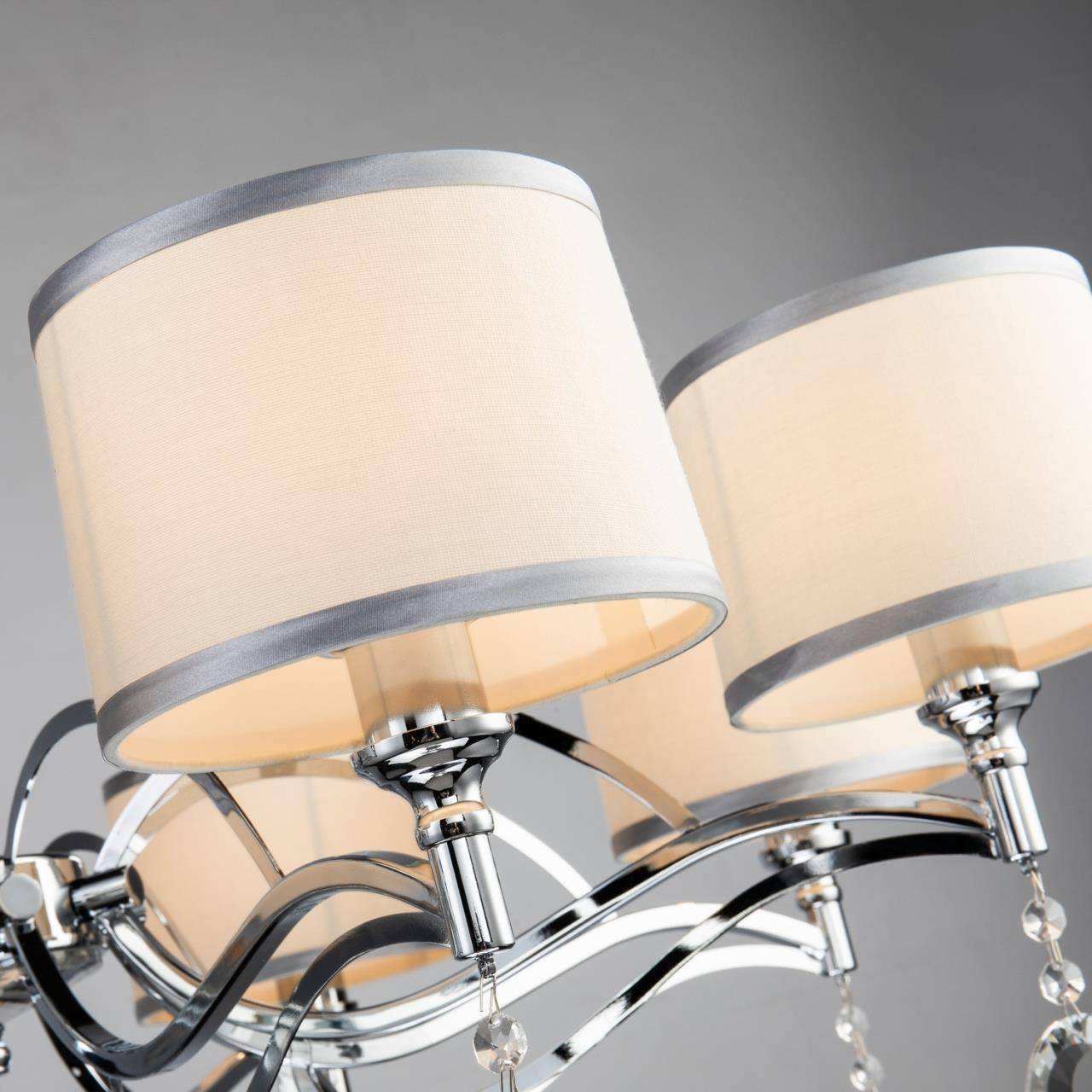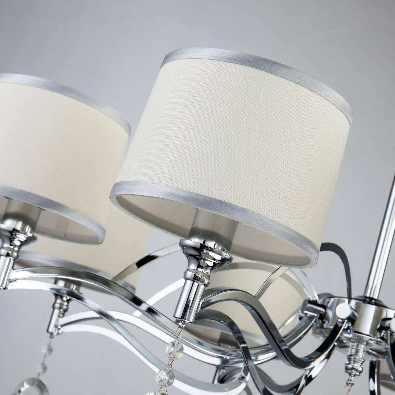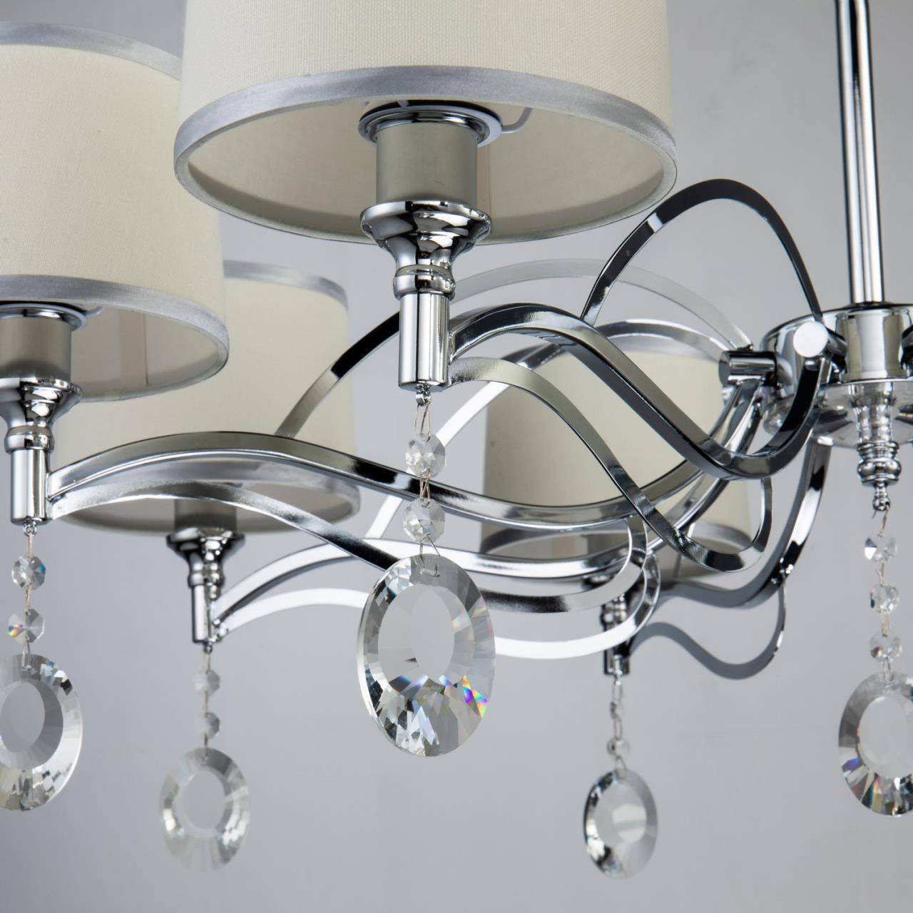 каркас цвета хром, абажуры из белой ткани с серебряной тесьмой, декоративные элементы из прозрачного хрусталя