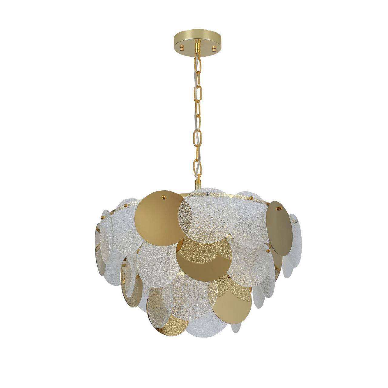 каркас золотого цвета, каскад из декоративных дисков, выполненных из прозрачного стекла и металла