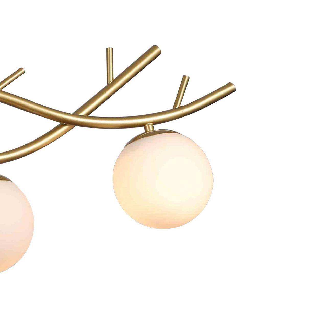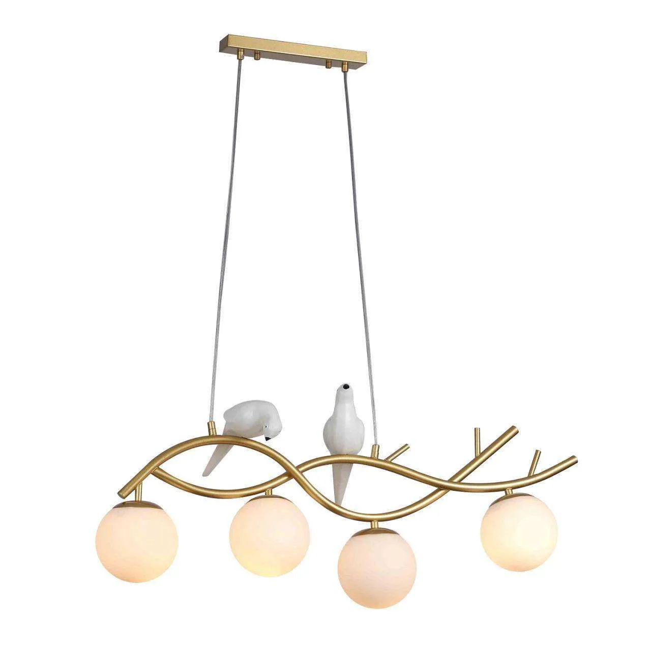 каркас цвета матового золота, стеклянные плафоны кремового цвета, декоративный элемент в виде белой птицы