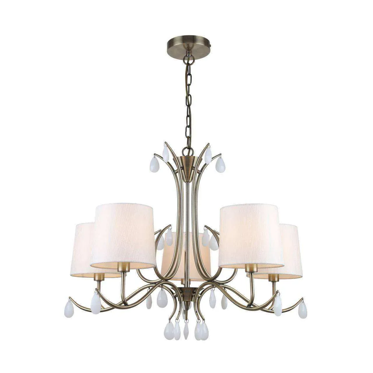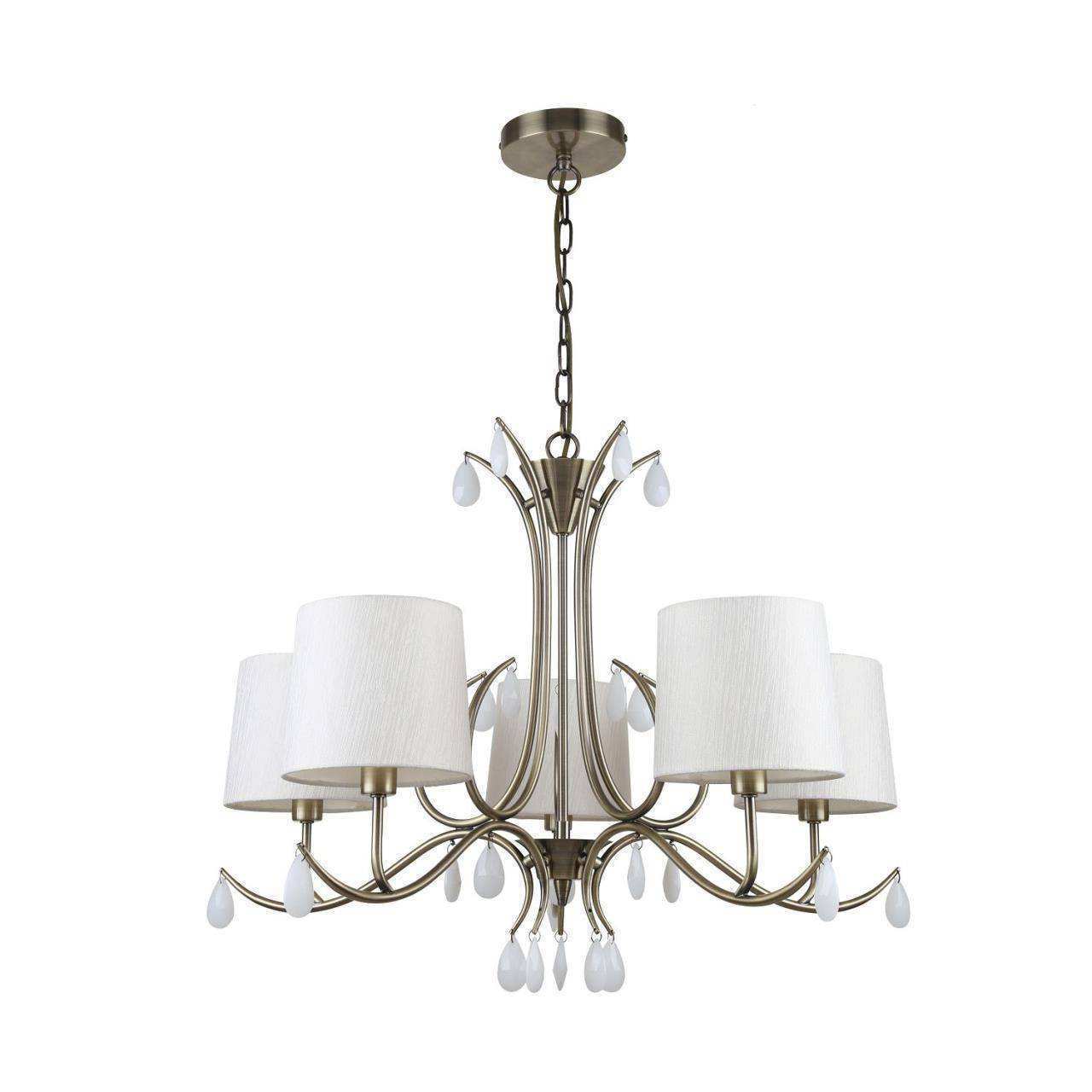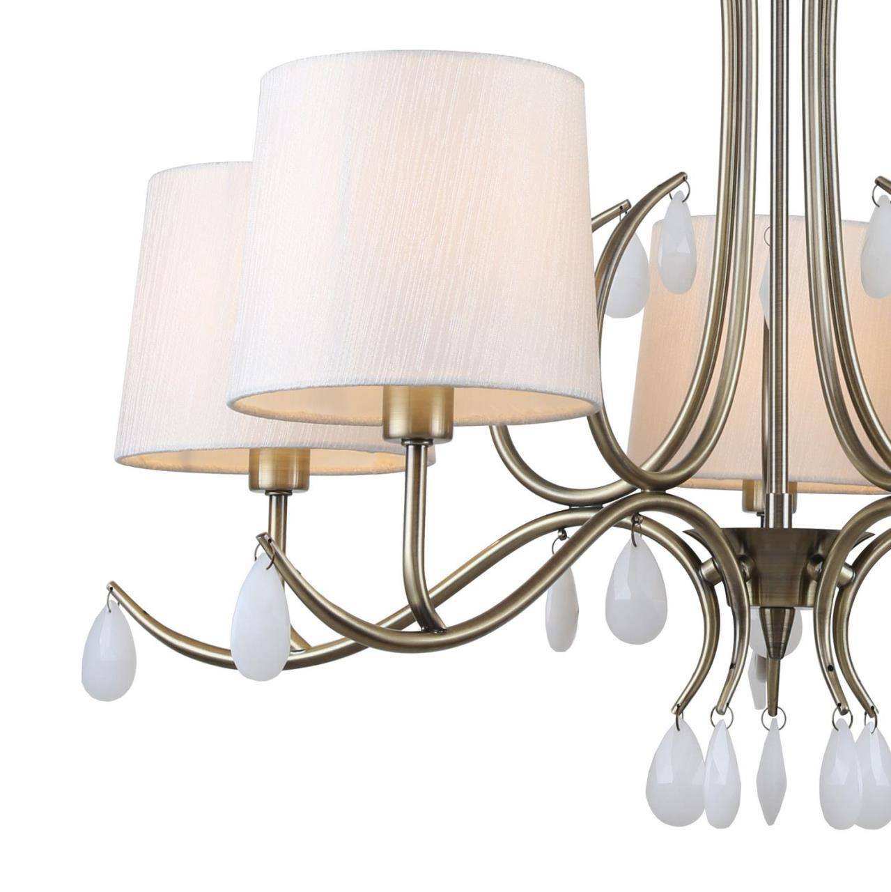 Каркас цвета античная латунь, плафоны из ткани кремового цвета, декоративные элементы в виде хрустальных подвесок