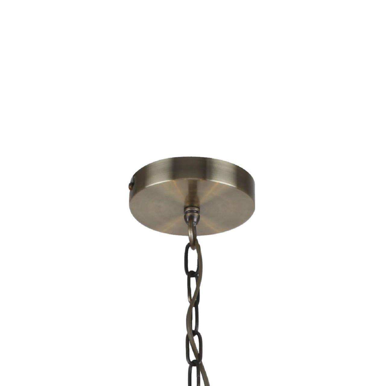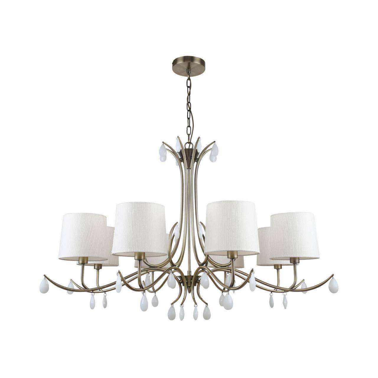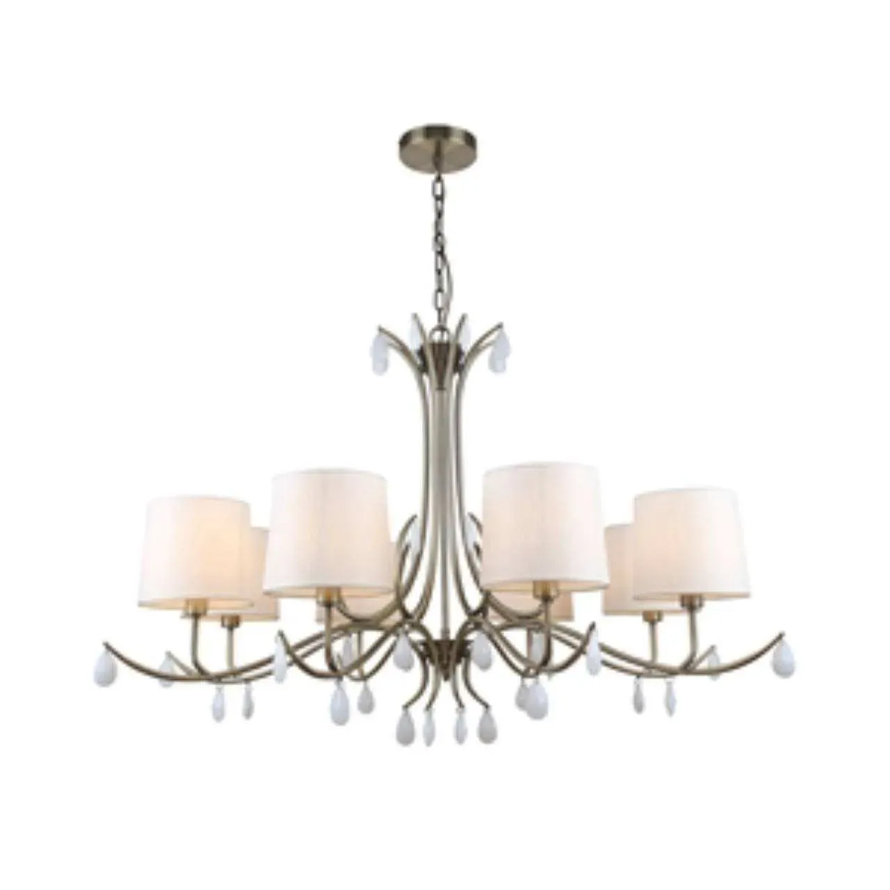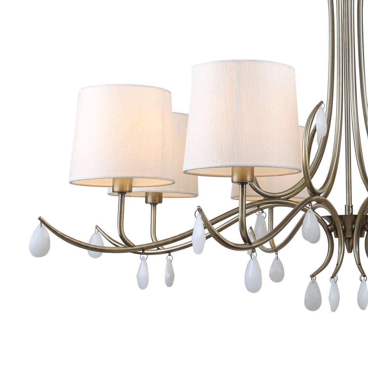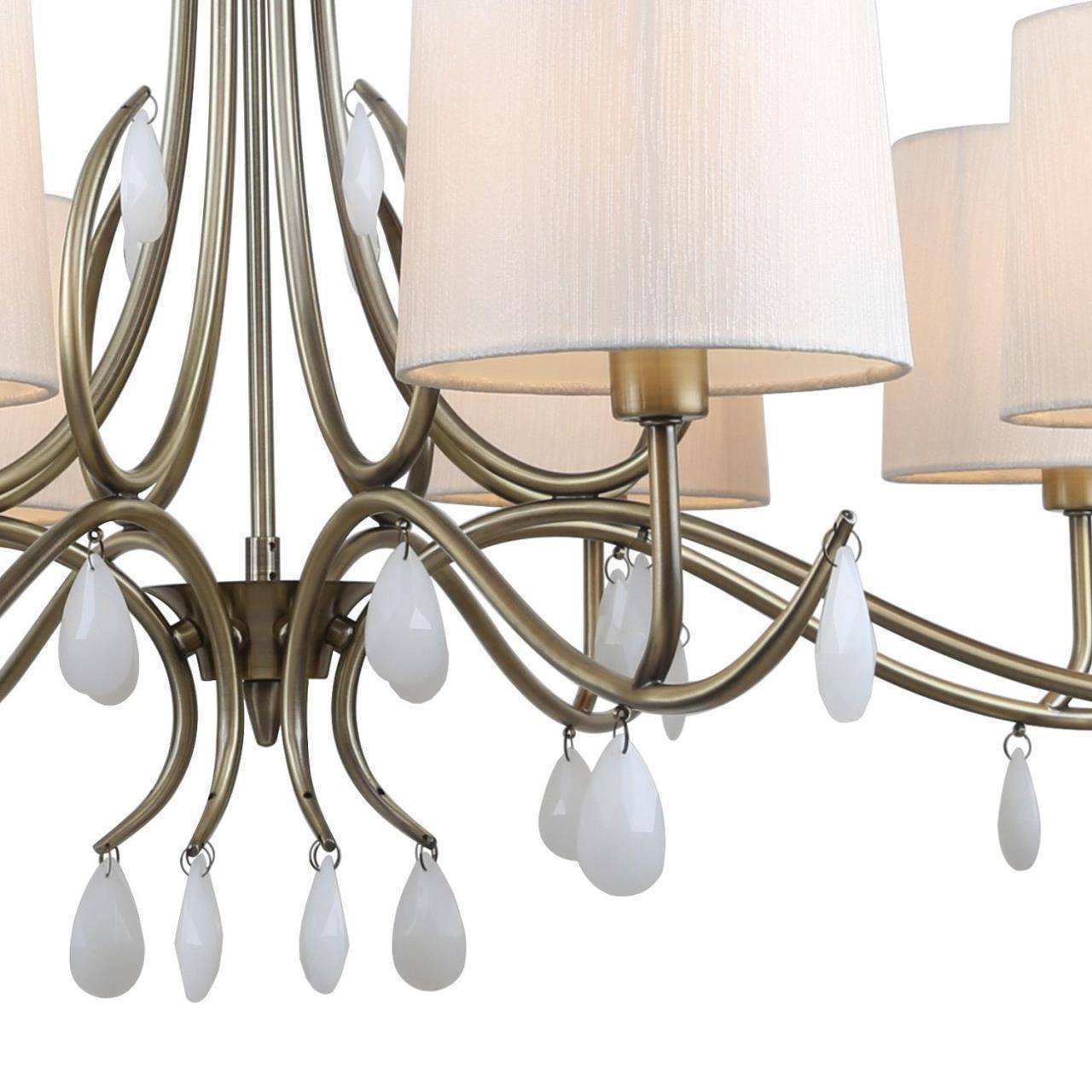 Каркас цвета античная латунь, плафоны из ткани кремового цвета, декоративные элементы в виде подвесок из белого стекла