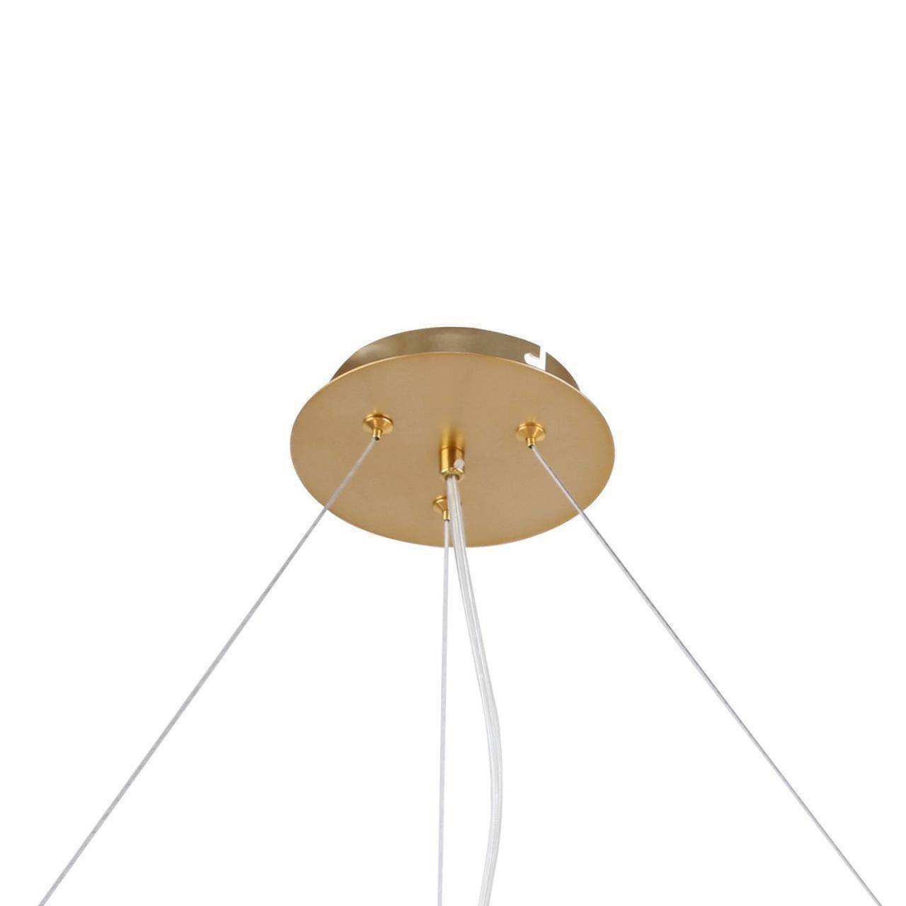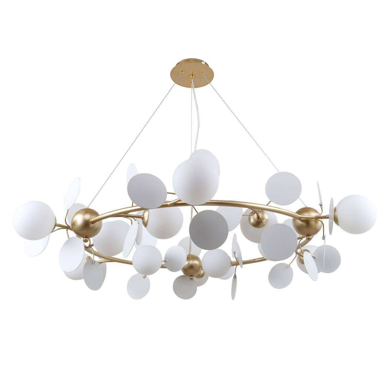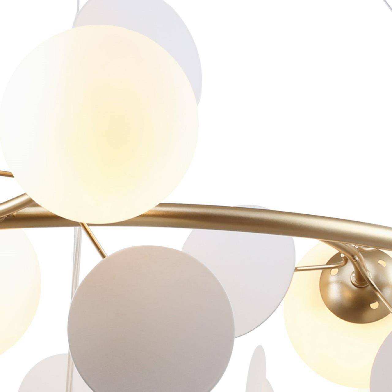 Каркас золотого цвета, круглые стеклянные плафоны молочного цвета, декоративные круглые белые пластины, декоративные золотые шары