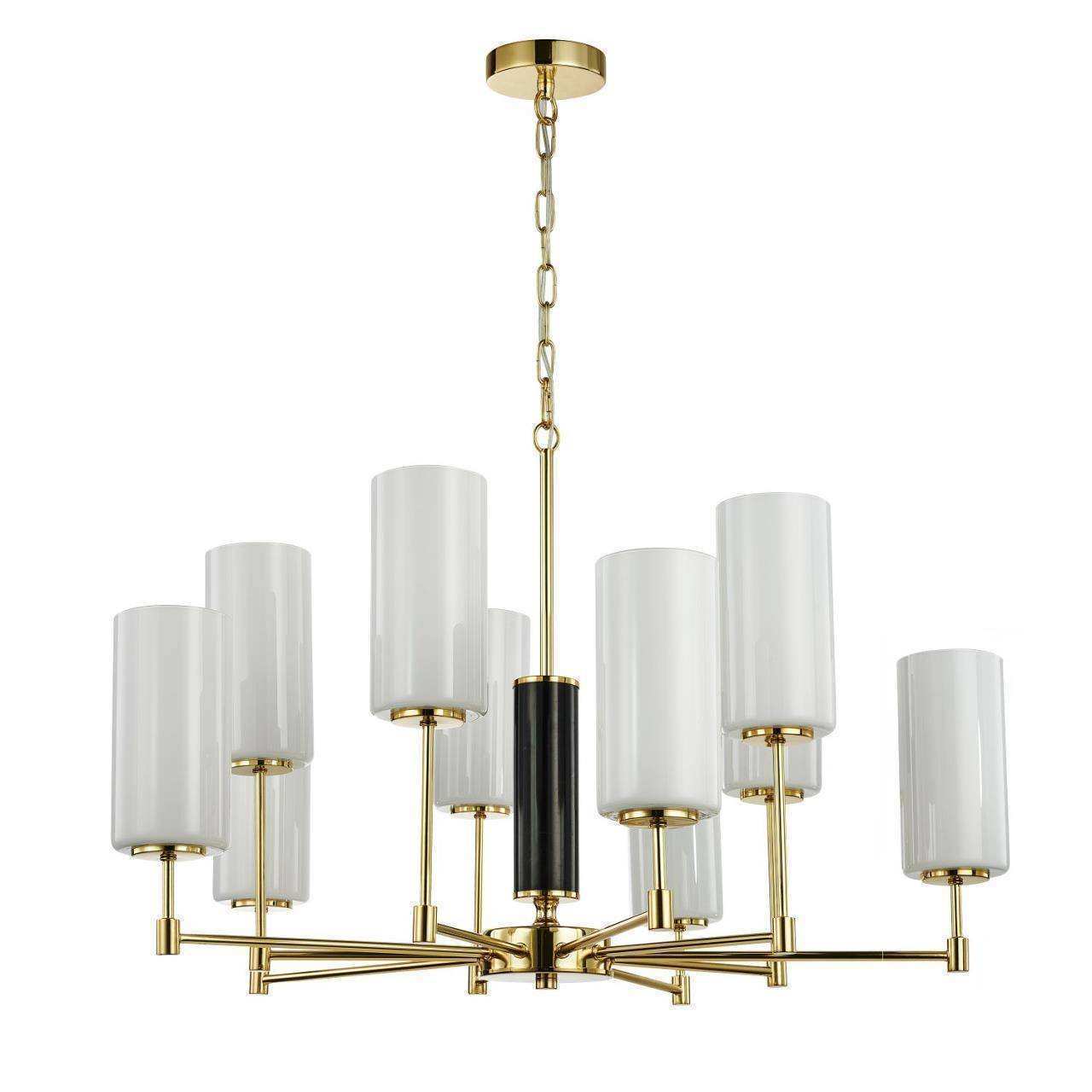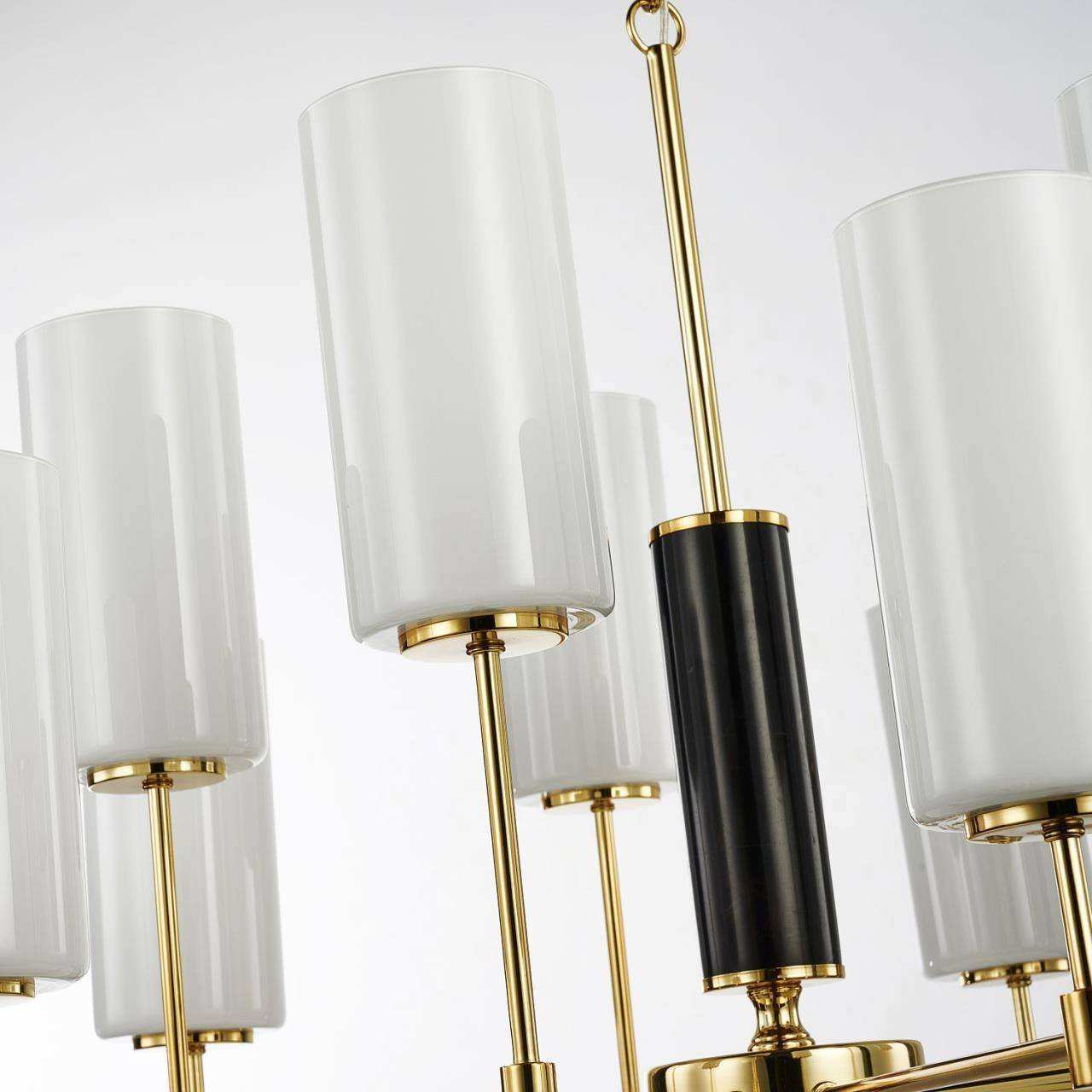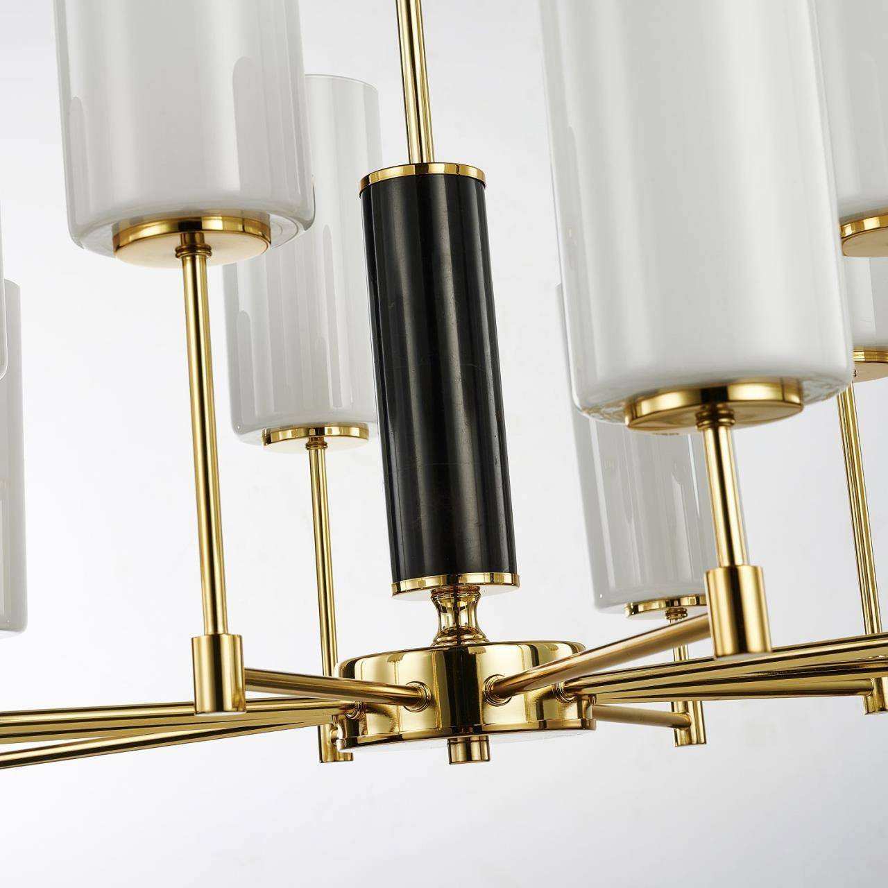 Каркас золотого цвета, плафоны из белого матового стекла, декоративный элемент из черного мрамора