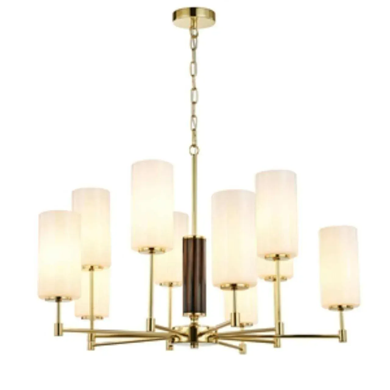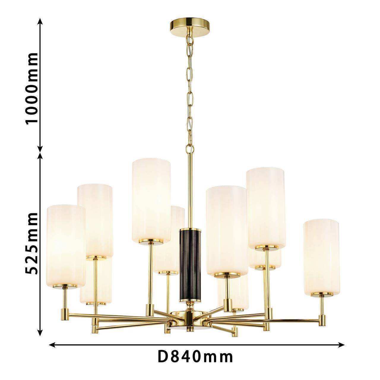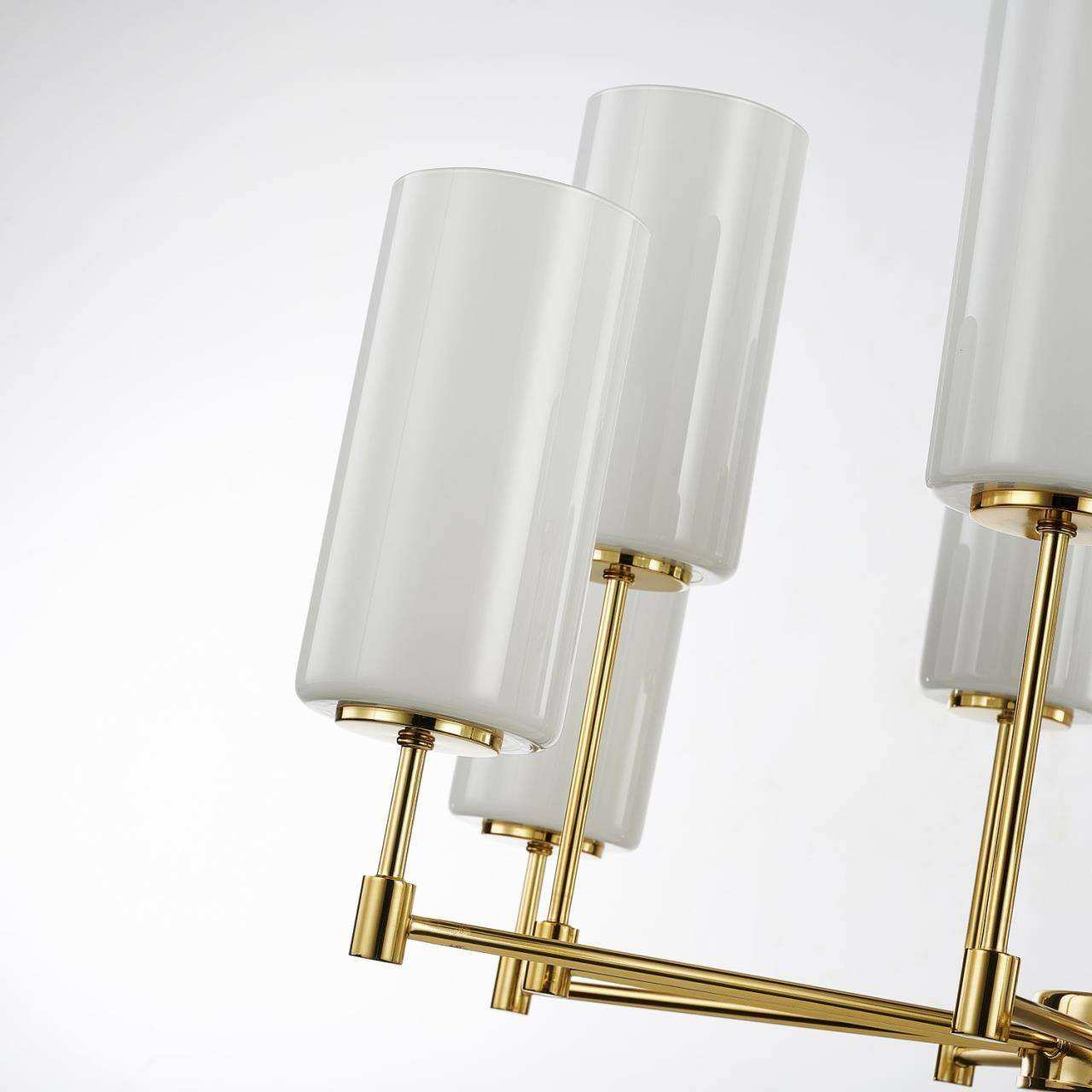 Каркас золотого цвета, плафоны из белого матового стекла, декоративный элемент из черного мрамора
