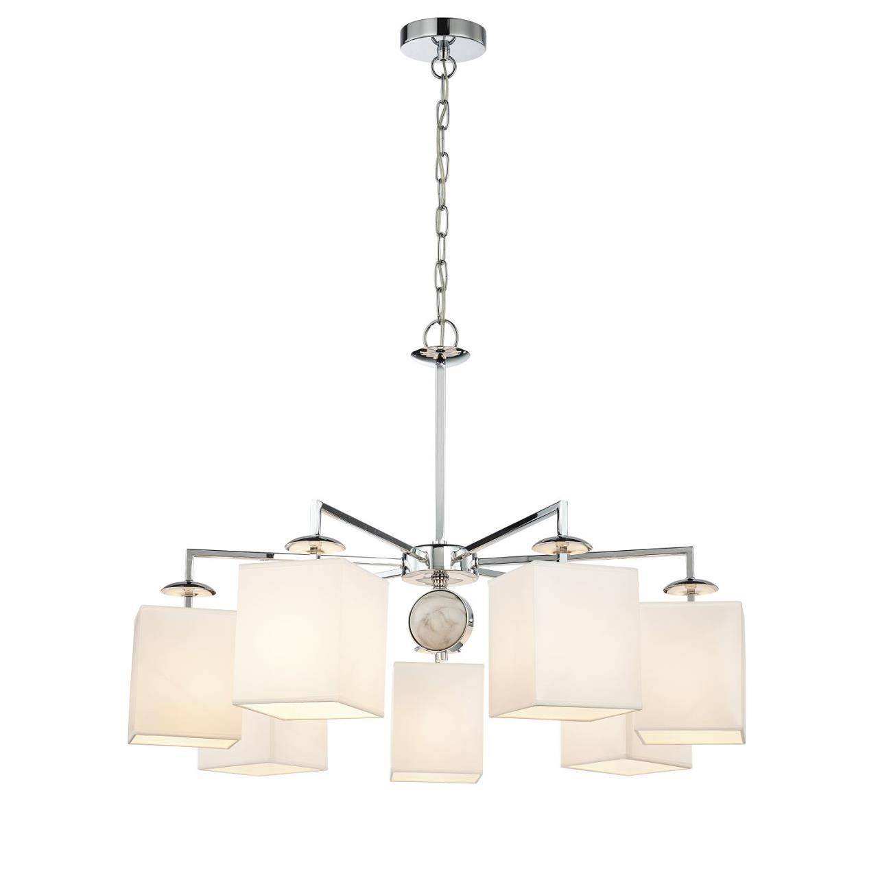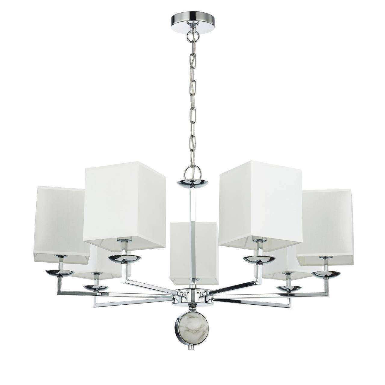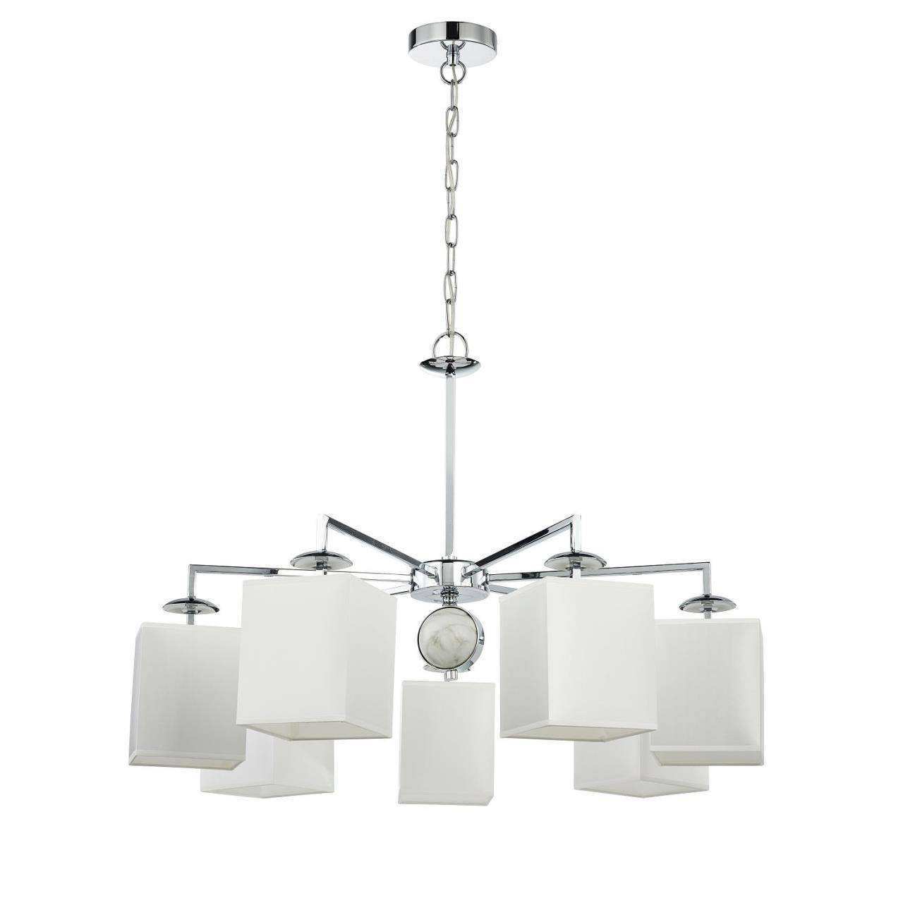 Каркас цвета хром, плафоны из белой ткани, декор - имитация белого мрамора, каркас можно монтировать как вверх, так и вниз плафонами.