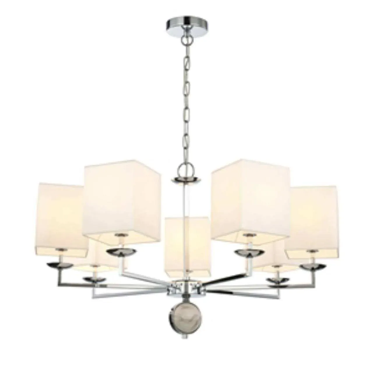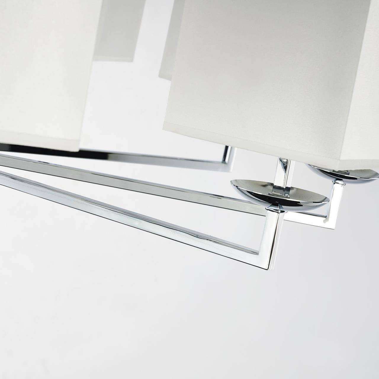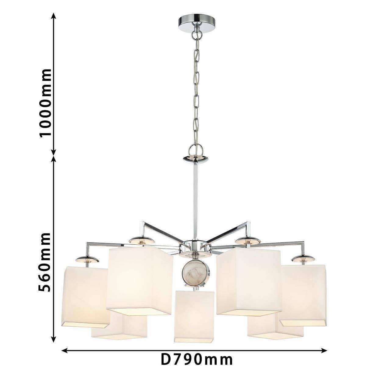 Каркас цвета хром, плафоны из белой ткани, декор - имитация белого мрамора, каркас можно монтировать как вверх, так и вниз плафонами.