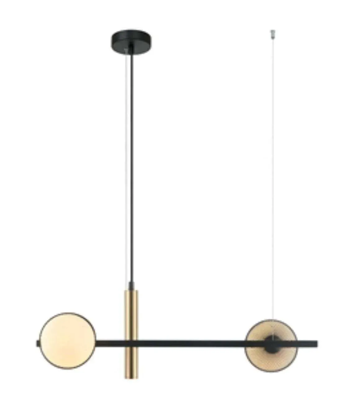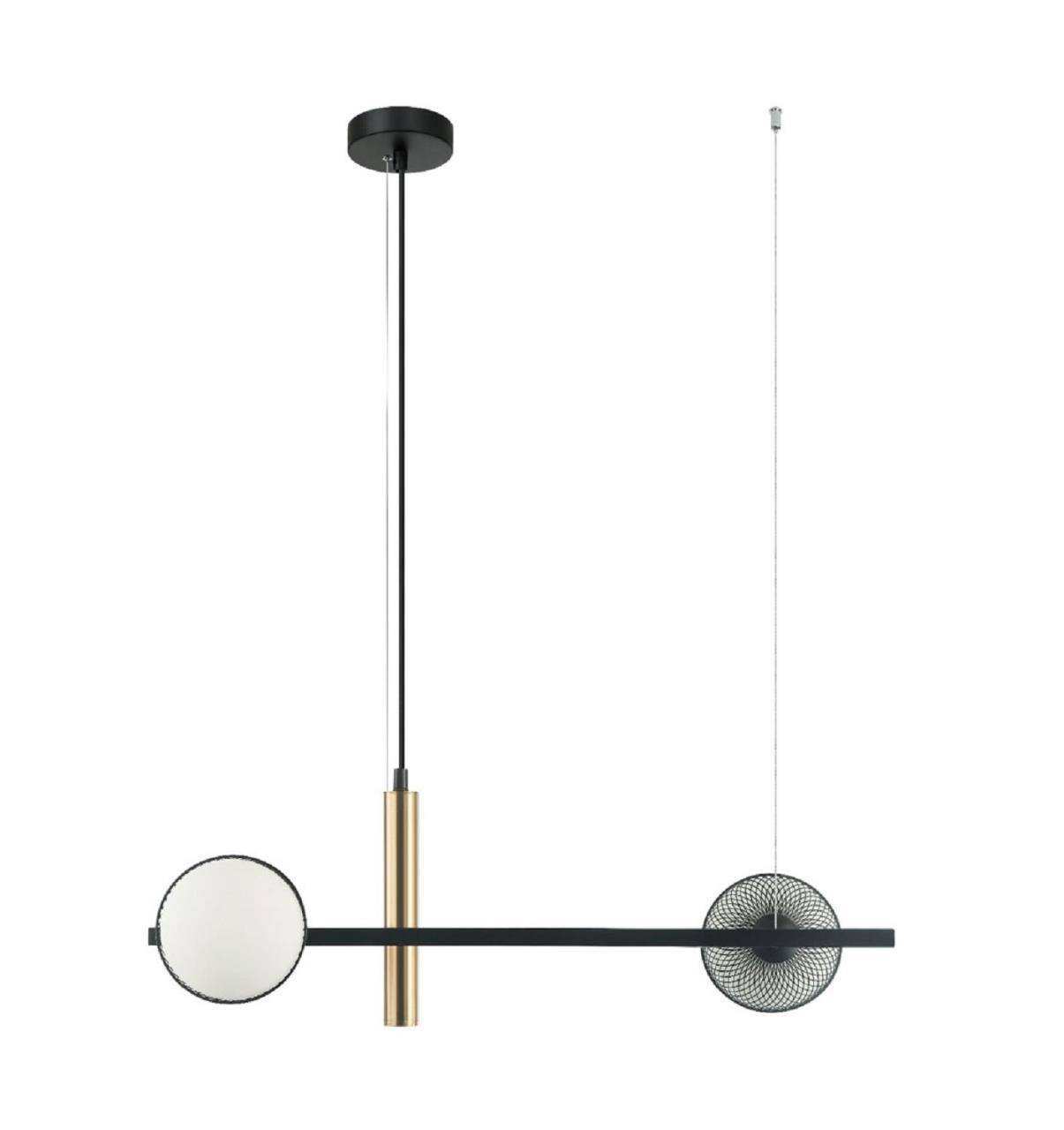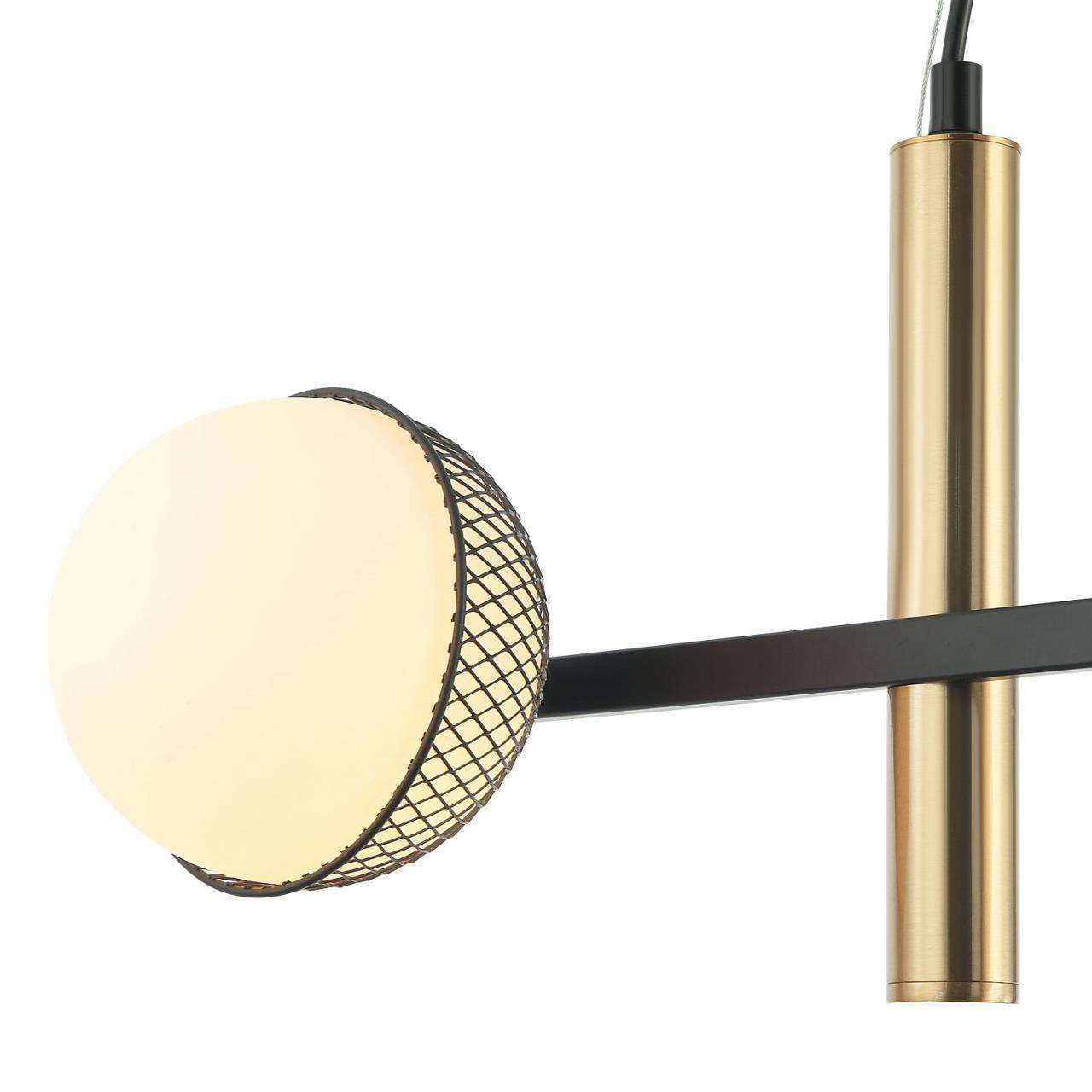 Каркас черного цвета с декором цвета латуни, плафоны из матового белого стекла