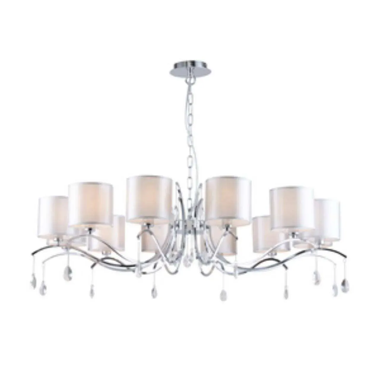 Каркас цвета хром, плафоны из светло-серой ткани, декоративный элемент в виде подвесок с хрусталем