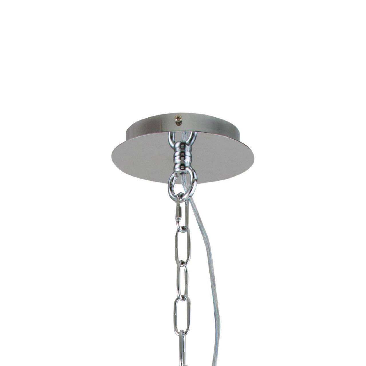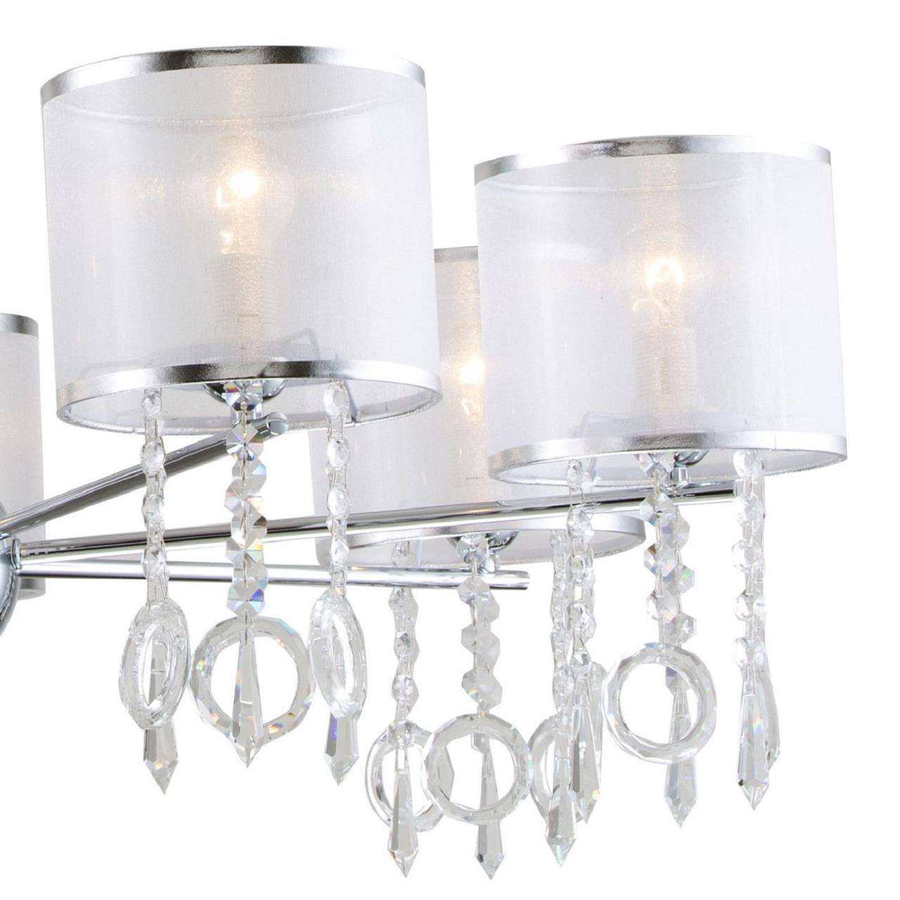 Каркас цвета хром, плафоны из органзы белого цвета, декоративные элементы из стекла и хрусталя