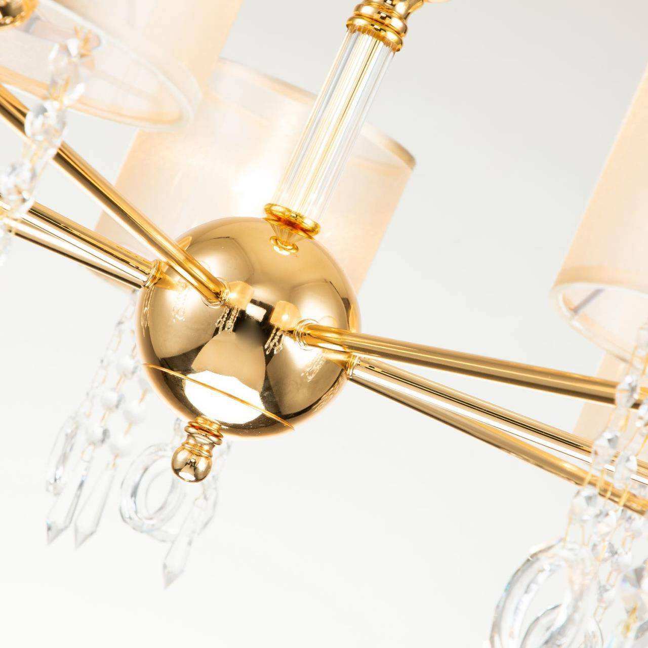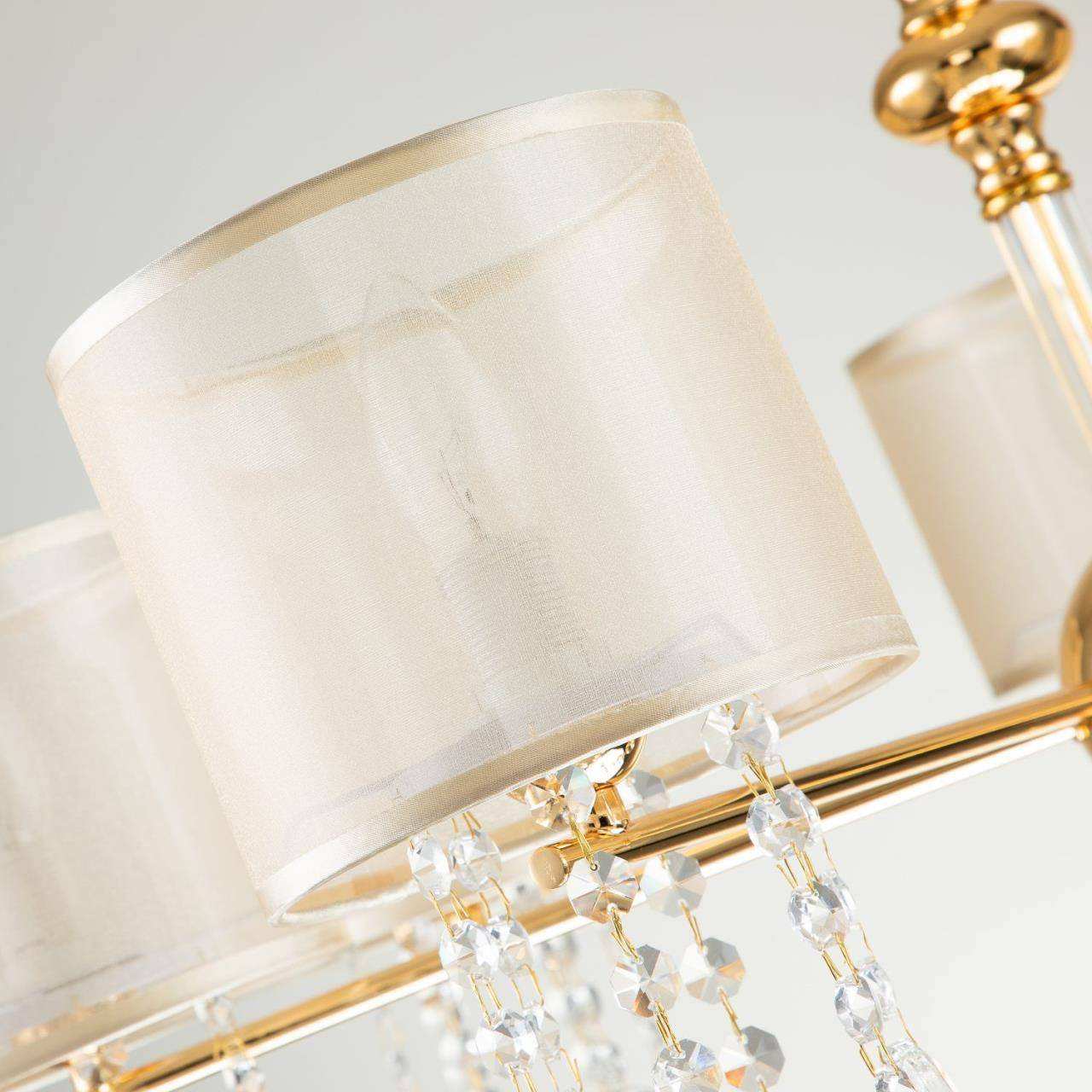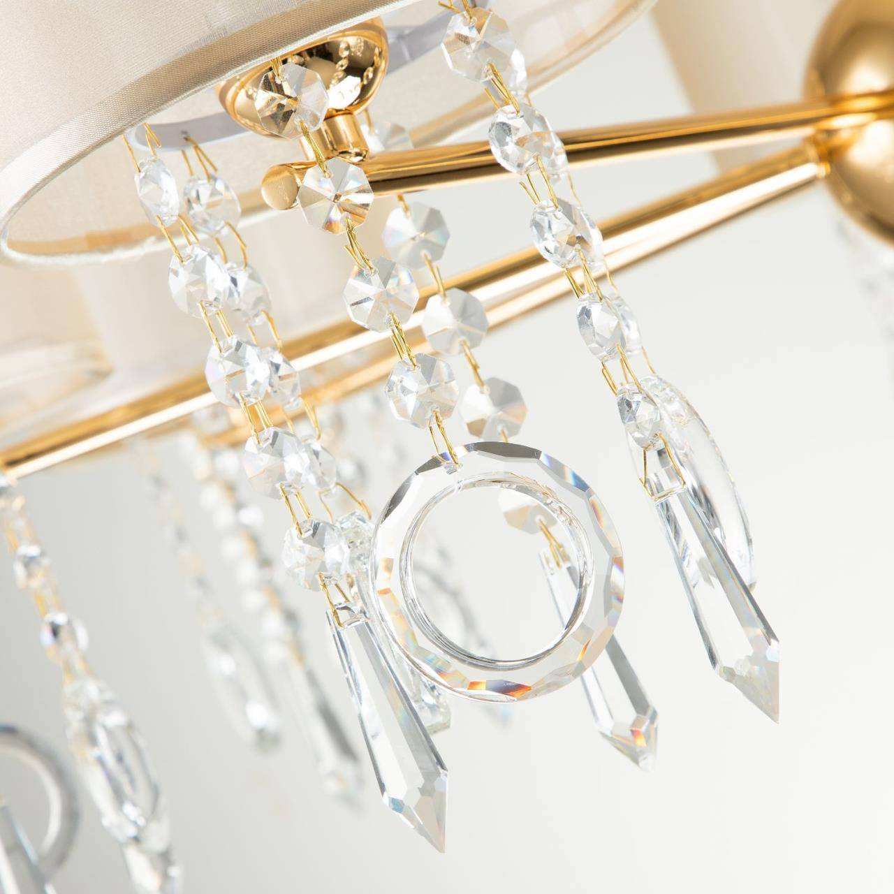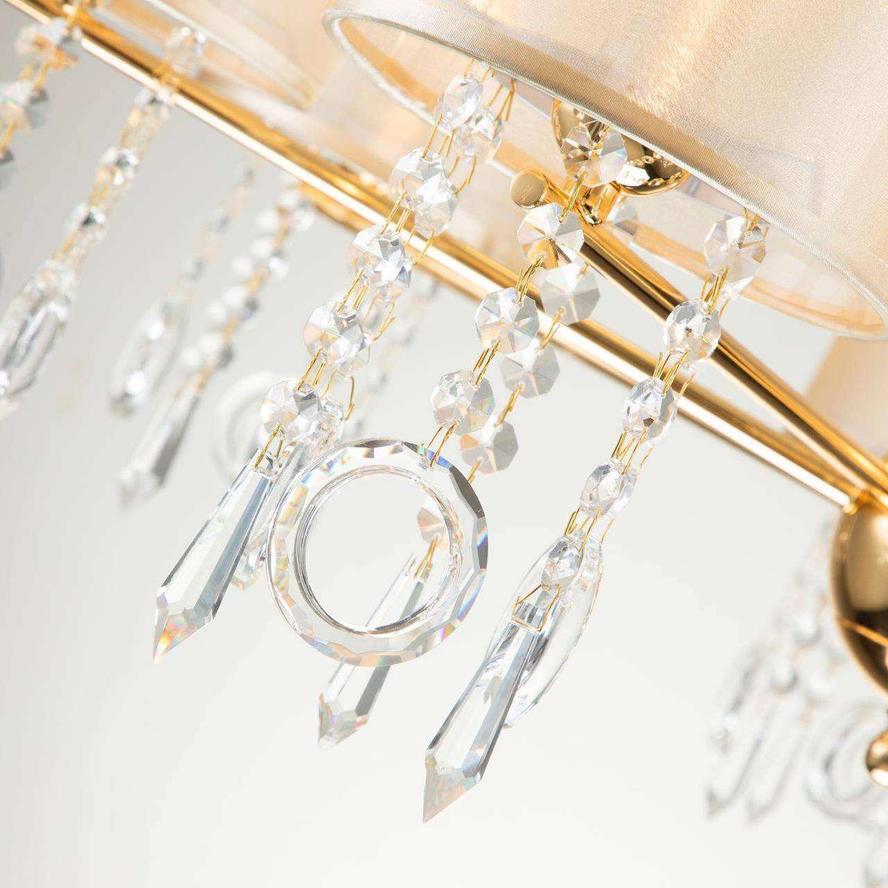 Каркас золотого цвета, плафон из органзы янтарного цвета, декоративные элементы из стекла и хрусталя