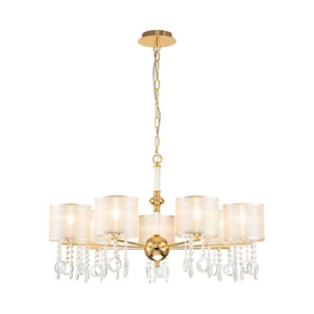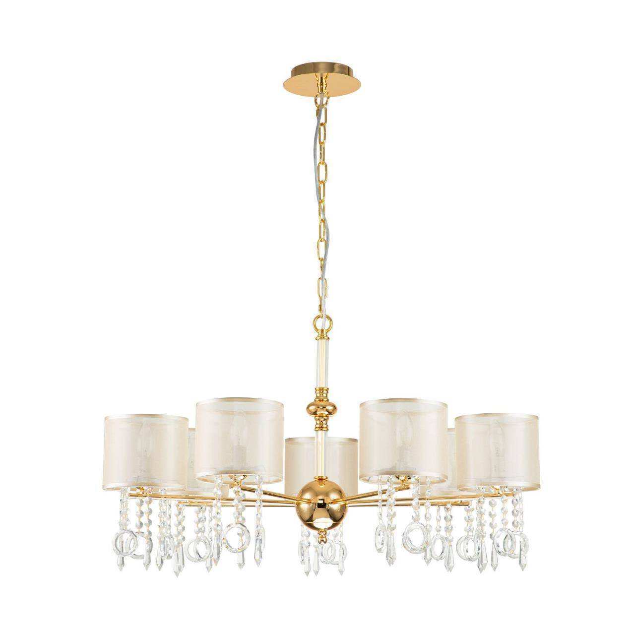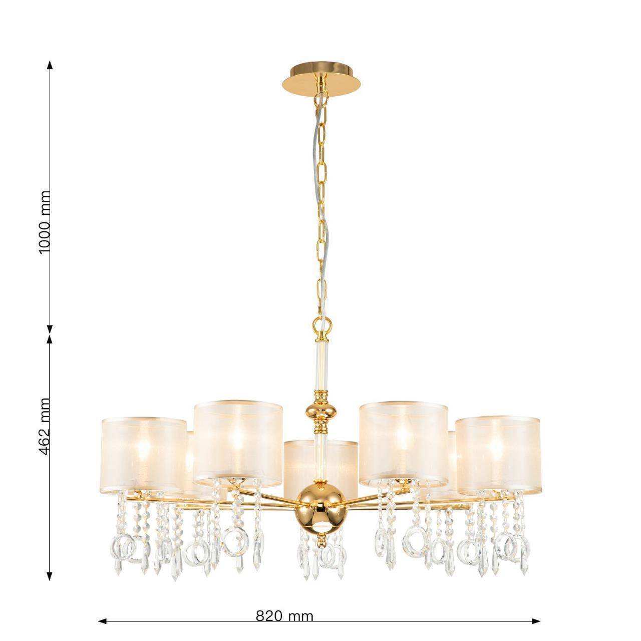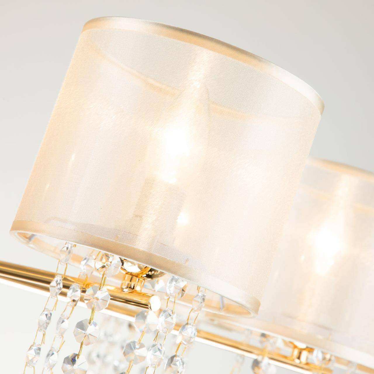 Каркас золотого цвета, плафон из органзы янтарного цвета, декоративные элементы из стекла и хрусталя