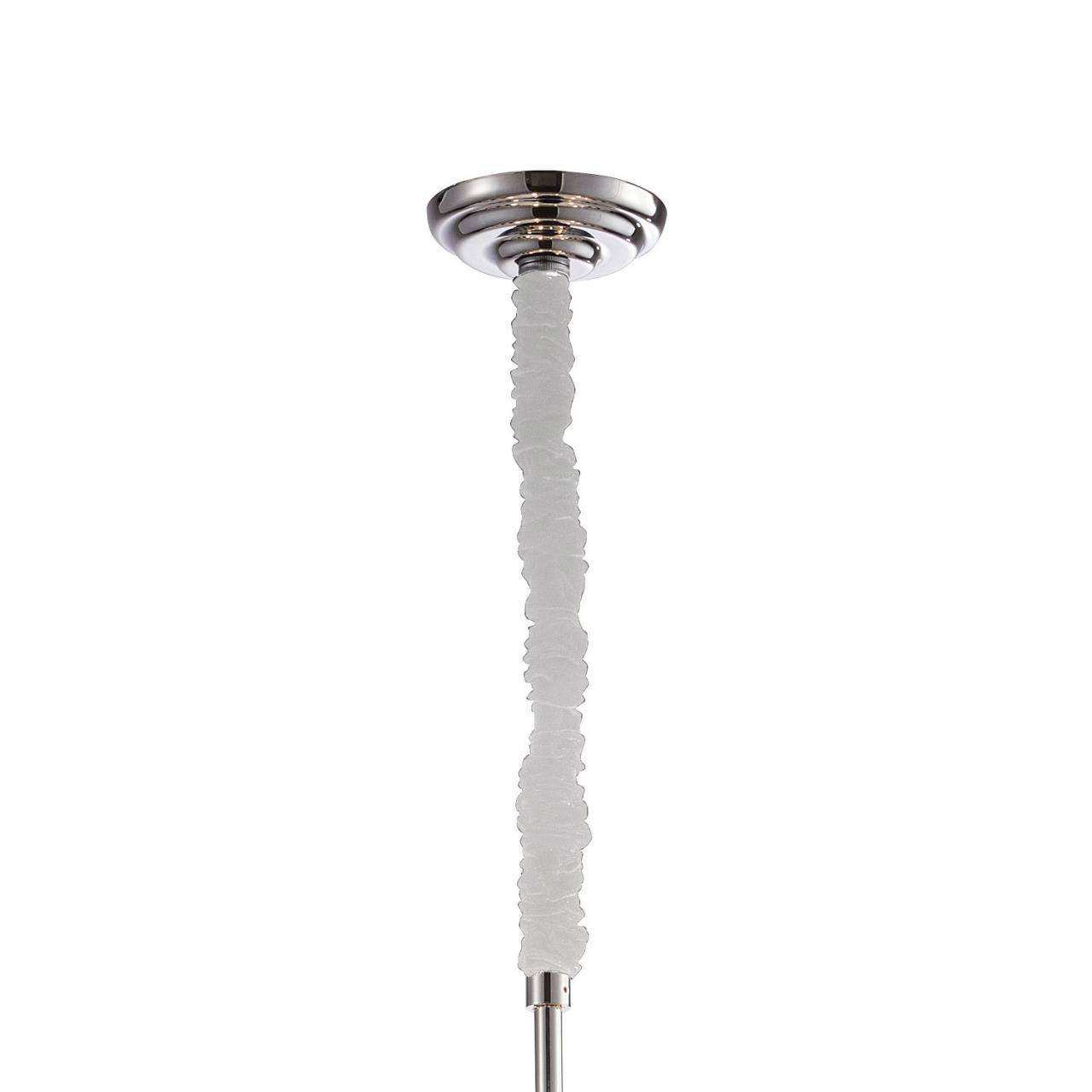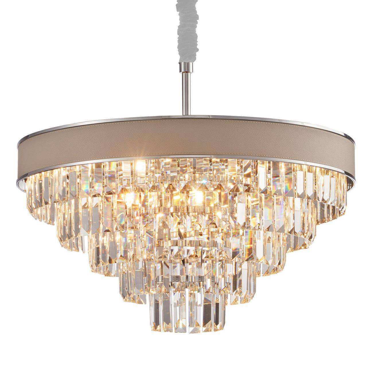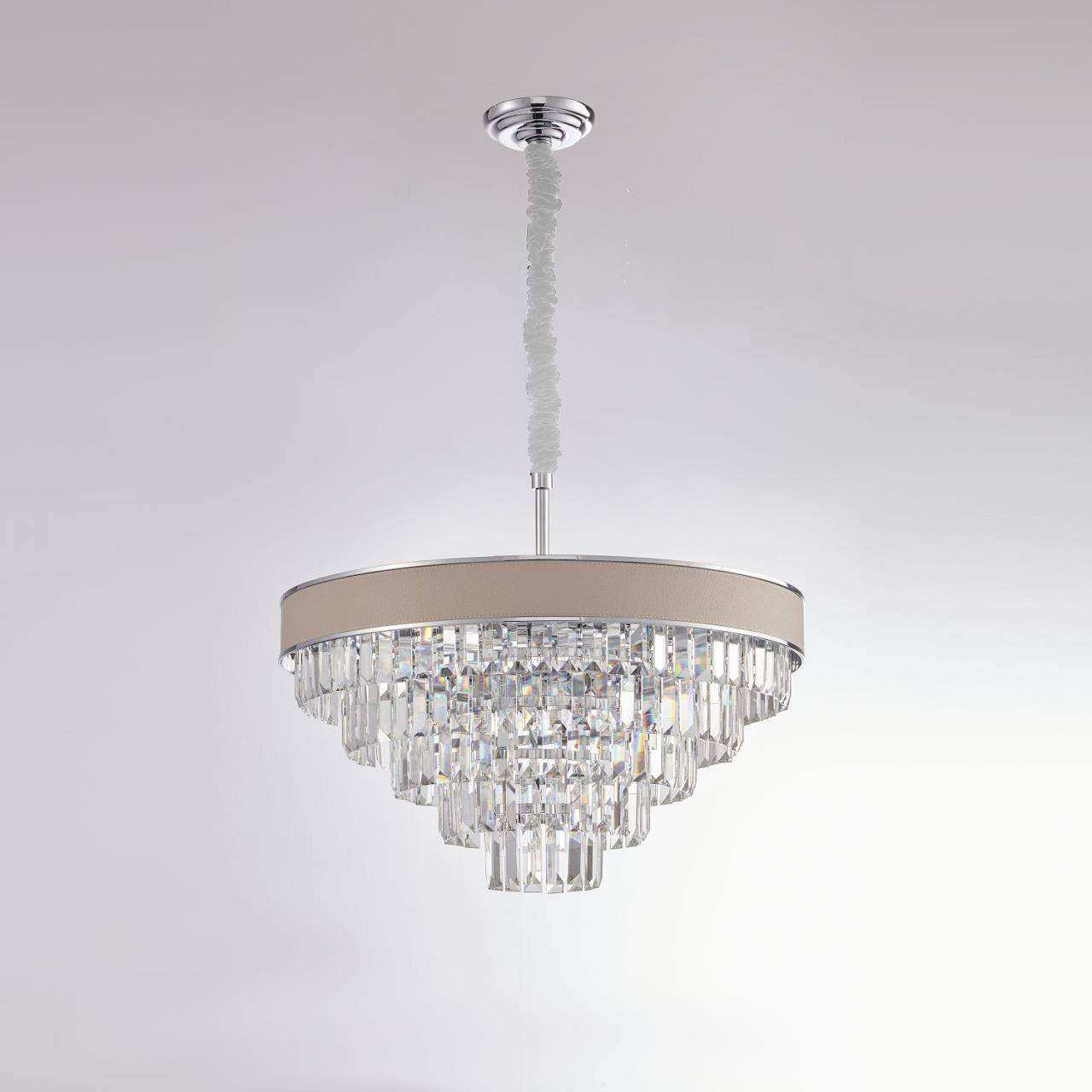 каркас цвета хром, плафон состоит из каскада хрустальных подвесок, обод светильника декорирован экокожей цвета слоновой кости