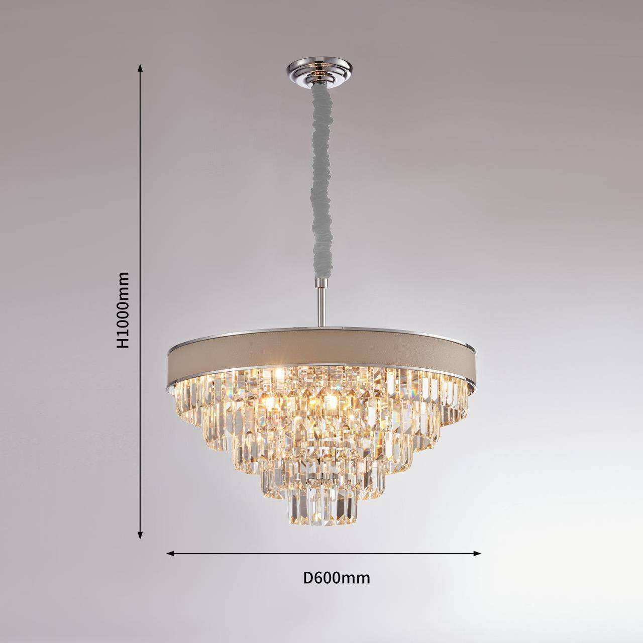 Каркас цвета хром, плафон состоит из каскада хрустальных подвесок, обод светильника декорирован экокожей цвета слоновой кости