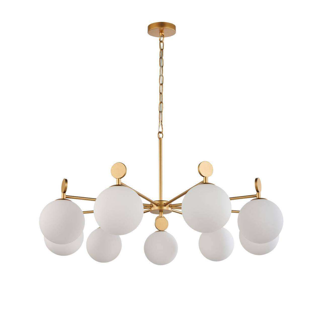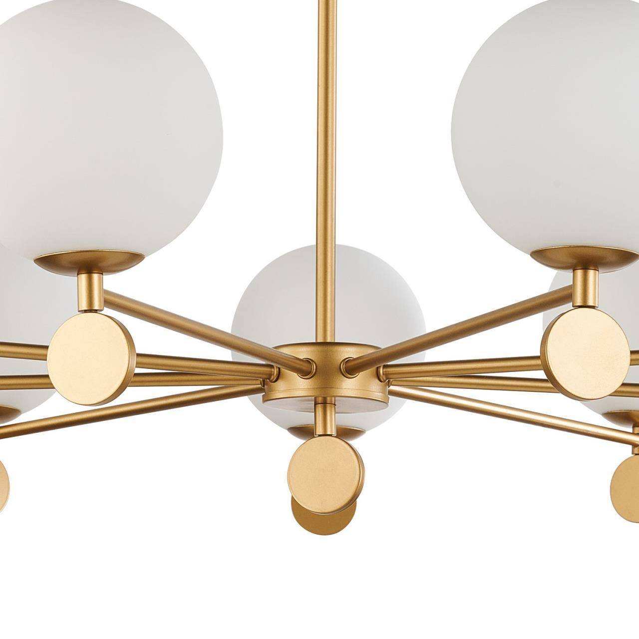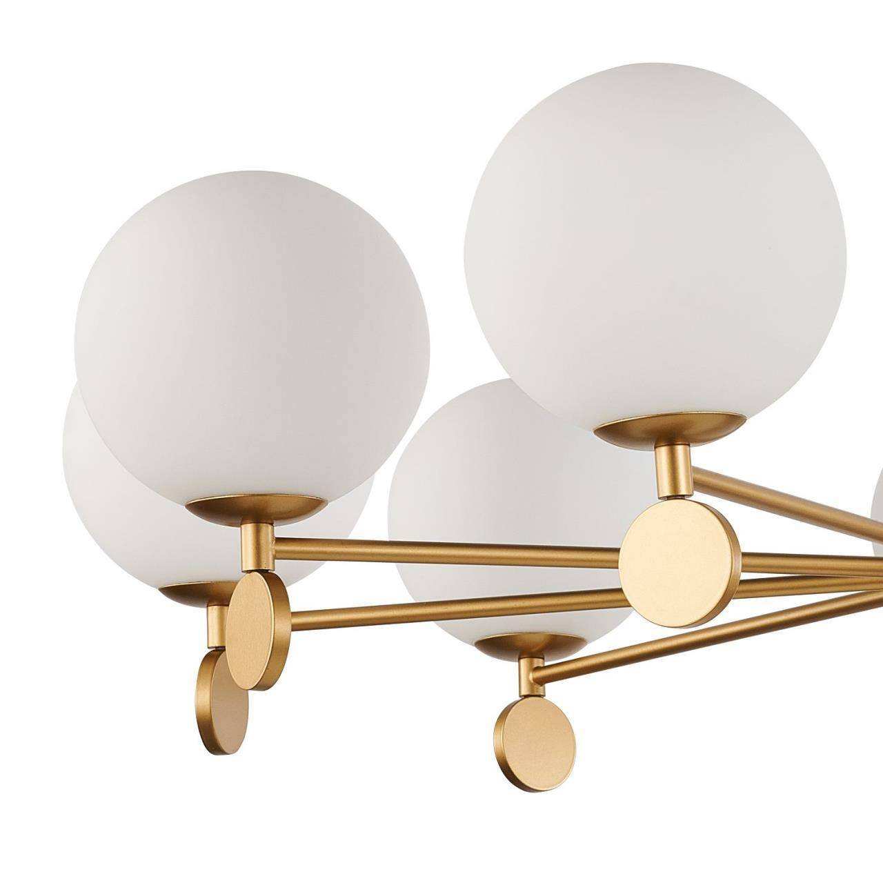 Каркас золотого цвета, плафоны из стекла цвета опала, люстру можно монтировать плафонами вверх или вниз