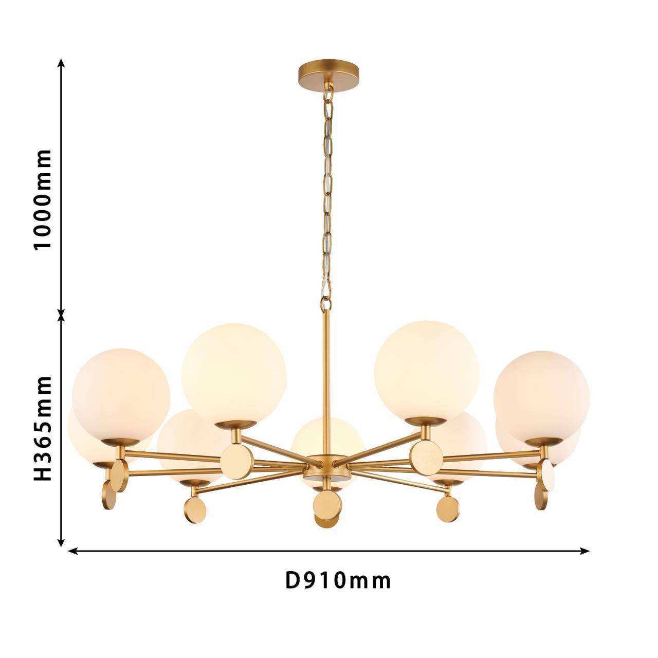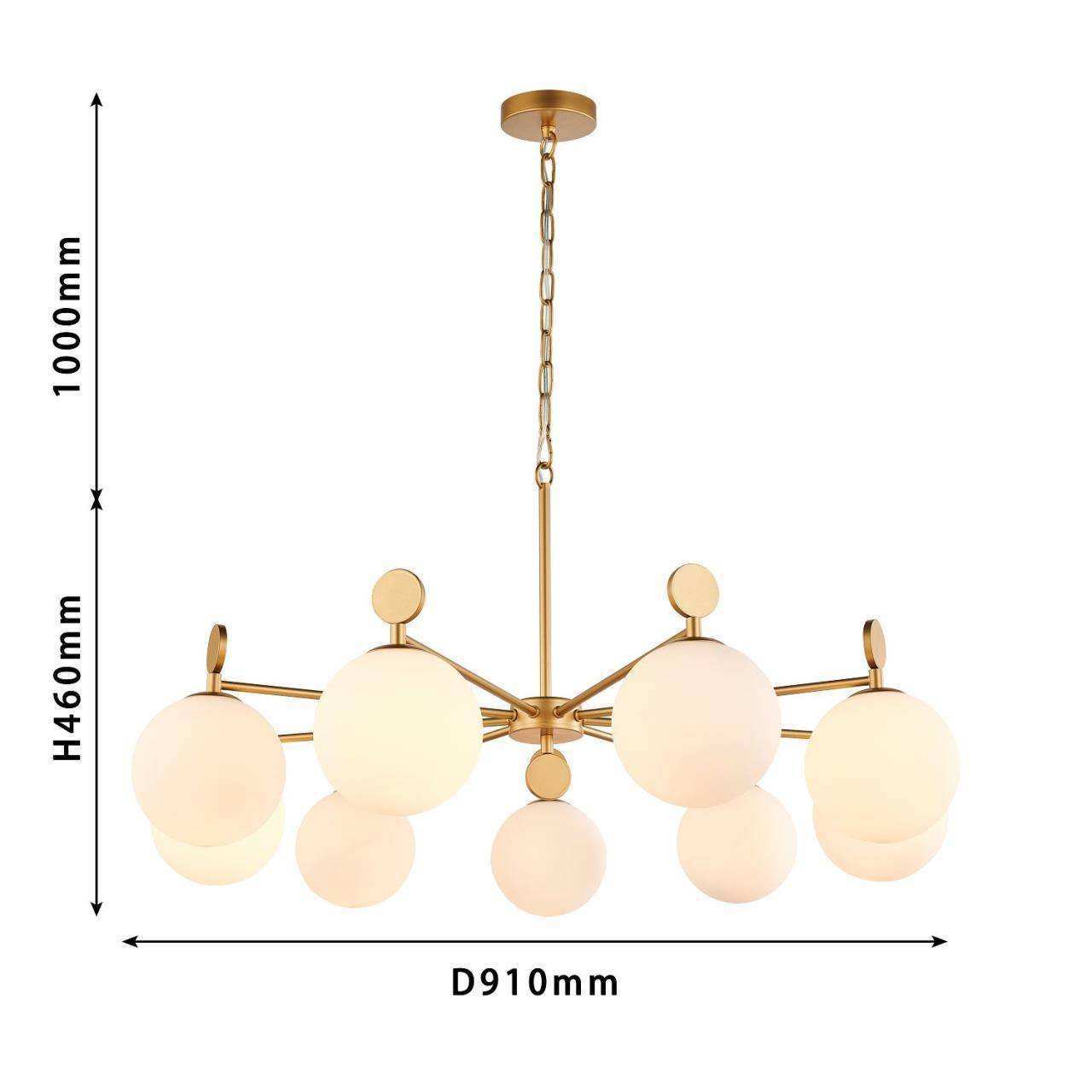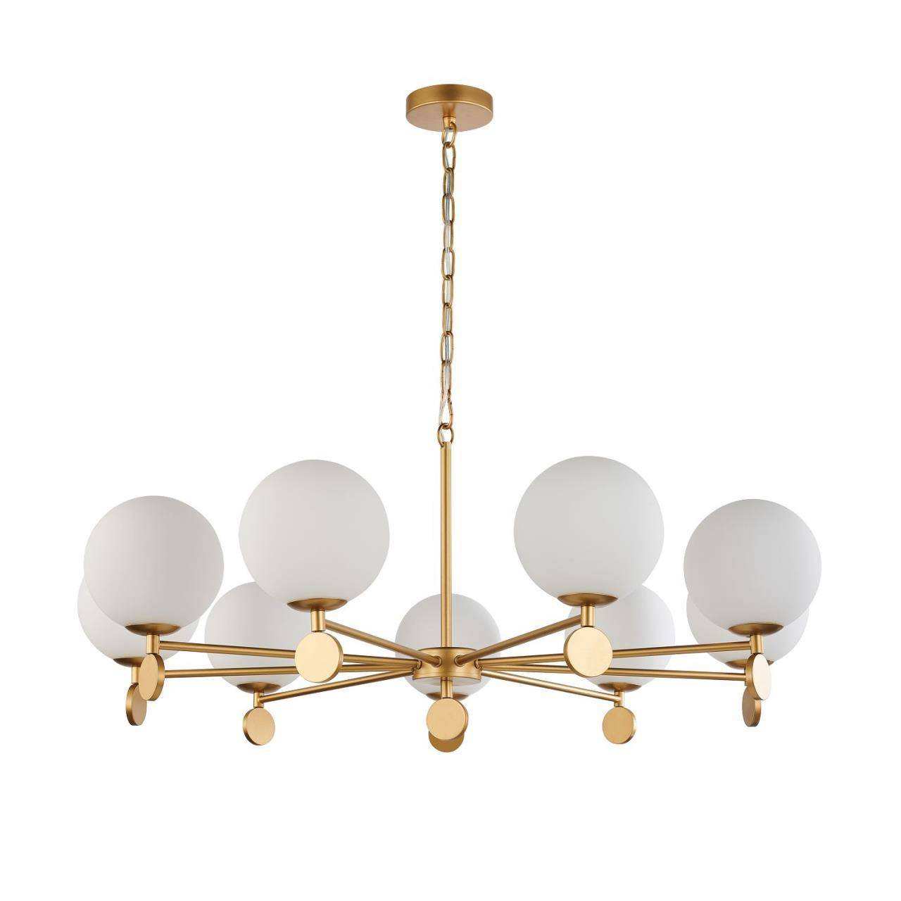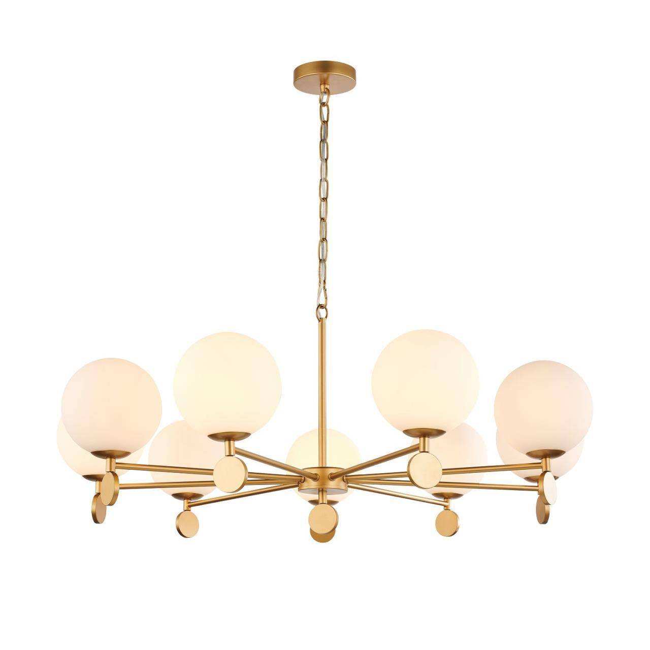 Каркас золотого цвета, плафоны из стекла цвета опала, люстру можно монтировать плафонами вверх или вниз